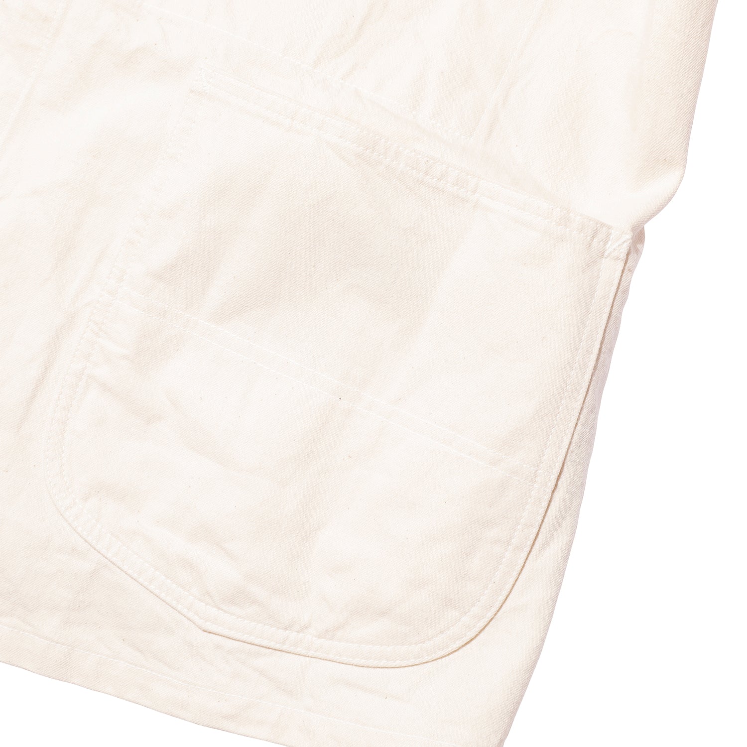 このカバーオールには、経糸に3種類の太さの糸を使用し、経糸・緯糸ともにロープ染色で染め上げた左綾織りの生地を採用しています。さらに、弊社が所有するヴィンテージからサンプリングしたWABASHストライプを抜染プリントで再現し、ヴィンテージ感溢れる生地に仕上げました。ストライプのピッチやドットの大きさなど、ヴィンテージのディテールを忠実に再現し、他にはないオリジナリティのある素材となっています。