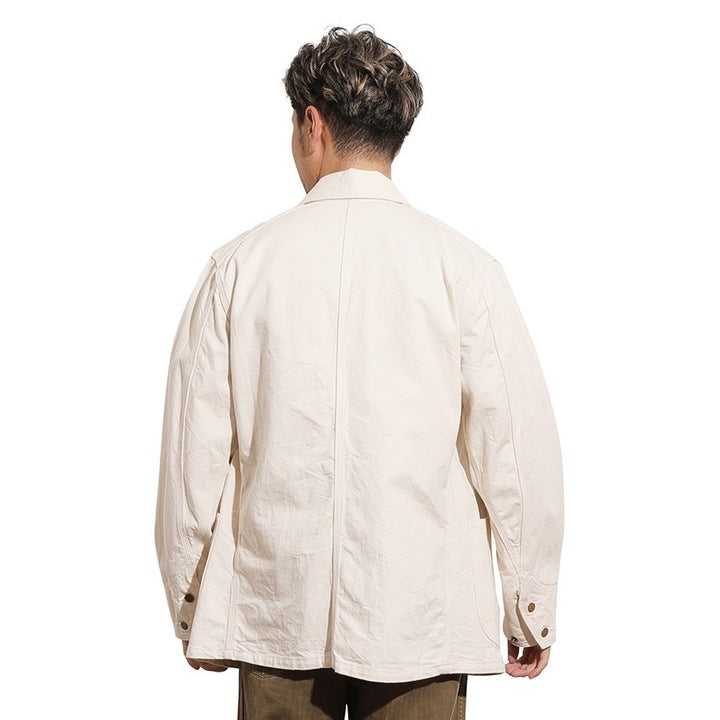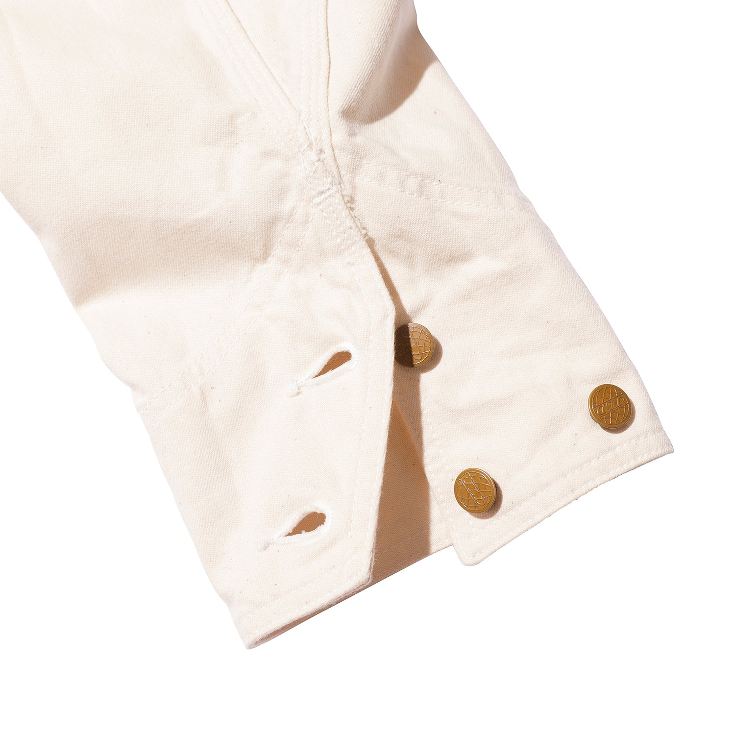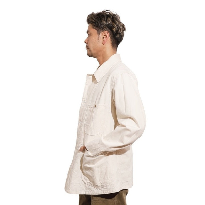 裏面には、顔料プリントでオリジナル生地の証明を施し、深みのある質感を演出しました。ボタンには鉄製のオリジナルチェンジボタンを使用し、袖には当時の雰囲気に合わせたドーナツ型の打ち込みボタンを採用しています。以前の製作時よりも全体的に分量を多く取り、少しゆとりのあるサイズフィットを目指しました。その結果、当時の労働着の雰囲気と生地との相性が良く、よりヴィンテージ感のある仕上がりとなっています。このカバーオールは、SWEETORR特有のウォッチポケットや大きめのパッチポケットなど、見どころ‵満載のデザインで、ヴィンテージファンにはたまらないアイテムです。
