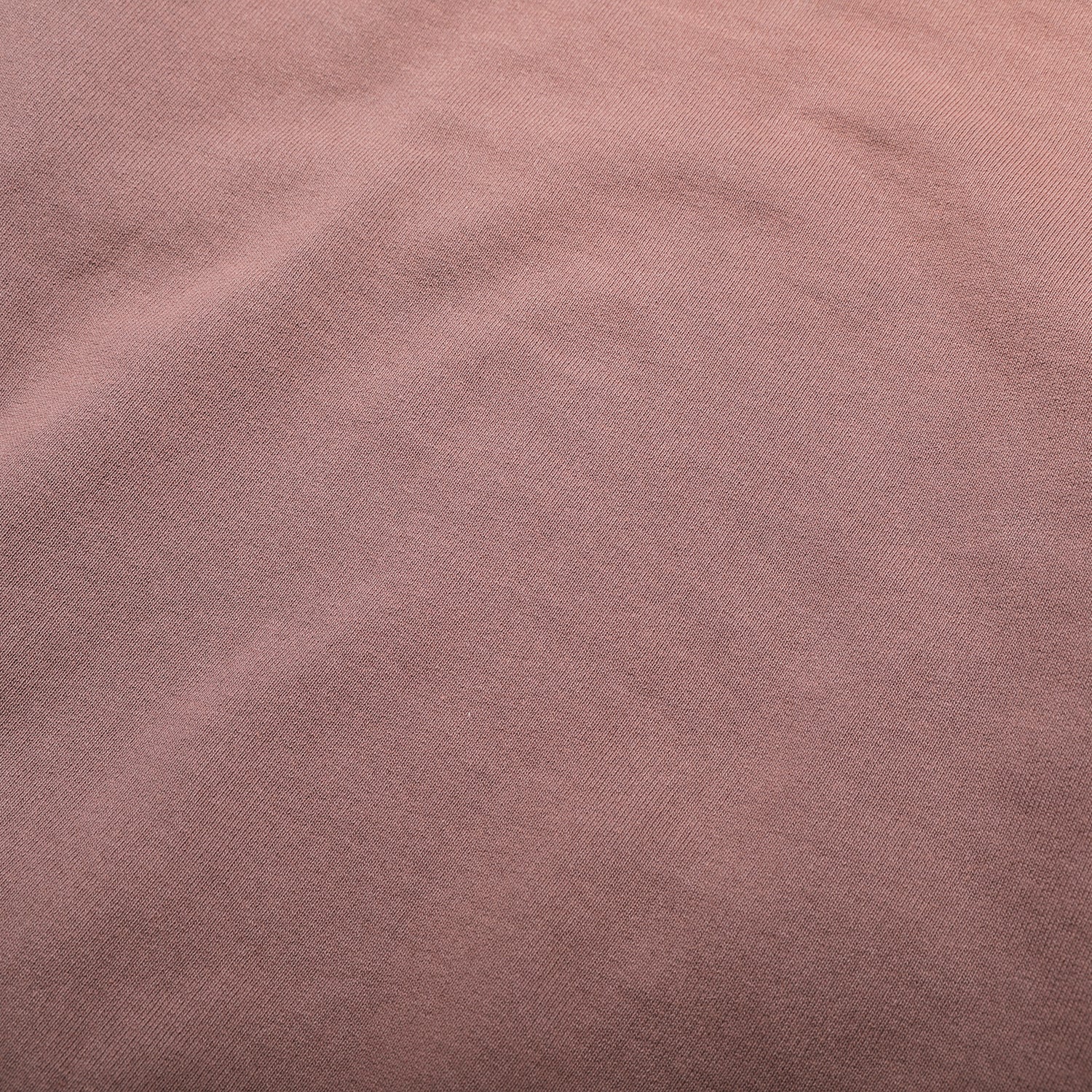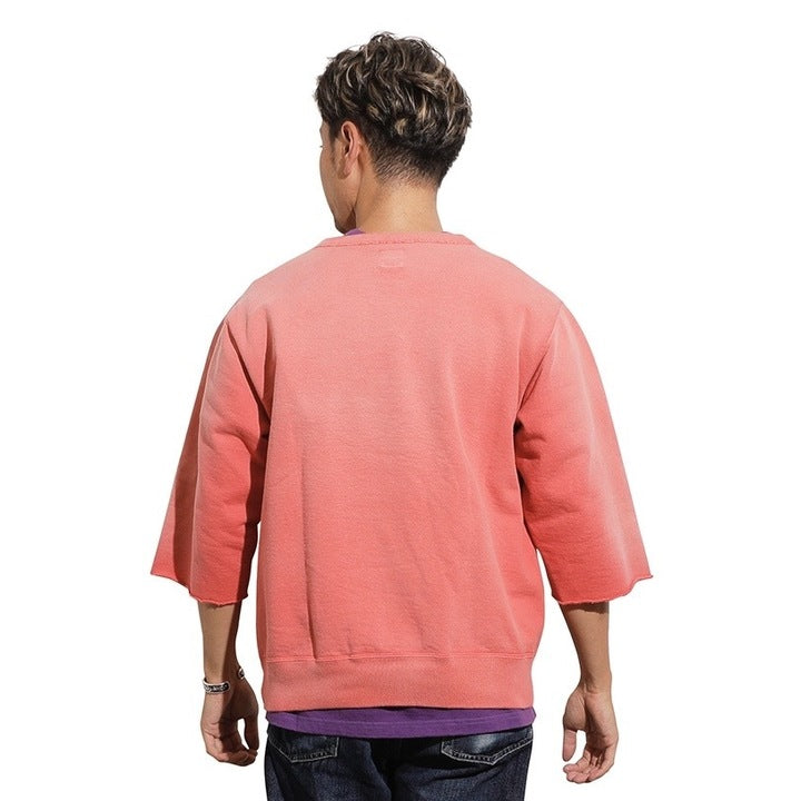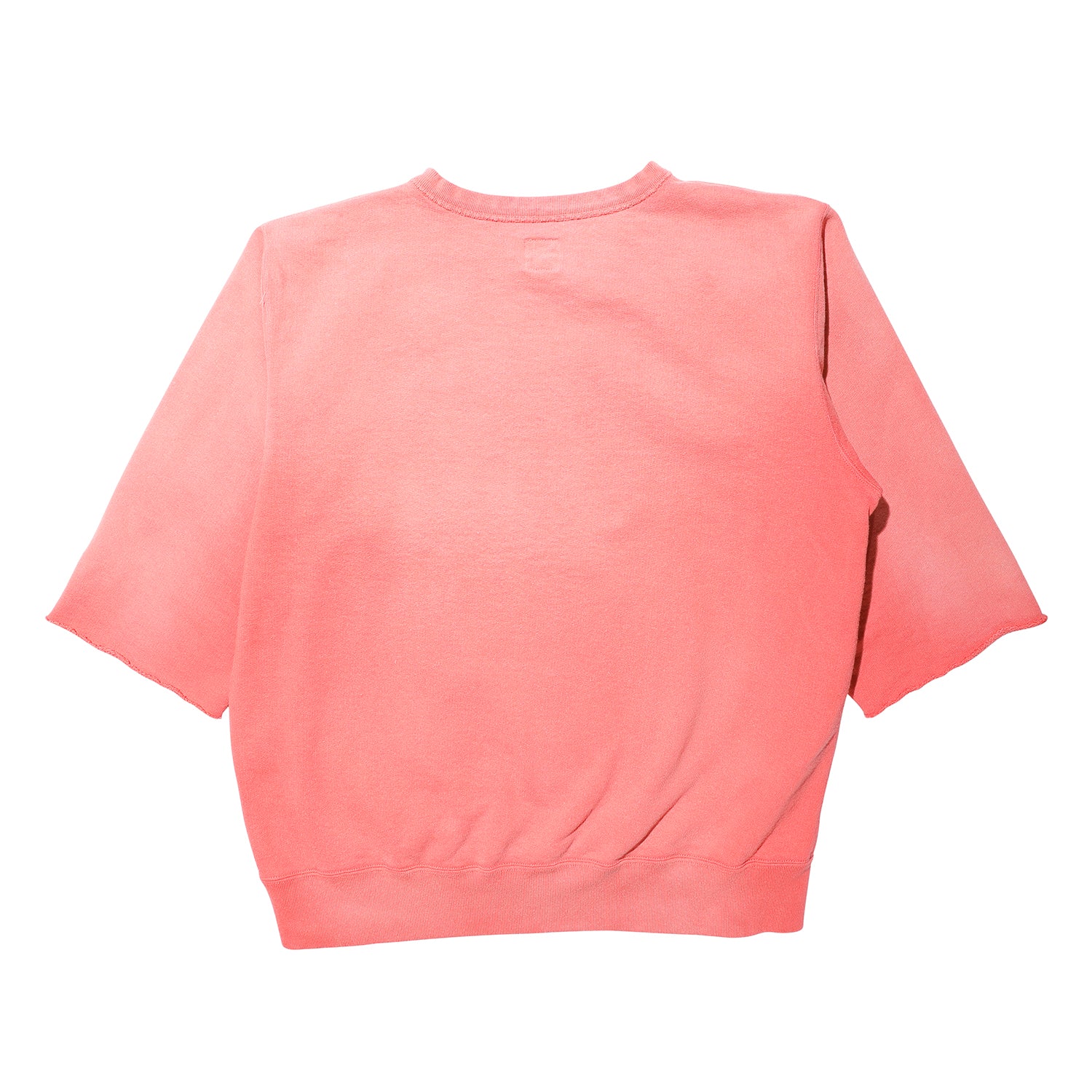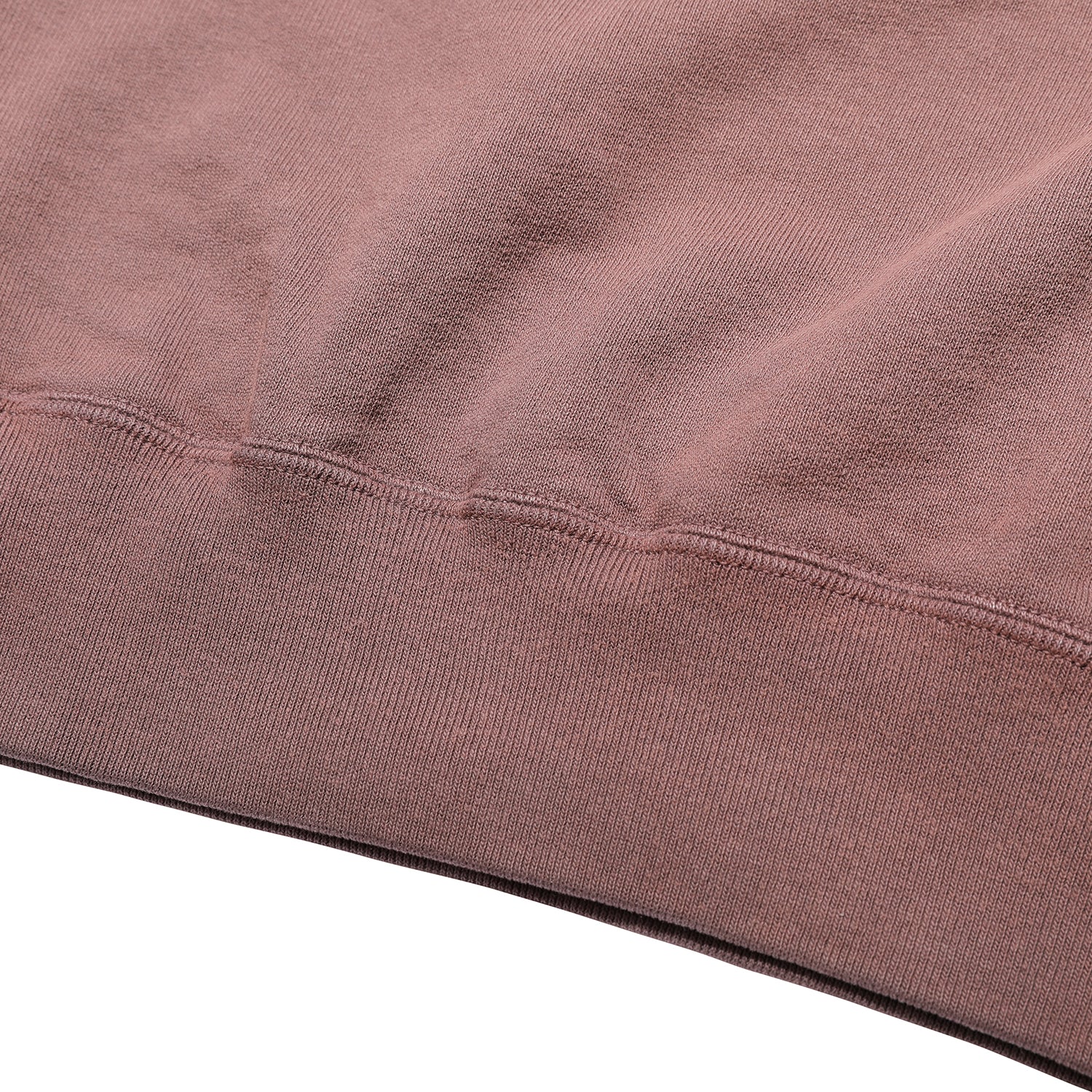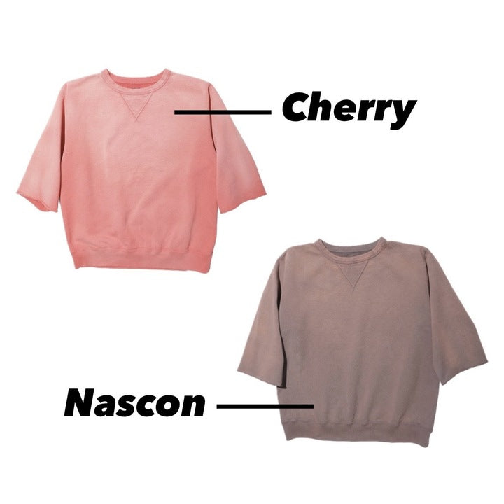 チェリーとNASUKONの配色では、ワインレッドが退色してピンクに振れる色味を、NASUKONは濃いネイビーが何十年も洗われ日に当たり退色した雰囲気を表現しています。白のスウェットを製品染めした後、ウォッシュ加工や職人による塗装・擦り加工を加え、一枚一枚丁寧にヴィンテージ感を再現しました。ボディデザインは、1960年代のスウェットに見られるV字ガセットがないスタイルをベースに製作。前Vのないデザインにも関わらず、二本針縫製で丁寧に仕立てています。さらに、ヴィンテージアイテムから着想を得て、7分袖のカットオフスウェットとしてアレンジしました。