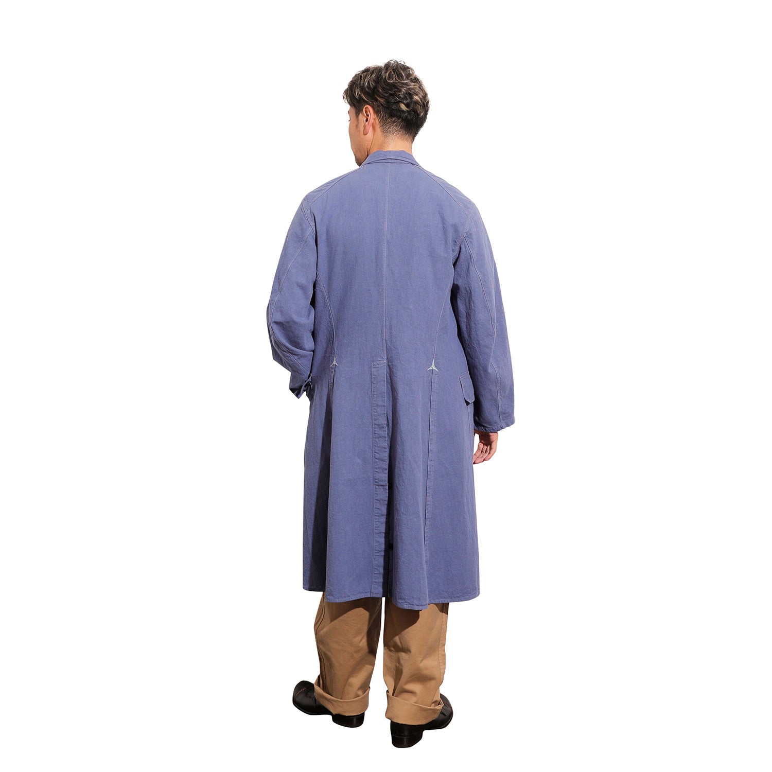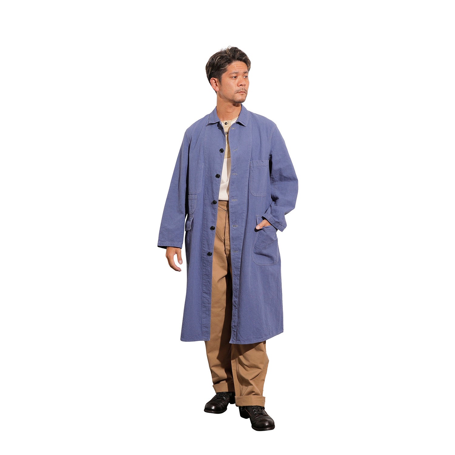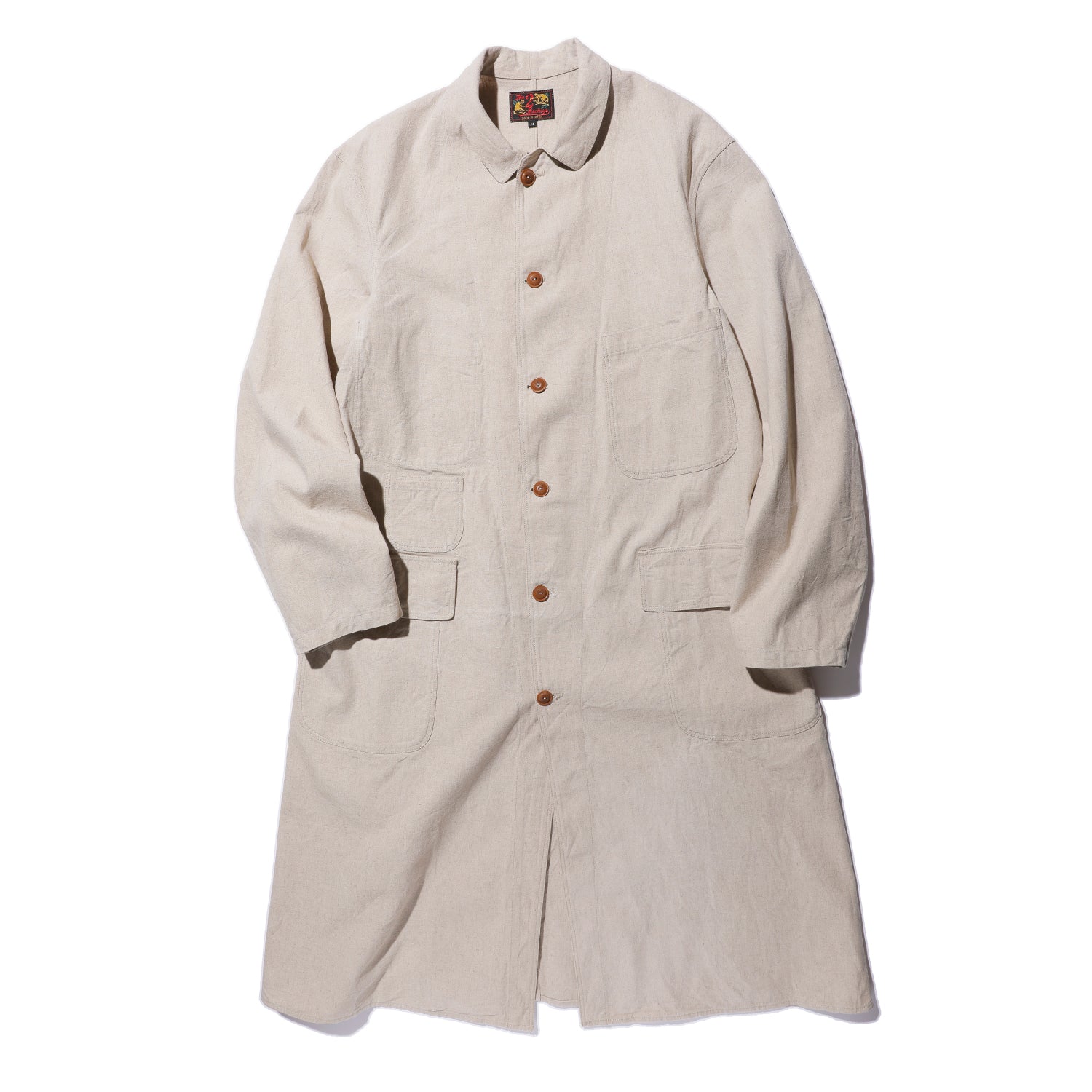 1910年。アメリカでの自動車の世帯普及率はわずか 2%でした。大衆の足は主に、馬車、馬、自転車で、自動車は一部の富裕層だけが所有できるものだった時代です。19世紀末から馬や馬車に乗る時に埃よけに着ていた、ダスターコートが流行したのがこの頃です。当時の自動車は、ドアもない完全なコンバーチブルだったため、運転中はタイヤが土埃を舞い上げます。服が埃まみれになるのを防ぐダスターコートは、自動車を運転できる富裕層のステータスシンボルだったのかもしれません。当時のダスターコートは、主に薄手の生成リネンまたはコットン製の丈の長いコートです。The 2 Monkeys のダスターコートは、鈴木が所有
