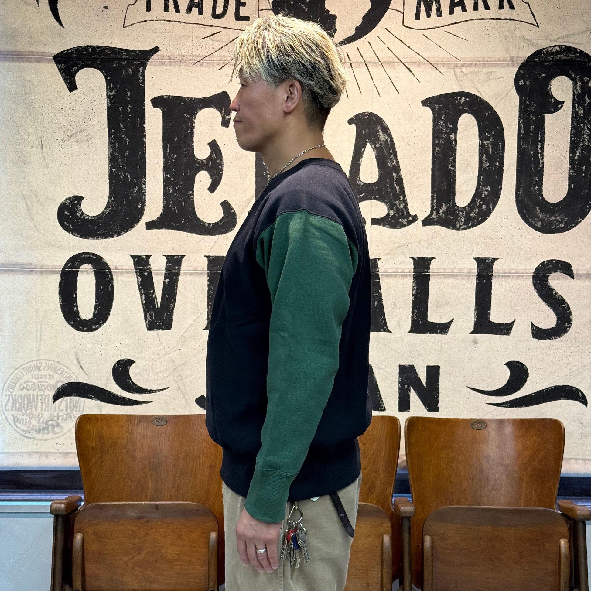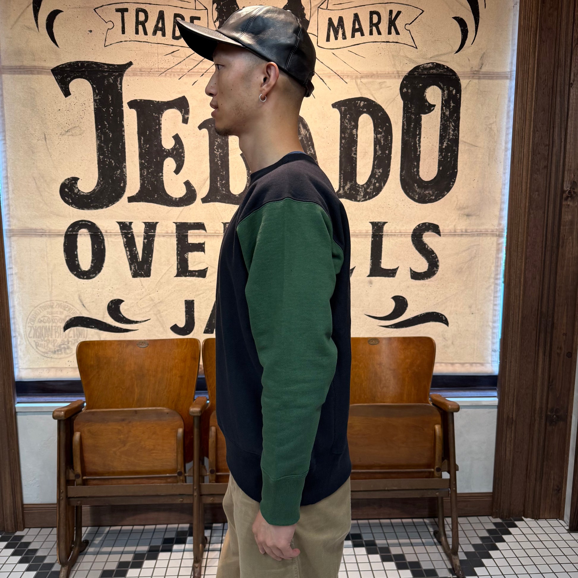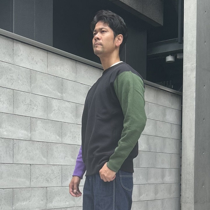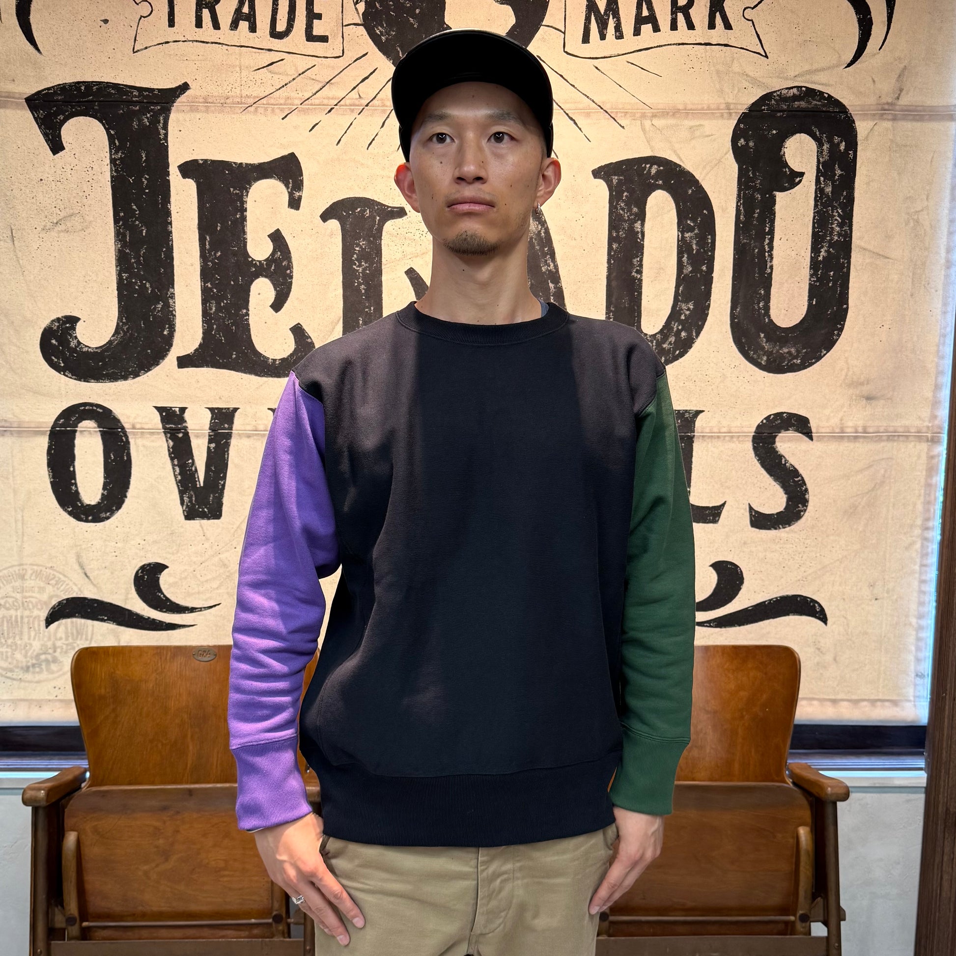 2025年のコレクションテーマ「THE CREAM OF THE CACHE」は、「最上のコレクション」を意味する造語。JELADO秘蔵のヴィンテージアイテムを再現する試みです。その一環で登場した「CRAZY UP」は、3色を使ったクレイジーパターンを採用し、ヴィンテージスウェットのユニークなデザインを再現しました。素材には綿100%の米綿混空紡糸を使用。表糸14番手、中糸20番手(右撚り)、裏糸10番手で編み立て、編み機パーツを改造して裏糸のボリューム感を追求しました。編み機はオリジナルの12Gを採用し、専用開発した針を使用。米式起毛機で加工した裏毛起毛や、脱脂加工で再現した「乾いた」生地感がヴィンテージの雰囲気を引き立てています。脇パネルはヴィンテージ仕様のフラットシーマで縫製。堅い生地を丁寧に仕上げるため、熟練工場との連携で高いクオリティを実現しました。サイズはM、L、XL、さらにゆったり着られる50サイズの4展開となります。ヴィンテージの魅力と現代の着やすさを兼ね備えた「CRAZY UP」をぜひお試しください。