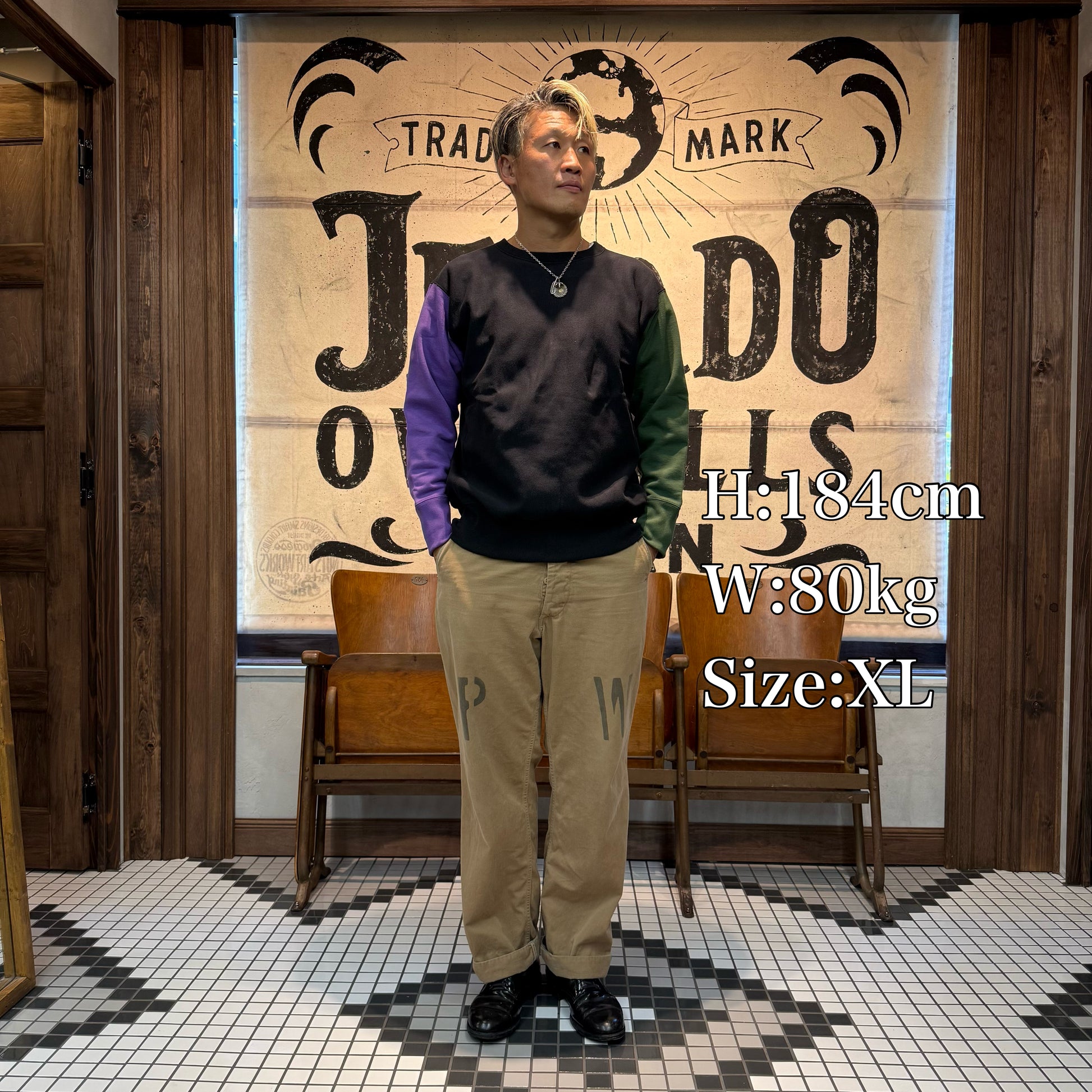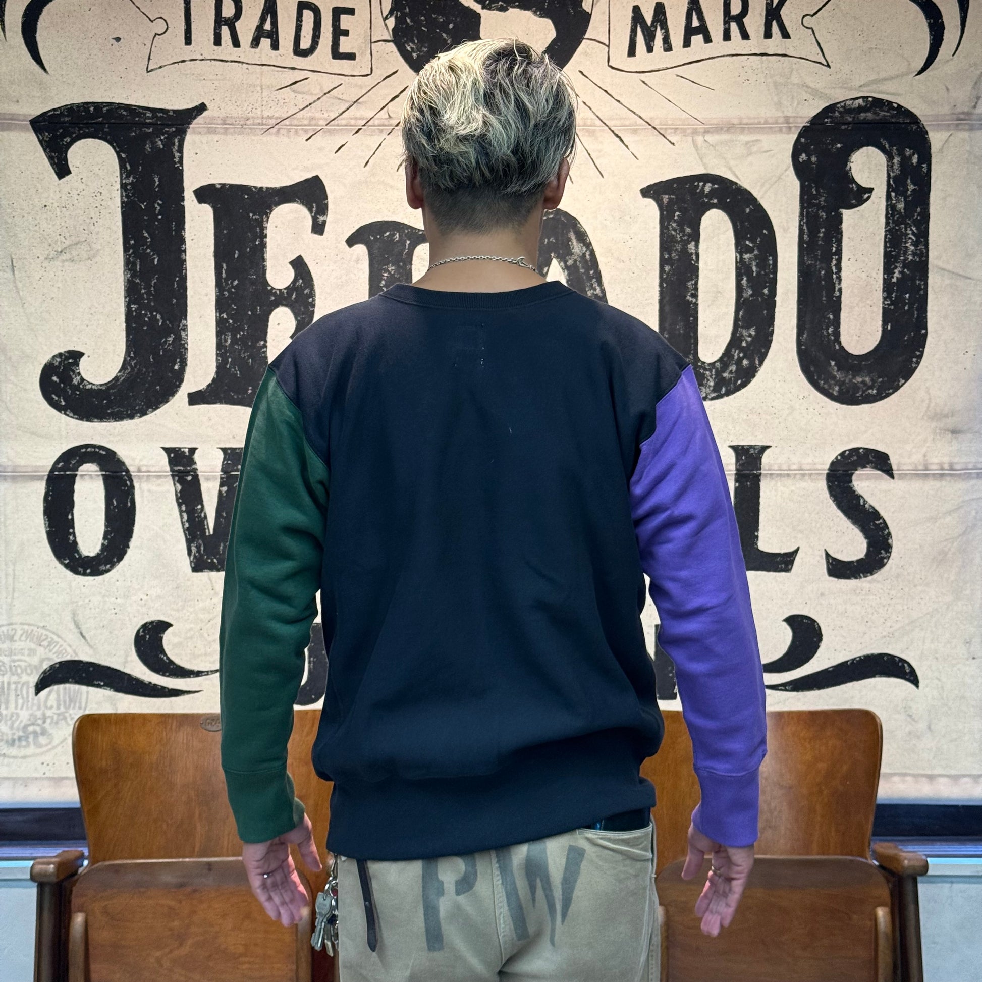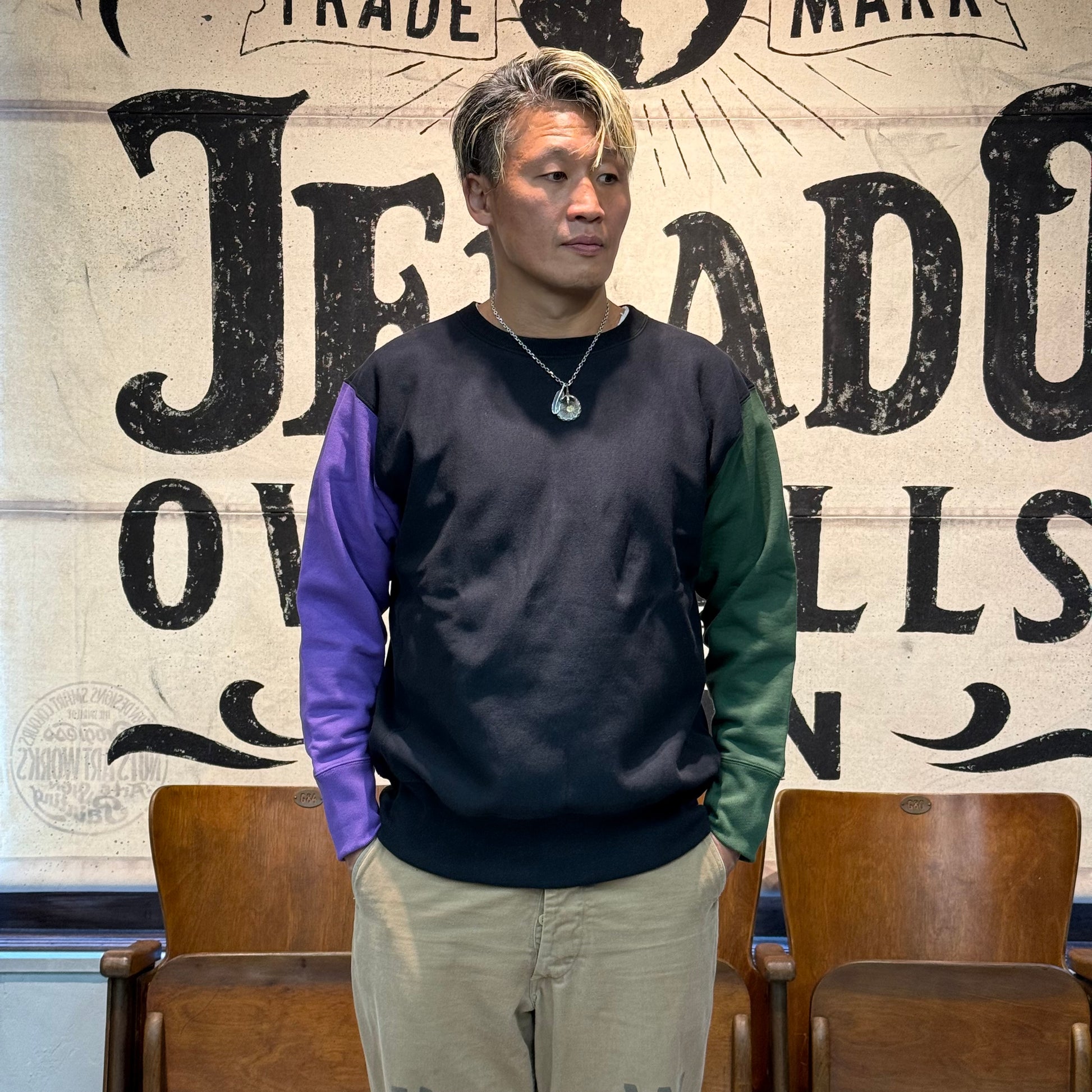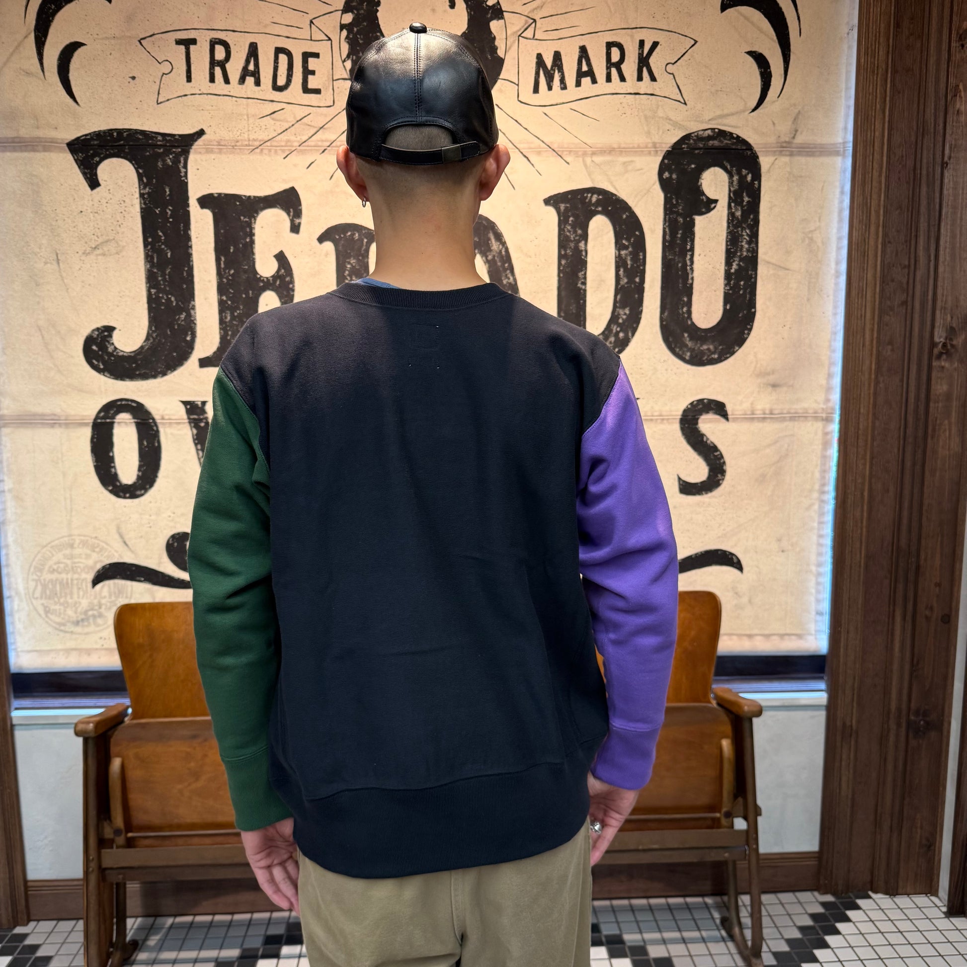 2025年のコレクションテーマ「THE CREAM OF THE CACHE」は、「最上のコレクション」を意味する造語。JELADO秘蔵のヴィンテージアイテムを再現する試みです。その一環で登場した「CRAZY UP」は、3色を使ったクレイジーパターンを採用し、ヴィンテージスウェットのユニークなデザインを再現しました。素材には綿100%の米綿混空紡糸を使用。表糸14番手、中糸20番手(右撚り)、裏糸10番手で編み立て、編み機パーツを改造して裏糸のボリューム感を追求しました。編み機はオリジナルの12Gを採用し、専用開発した針を使用。米式起毛機で加工した裏毛起毛や、脱脂加工で再現した「乾いた」生地感がヴィンテージの雰囲気を引き立てています。脇パネルはヴィンテージ仕様のフラットシーマで縫製。堅い生地を丁寧に仕上げるため、熟練工場との連携で高いクオリティを実現しました。サイズはM、L、XL、さらにゆったり着られる50サイズの4展開となります。ヴィンテージの魅力と現代の着やすさを兼ね備えた「CRAZY UP」をぜひお試しください。
