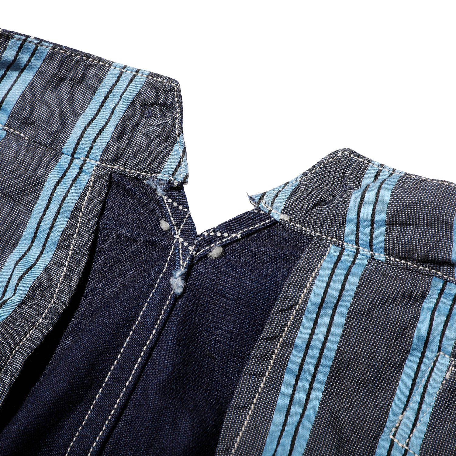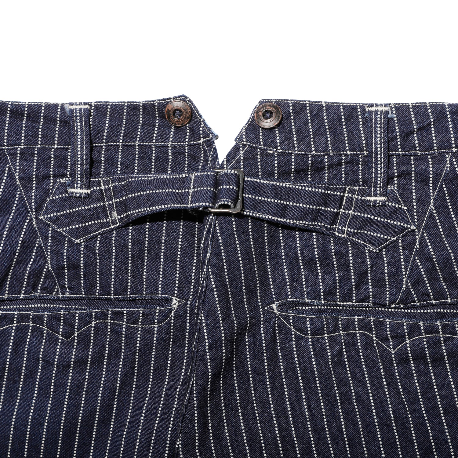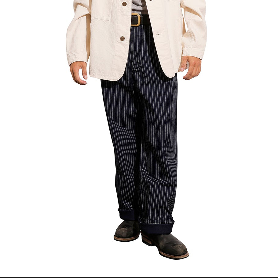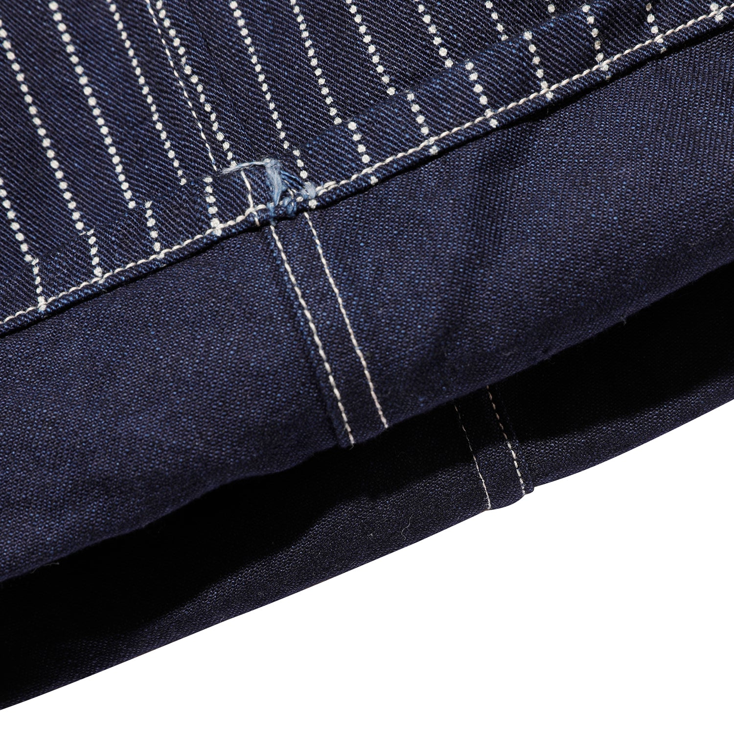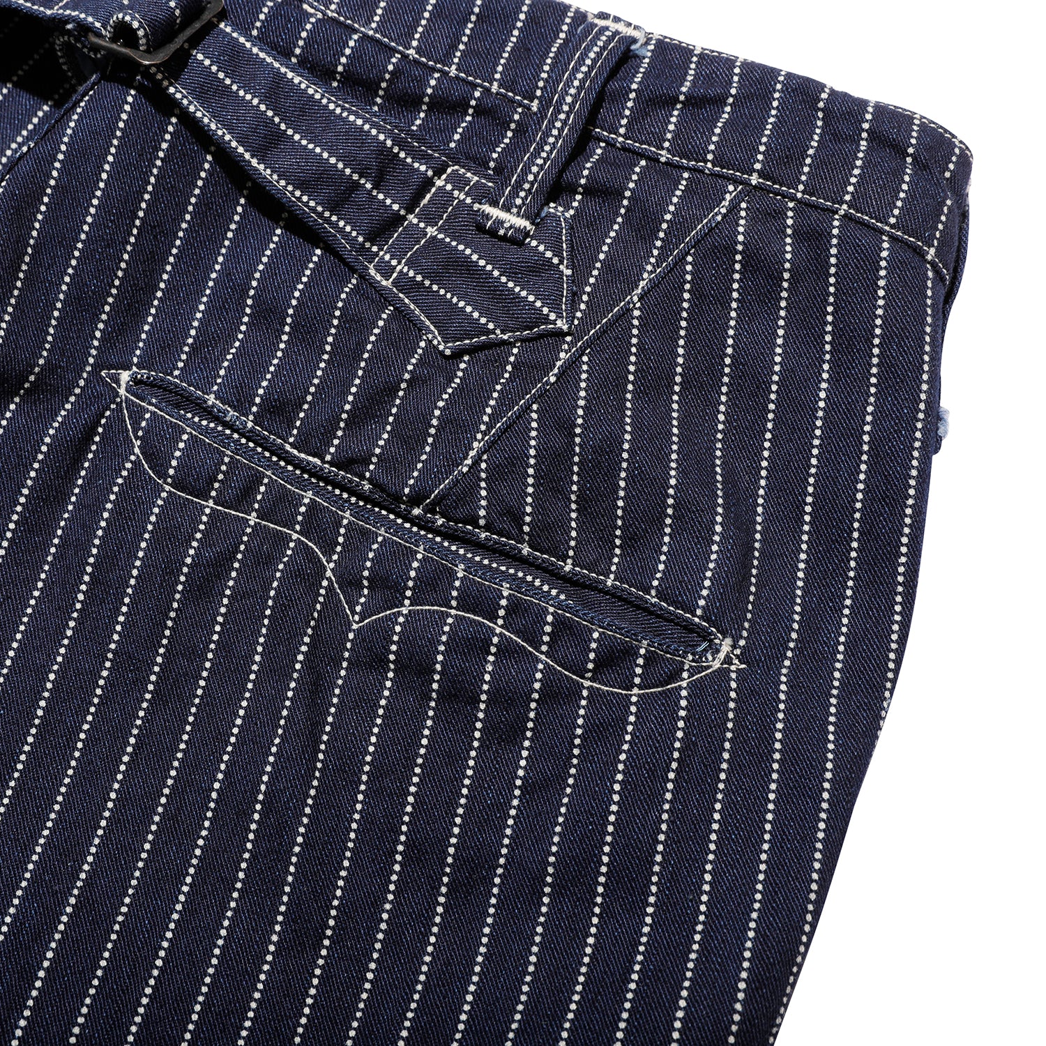 ポケットは強度を意識した本縫いの抑えステッチ入りで、古いワークパンツのディテールを再現。本来はベルトループがない時代のデザインですが、現代的な着用感を考慮して追加し、こちらも本縫いでしっかり仕上げています。ウエストやフラップポケットの裏、バックルバック裏、フロントボタン裏には補強の別布を貼り合わせ、使用とともに現れる褪色や風合いの変化も楽しめます。ポケットの袋布には当時を踏襲した縞スレーキを採用し、ヴィンテージらしさをさらに引き立てています。