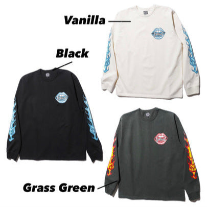 フロントにはシンプルなモンスタープリントをワンポイントで施し、フレイム柄の袖が特徴的な、西海岸テイストの少しワイルドなロンTです。