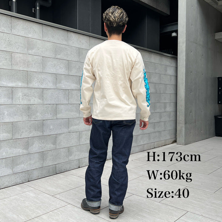 このロンTのボディには、20/2スーパー度詰め天竺という非常に頑丈な素材を使用しています。この素材は、昨年Tシャツとして復活したもので、長期間着用しても形崩れせず、その耐久性が高く評価されています。今回は新たにこの素材を用いて、ロングスリーブTシャツを製作しました。袖口にはリブを採用し、一枚で着用してもシルエットが崩れず、しっかりとしたフィット感を実現。これにより、どんな体型の方でも自信を持って着こなしていただけます。他にはないスーパーヘビーなTシャツであり、その堅牢な素材とユニークなデザインは、どんなシーンにもマッチします。ファッションのアクセントとして、一枚で着こなすことも、レイヤードスタイルに取り入れることもできる、非常におすすめのアイテムです。ぜひ、この「FLAME SLEEVE TEE」で新しいスタイルを楽しんでください。