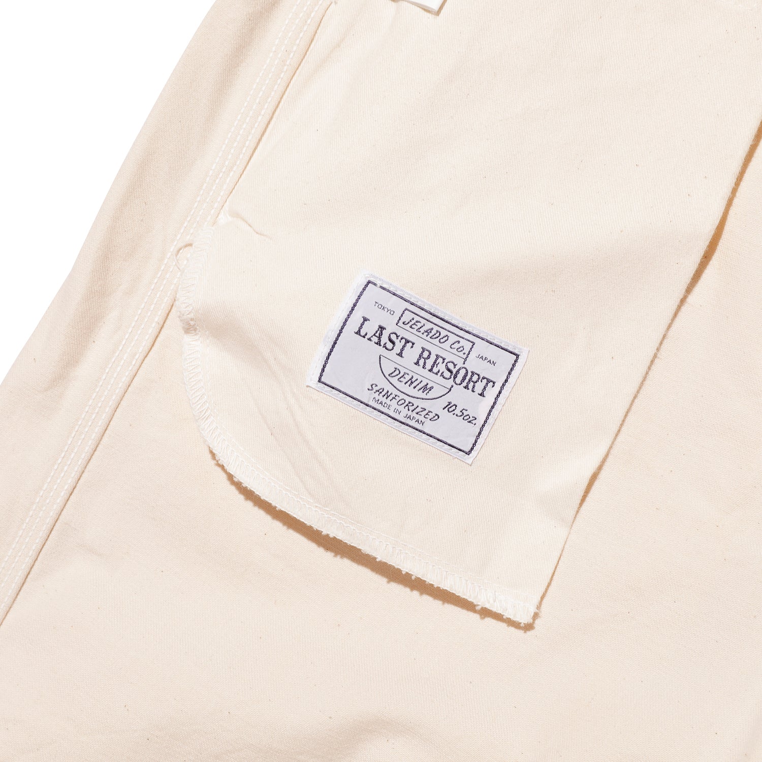 LASTRESORT“青タグ”と名付けた10.5オンスのライトオンスデニムを開発し、1940年代のペインターパンツを忠実に再現しました。当時多くのワークウェアで使用されていた生成りのカバーオールをベースに、青タグならではの素材感で表現しています。このデニムは、40年代のLEEカバーオールを実際に解体し、糸を分析したうえでヴィンテージ特有の色落ちや風合いを徹底的に研究。その結果、当時のデニムが持つ自然なタテ落ち感を再現した生地が完成しました。この特別な生地を用い、40年代のハウスマークのペインターパンツを現代に蘇らせています。LEEワークパンツの象徴ともいえる、ポケット底の中央に少し余裕を持たせたデザインや、無駄のない直線的な縫製はもちろん健在。経糸には3種類の番手のムラ糸をランダムに織り込むことで、穿き込むほどに豊かな表情が浮かび上がります。右バックポケット裏にはユニオンチケットを縫い付け、細部のディテールにも妥協なし。さらにフロントボタンにはヴィンテージさを引き立てるドーム状の足を採用し、リアルな雰囲気を演出しました。生地、付属品、縫製すべてにこだわり抜いた、究極のペインターパンツをぜひ体感してください。