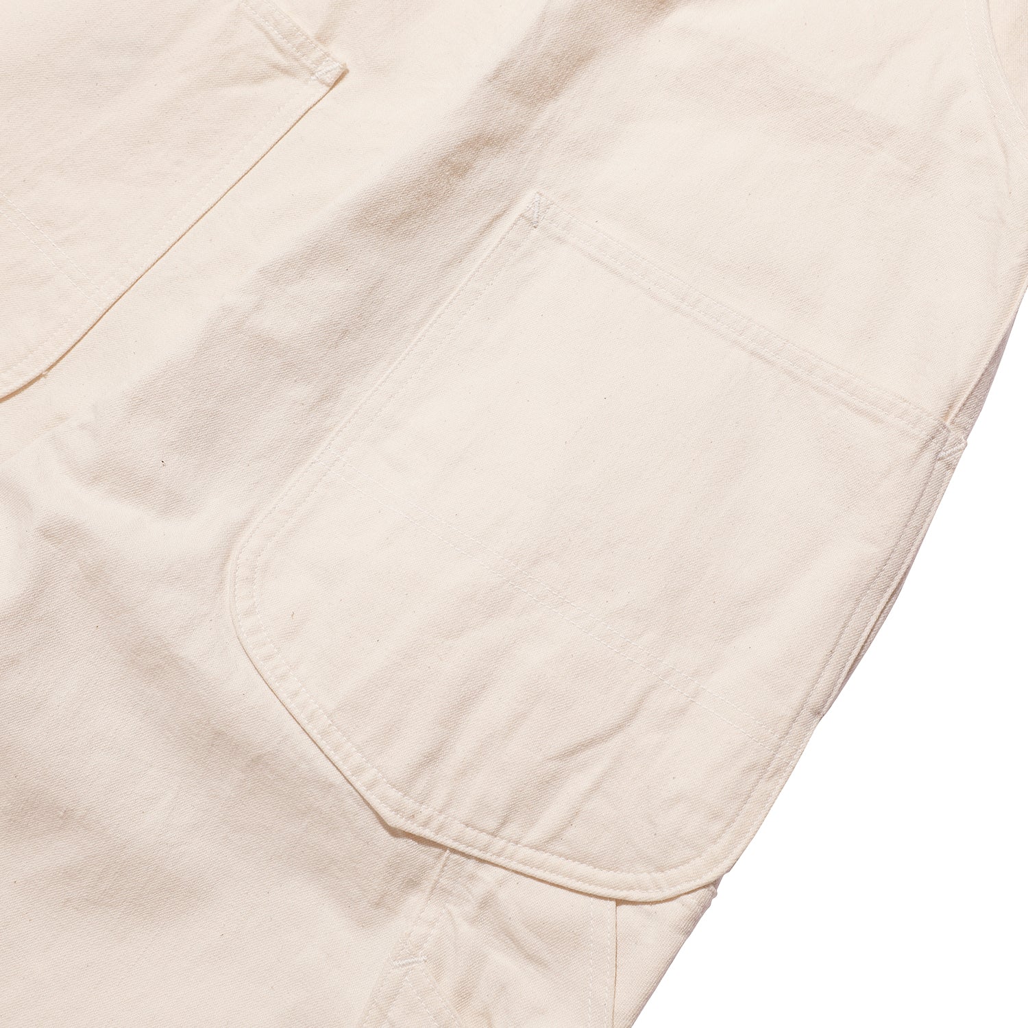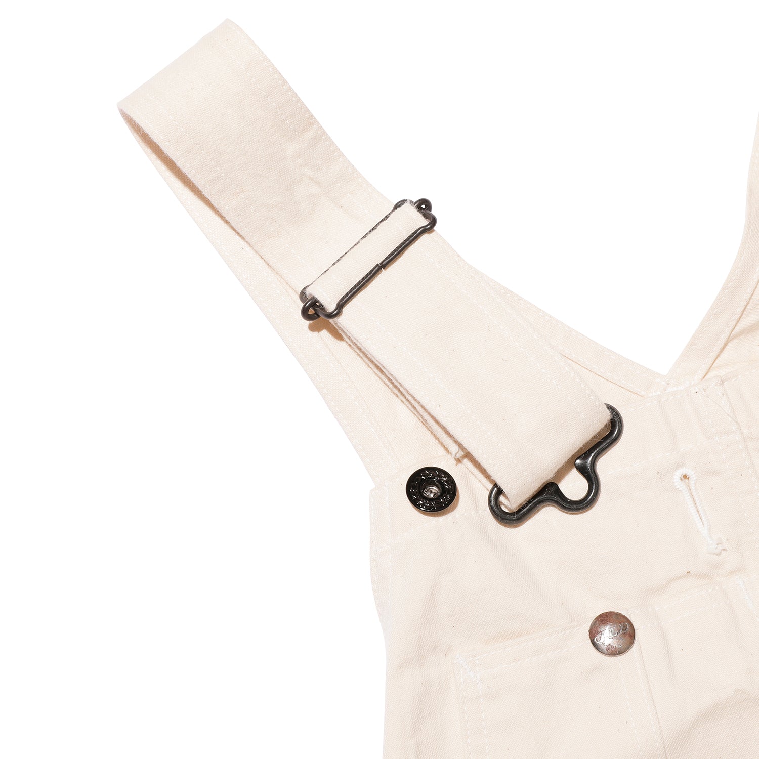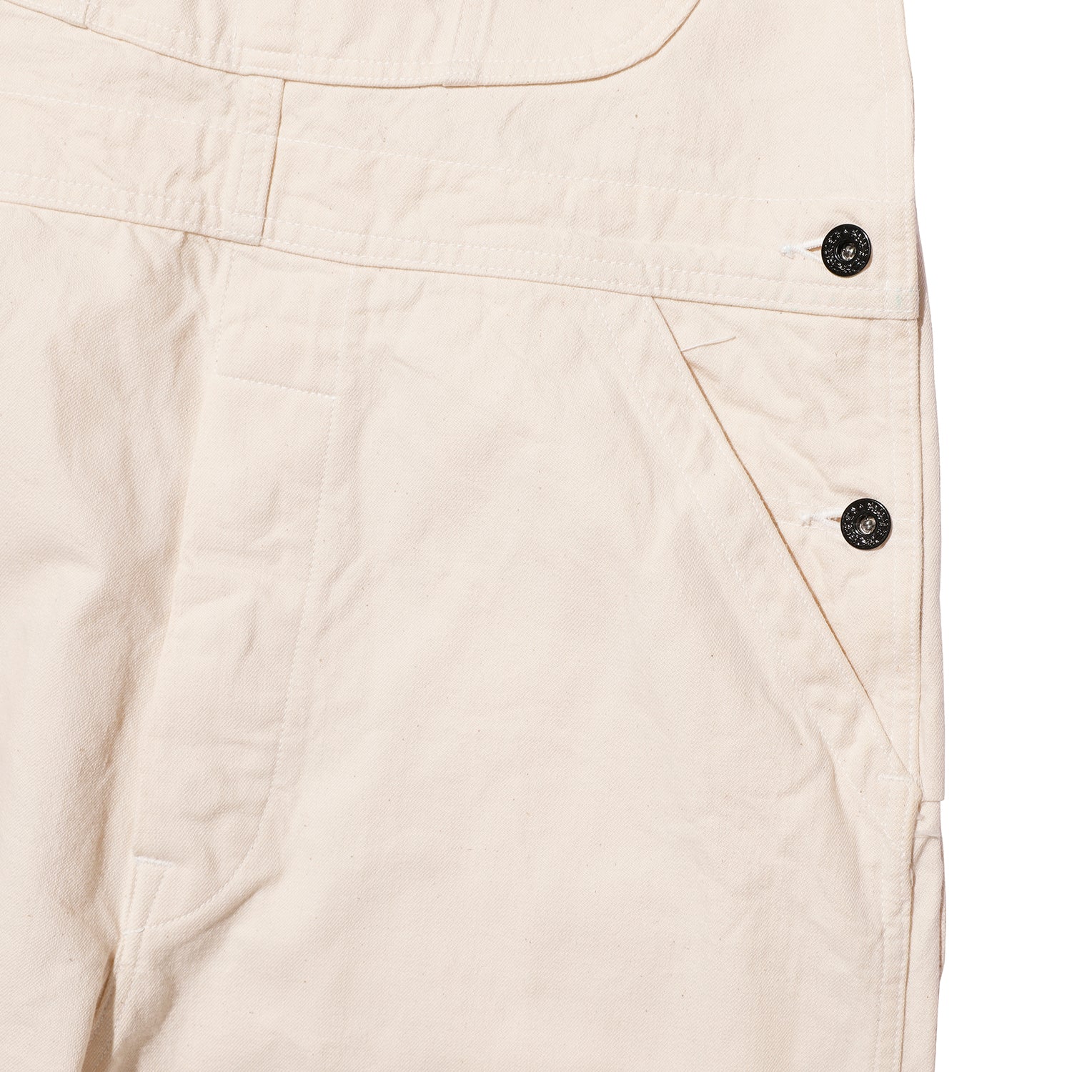 「LASTRESORT青タグ」と名付けた10.5オンスのライトオンスデニムを使用し、大戦期のオーバーオールを再現しました。このデニムは40年代のLEEカバーオールを解体し、糸の分析を行ったうえで、当時のヴィンテージデニム特有のタテ落ち感を現代に蘇らせることを目指して開発したものです。今回は初めて、タテ糸・ヨコ糸ともに染めない生成りバージョンを展開。3種類の異なるムラ形状をもつ糸をランダムに打ち込むことで、単色ながらも奥行きのある表情を楽しめます。大戦期に生産されたハウスマークのオーバーオールのデッドストックに付属していたアクセサリー類も忠実に再現。ネームやフラッシャーに至るまで細部にこだわり、通常は紙で作られていたフラッシャーを耐久性のある不織布で製作し、洗濯しても破けない仕様にしています。ポケット内のユニオンチケットは一筆縫いで丁寧に縫い付け、肩ひもの長さを調整するアジャスターや留め具のボタン、腰のボタンには月桂樹の鉄ボタンを採用。さらに、ビブポケットを留めるスナップボタンも、このモデルのためだけに特注で鉄製スナップを製作しました。シルエットはワークウェアらしいゆったりとした太めのラインで、当時の雰囲気をしっかりと体感できる一本に仕上げています。