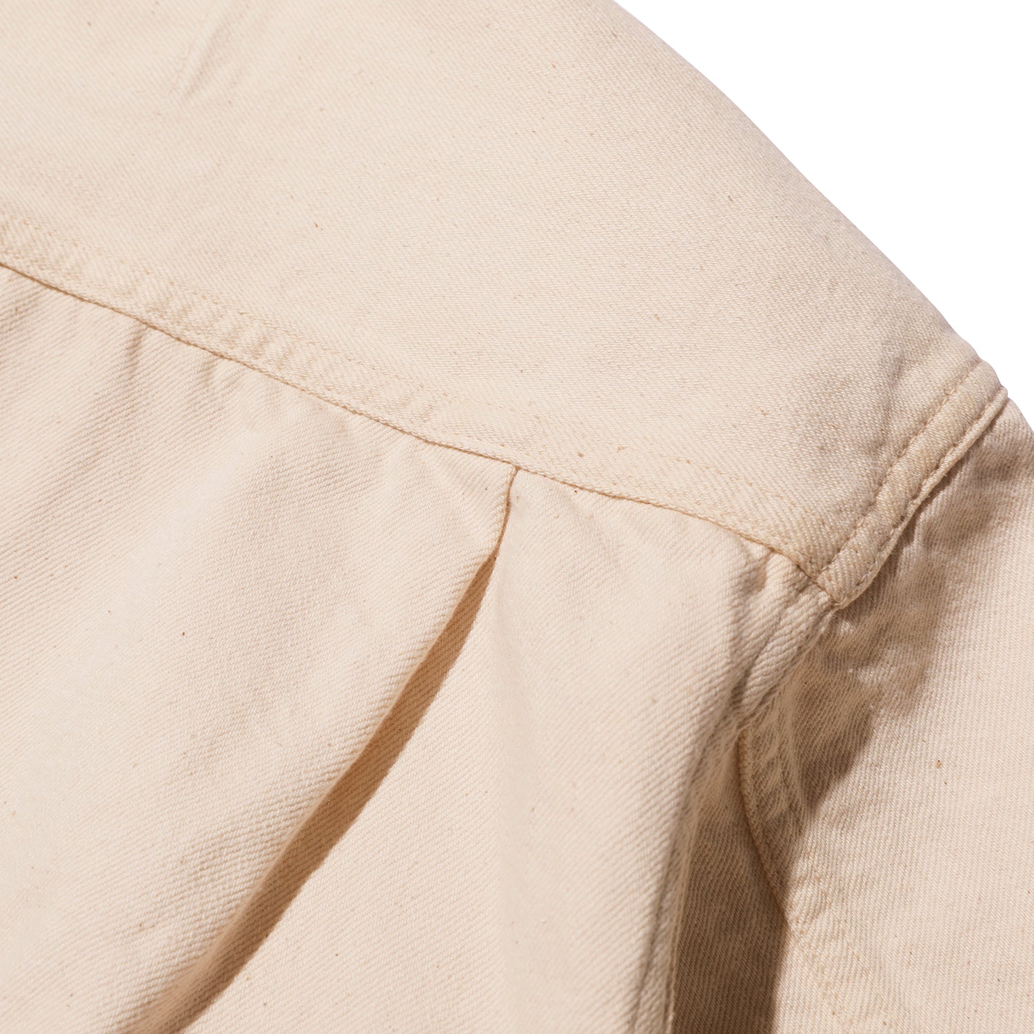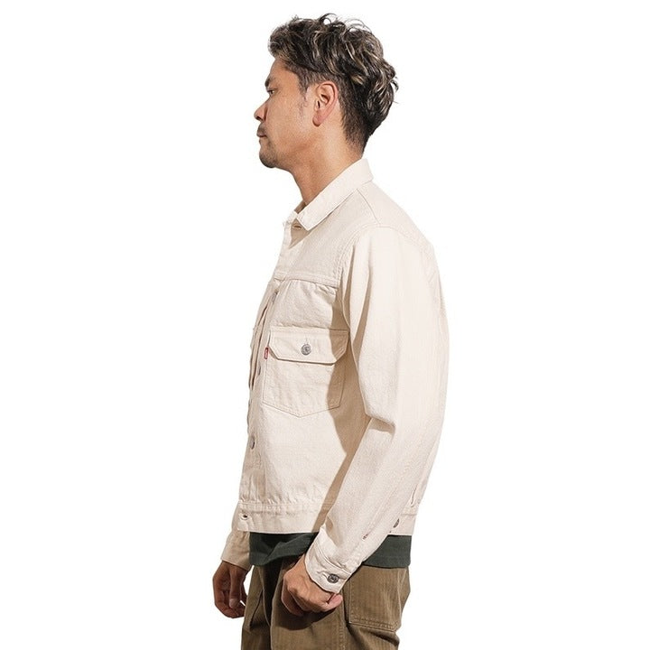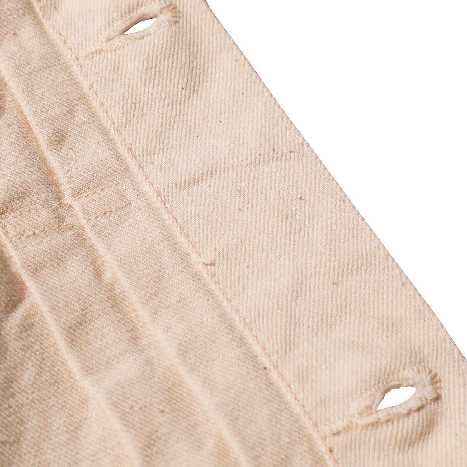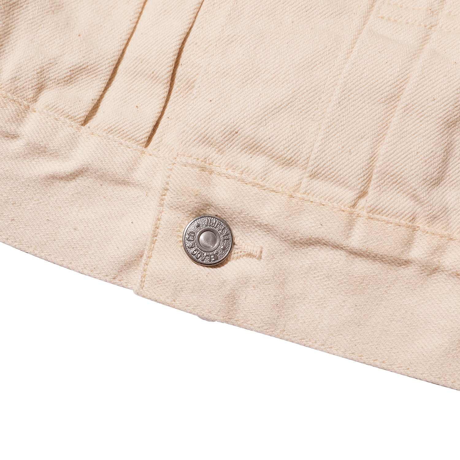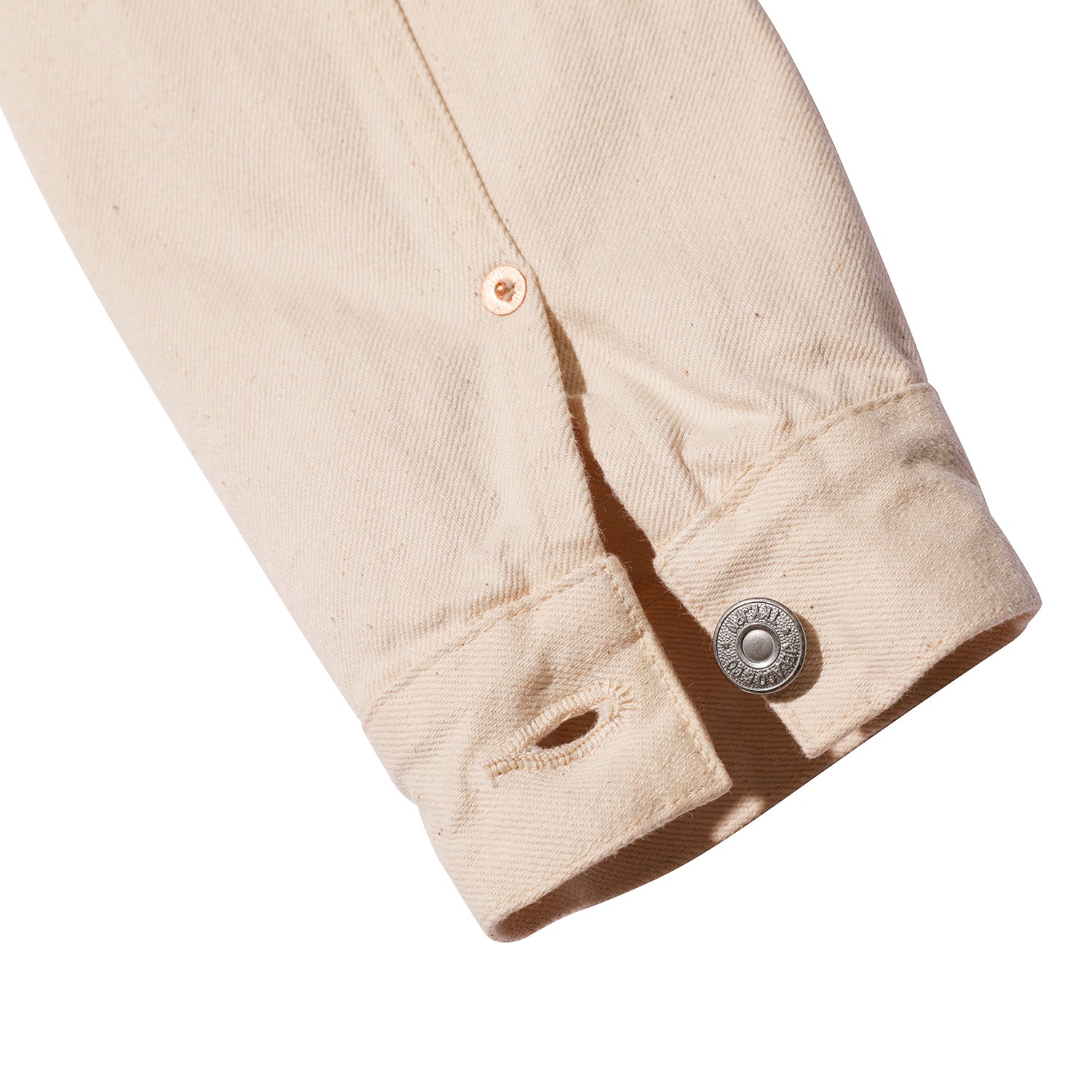 STANDARD COLLECTIONより「406XX VANILLA」をリリースしました。継続して好評いただいているLASTRESORT DENIMの2nd TYPEデニムジャケットを、インディゴ染色を施さない生成りデニムで製作したモデルです。使用したLASTRESORT白タグデニムは、50年代初期のXXデッドストック生地を分解・研究し、米綿から厳選。糸の太さ、繊維長、撚り回数などを科学的に解析し、忠実に再現しました。織りには1950年代のTOYODA G3織機を使用。時間をかけて織り上げることで、ヴィンテージらしい質感を実現しています。このデニムを使ったアイテムにはXX刻印入りのオリジナルネームが付き、紙パッチにはAGE OF LONGINGネームを採用しました。デザインは、ヴィンテージの2nd TYPEジャケットを忠実に復刻。糸色や番手まで当時の仕様に合わせた縫製を行い、細部まで徹底的にこだわっています。フラップ裏にはライトオンスデニムの別布を使用。フロントボタンは鉄製、袖のリベットは銅製オリジナルリベットを採用し、さらにレーヨン製の赤タブが付く本格的な仕様です。シルエットは、インディゴ染色の406XXと同じく程よいサイズ感で、着こなしやすいバランスに仕上がっています。