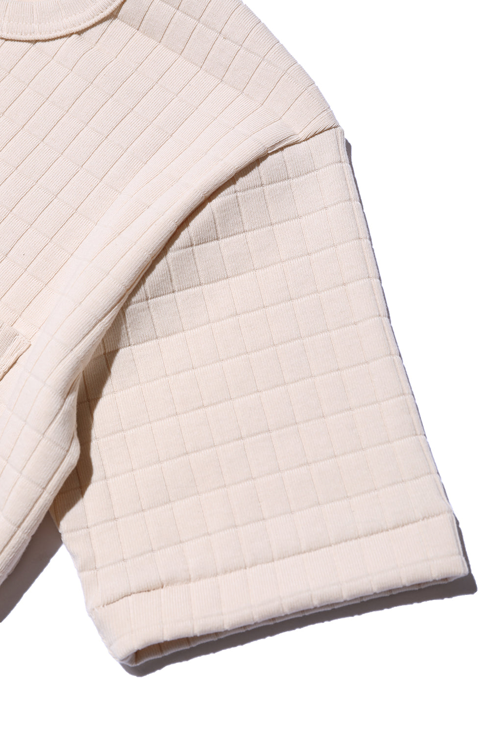 チェックの柄は、針抜きはカットソー素材では難しいとされておりますが、編み機を特殊に改良して編み立てております。