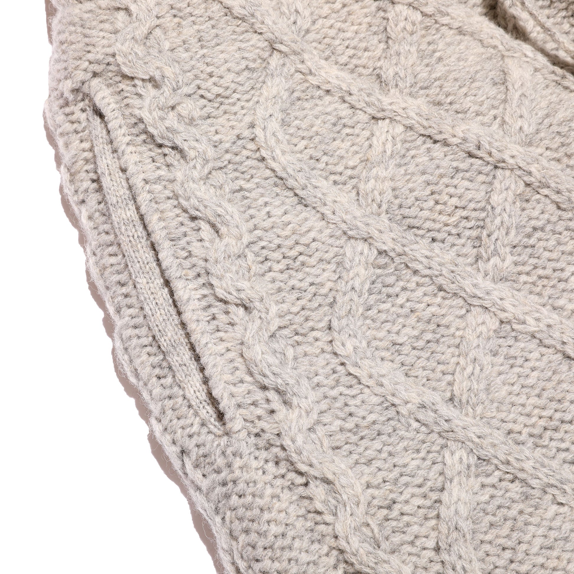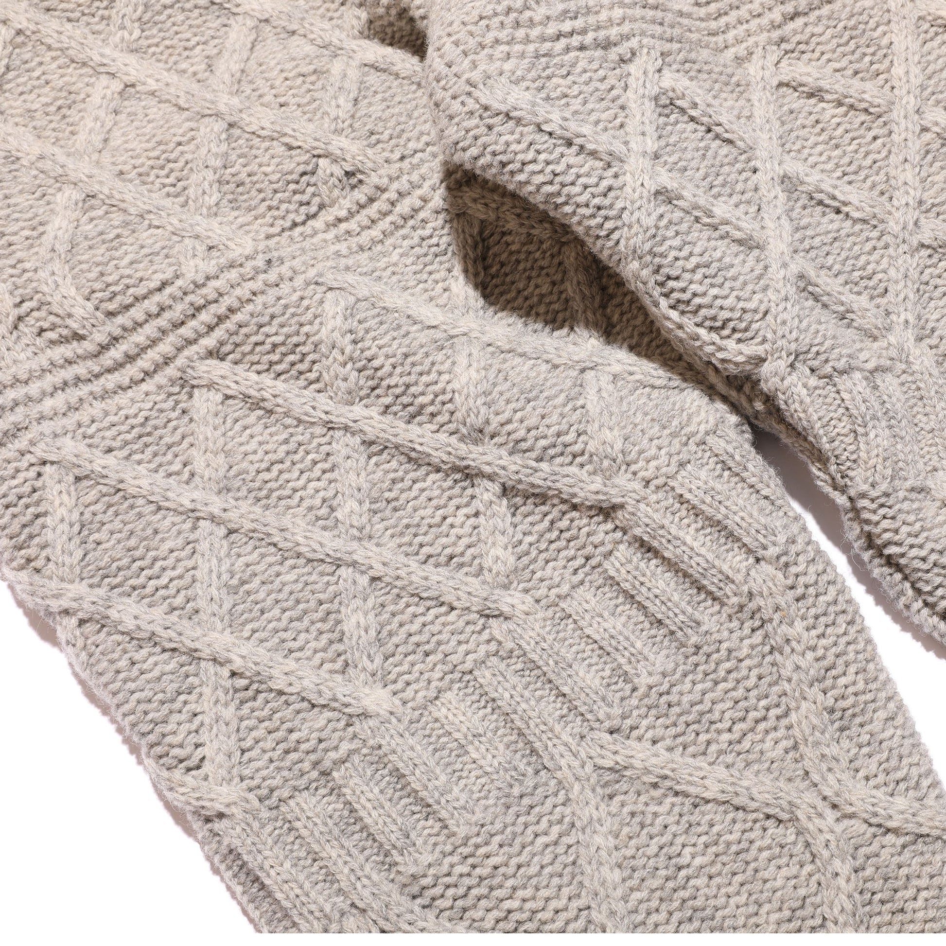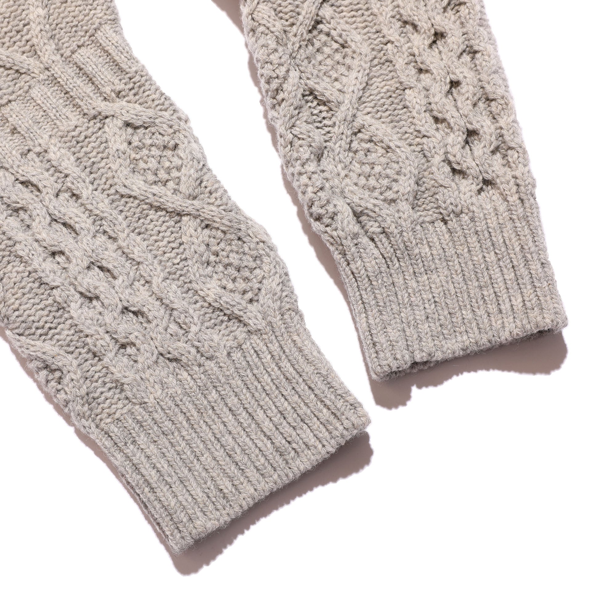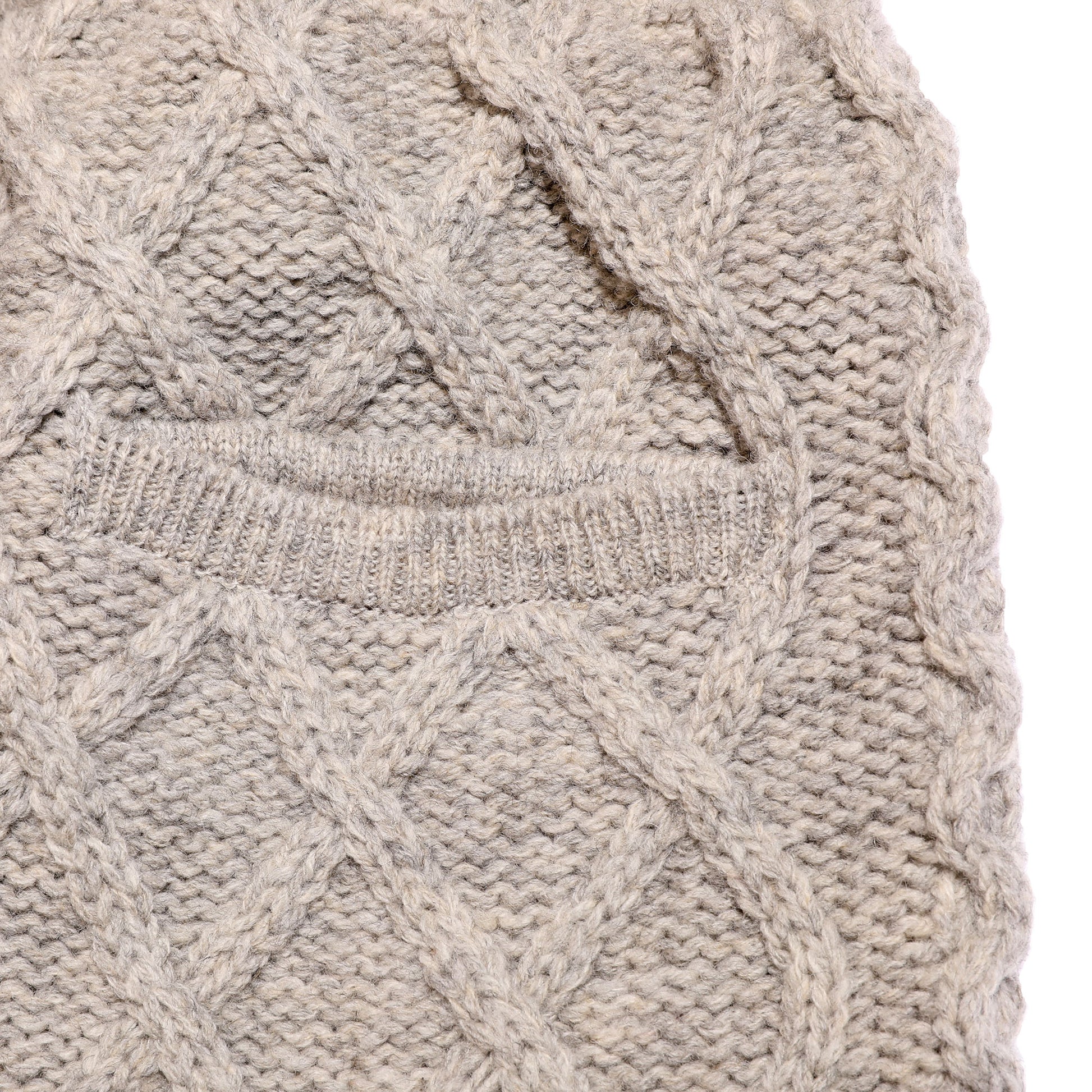 ふっくらとボリューム感のあるメリノウールに英国羊毛をブレンドし、粗野な雰囲気をプラスしたいとに変更して5本撚り3ゲージでヘビーに編み立てました。