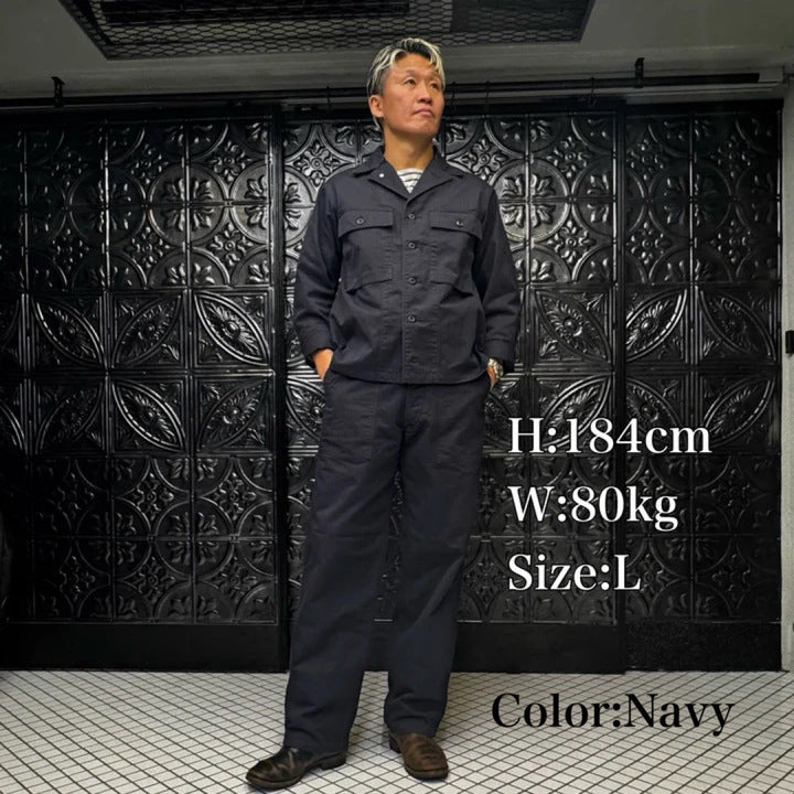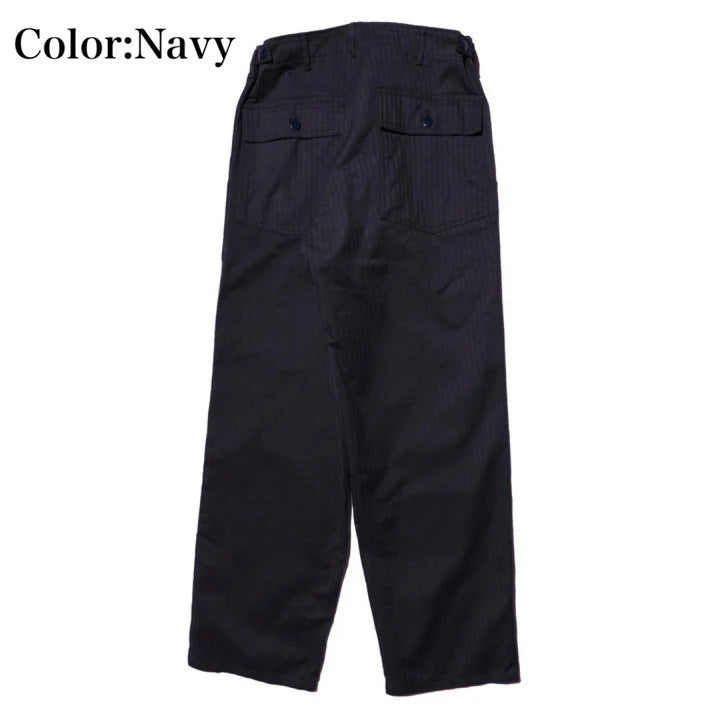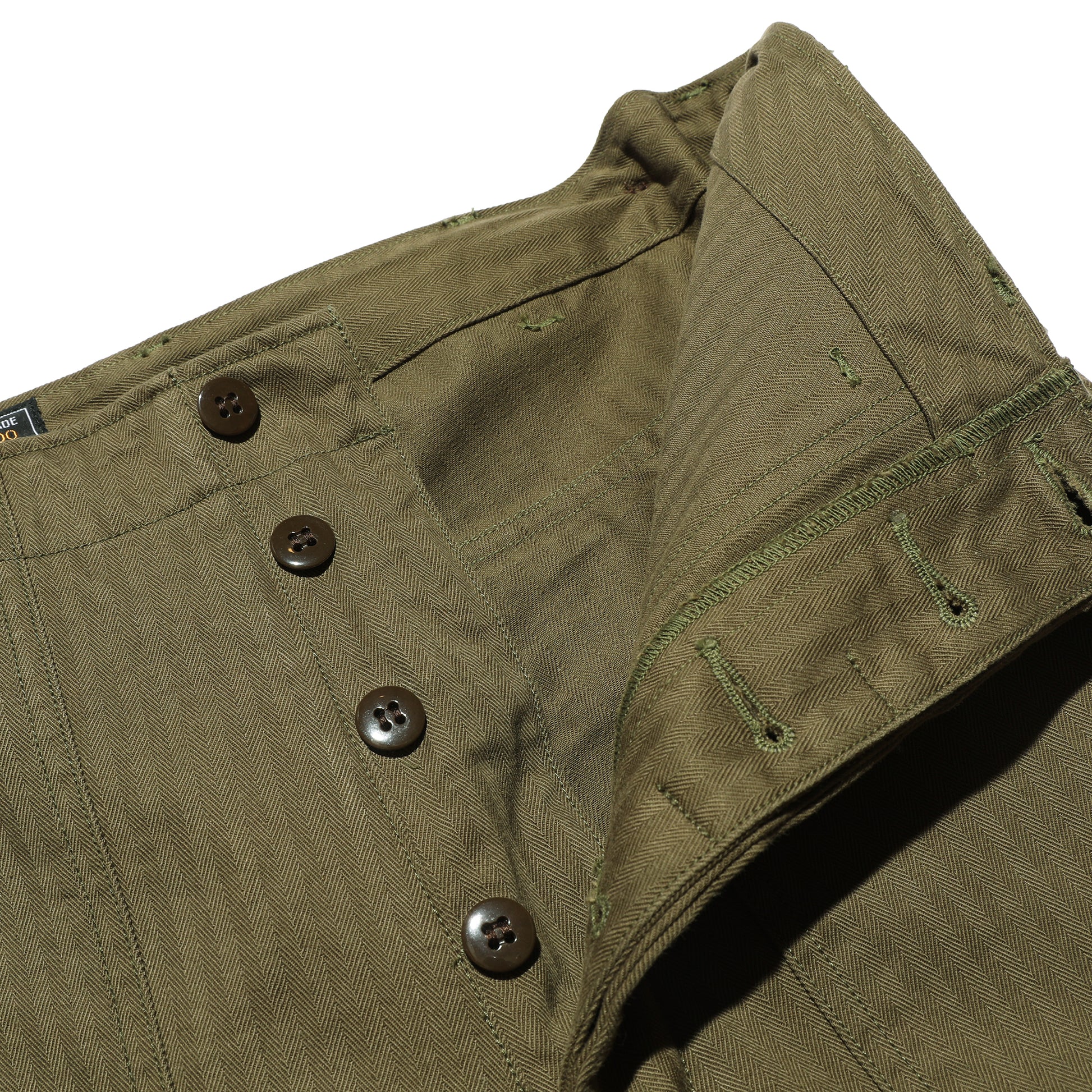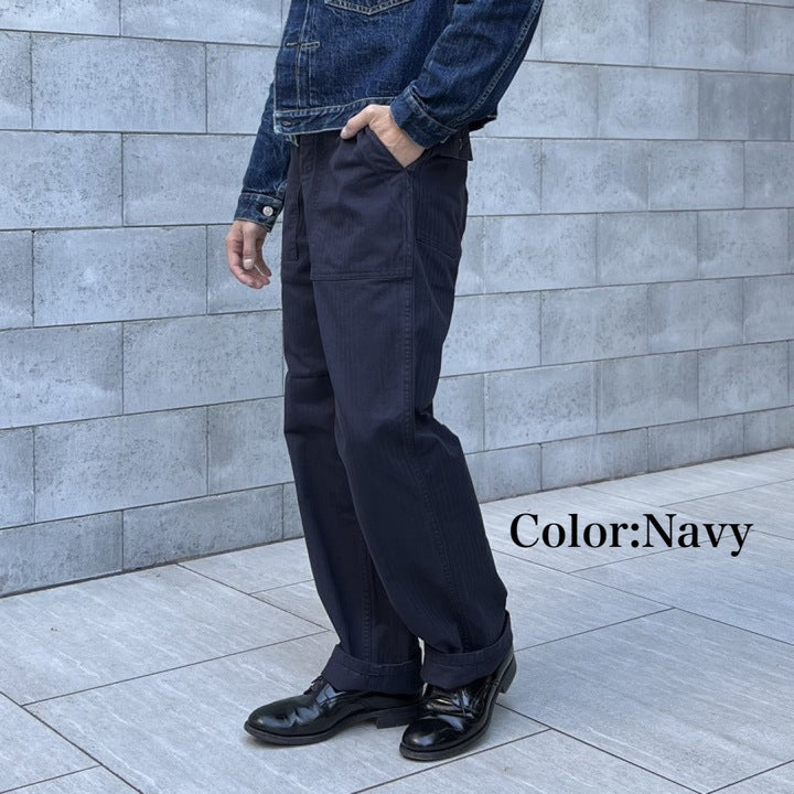 2026年のコレクションテーマは「SHIBU-KAJI」。 1980年代後半から1990年代にかけて東京・渋谷を中心に流行した渋カジをベースに現代らしいトッピングを加えたコレクション 若き頃の懐かしさを醸しながら普遍的で永続的に使い込めるプロダクツを展開しております。 昨年から好評のため展開色を変えてリリースしました。 ベイカーパンツはもともと、パン職人(ベーカー)が着用していたことからその名前が付けられたと言われています。別名でファティーグ(雑役)パンツとも呼ばれ、戦地に赴く際だけでなく、内勤の作業中にも穿かれていたとされています。 M-43パンツの後継として採用されたM-47パンツは、サイドに付く大きなカーゴポケットが廃止され、尿素ボタンが使用されました。今回のベイカーパンツでは、ヘリンボーンツイルの生地を使用し、2色展開のしっかりとした肉感が特徴です。 当時のヴィンテージヘリンボーンは、撚りに変化を付けることで畝をくっきりとさせた丈夫な生地となっています。弊社は所有するヴィンテージをもとに染色