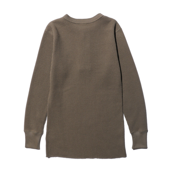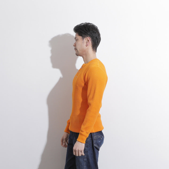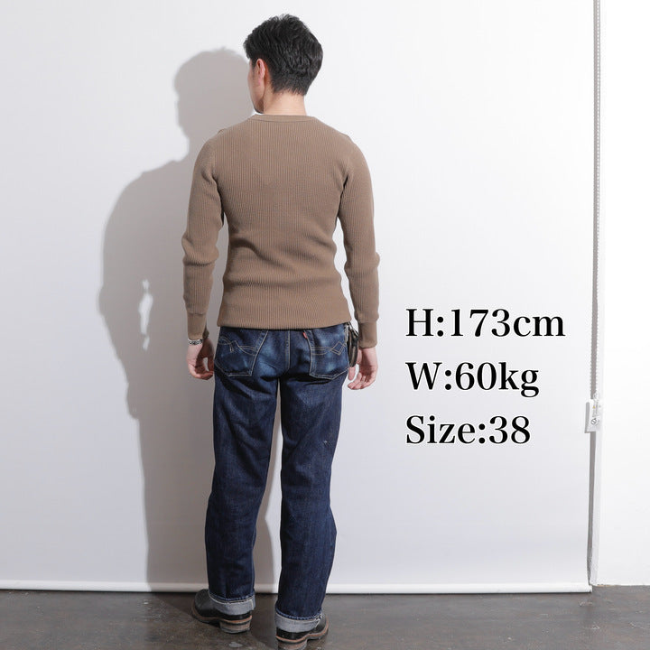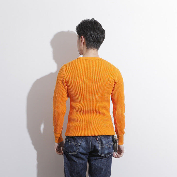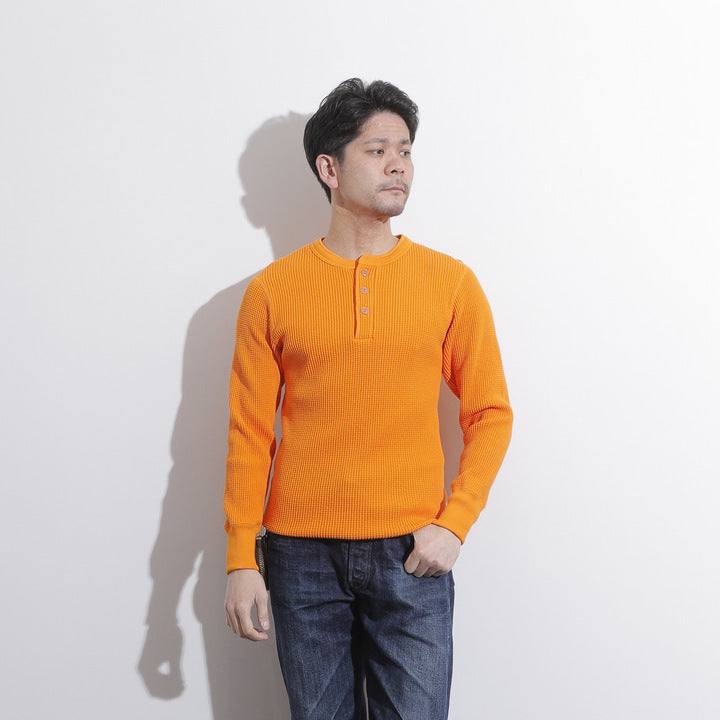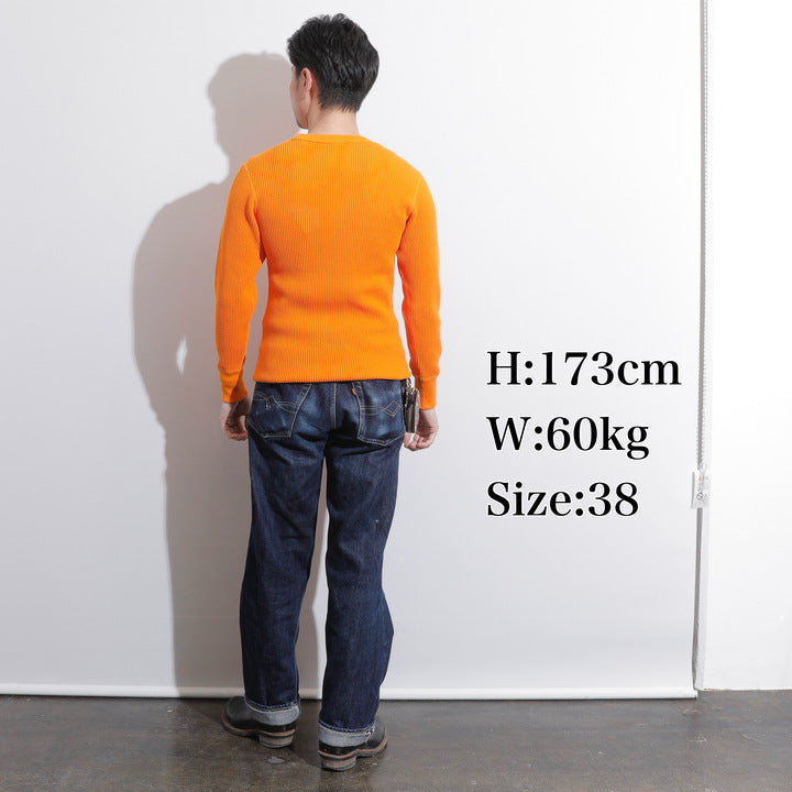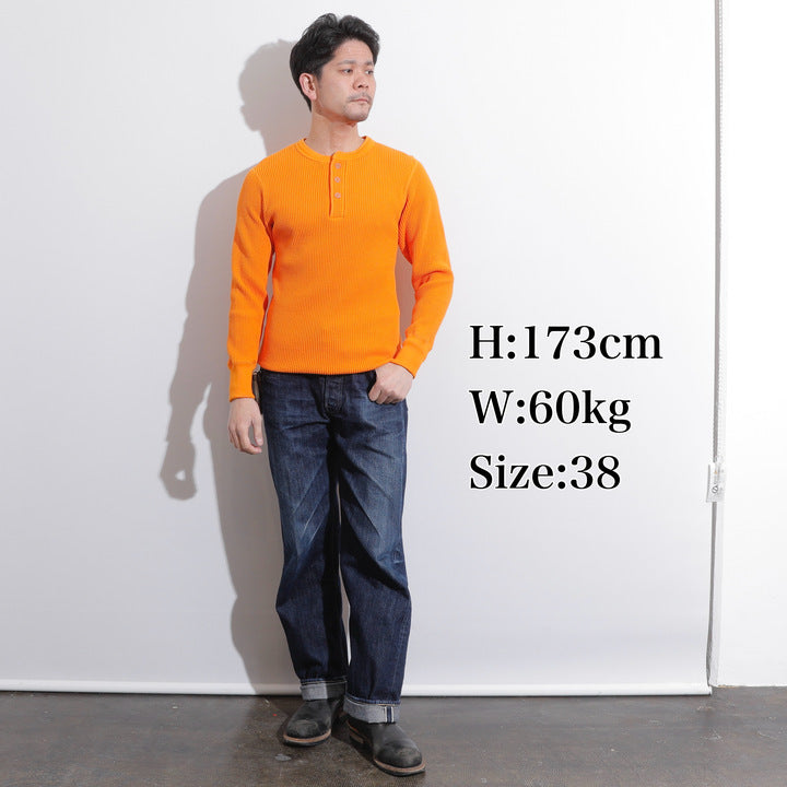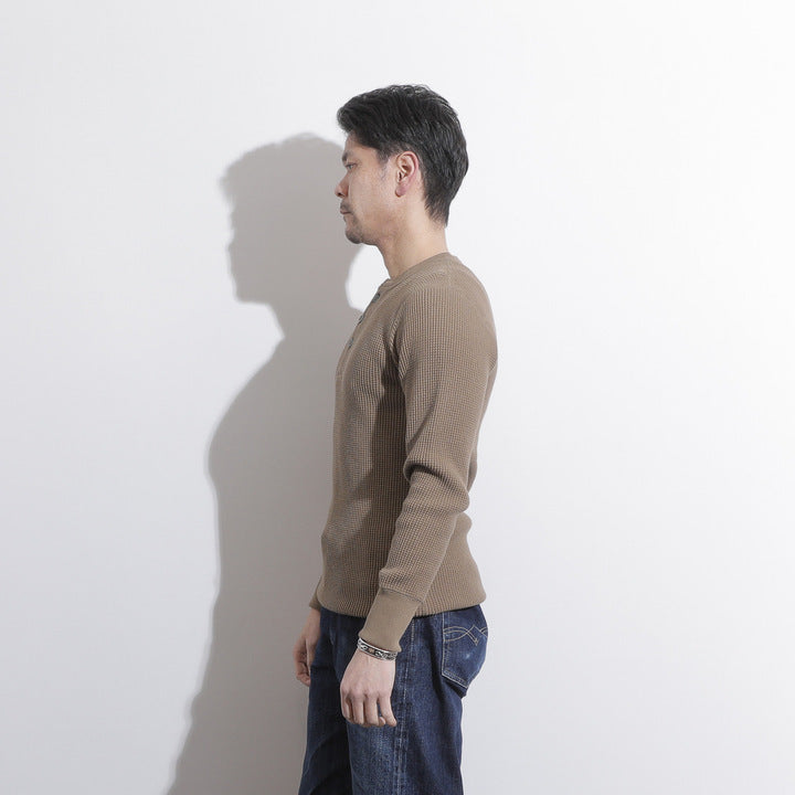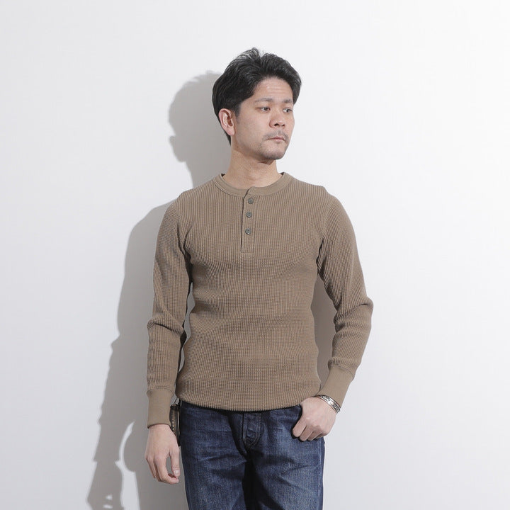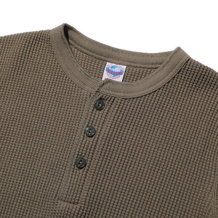 JELADO ""ATHLETIC BRAND"" メガサーマル ヘンリーネック Tシャツ リリースJELADOより、極厚で高い保温性を誇る「メガサーマル ヘンリーネック Tシャツ」が登場しました。クルーネック同様、タイトなフィット感で身体にぴったりと寄り添い、抜群の保温性を実現しています。一般的なサーマル素材が30番手糸で編まれるのに対し、JELADOのメガサーマルは10番手糸を採用。極太の糸で編み上げた生地は、圧倒的な厚みと耐久性を持ち、ワッフル状の凹凸が空気の層を作り出し、高い保温性を発揮します。フロントに施されたボタンがアクセントとなり、重ね着の際に表情をプラスします。身体に沿う設計で、スッキリとしたシルエットのアウターやレザーウェアのインナーに最適です。動きやすさを損なわず、洗い込んでも柔らかさが持続。体型に合わせて自然にフィットします。バインダーネック仕上げで首元の耐久性を強化。各リブには締め付け感のある素材を使用し、フィット感を向上させて頂いております。程よい着丈で、重ね着でも一枚着でも違和感なく着こなせます。そのしっかりとした生地感とタイトな作りにより、保温性と快適性を両立。フロントボタンがアクセントとなるヘンリーネックデザインで、インナーとしても主役級の存在感を放つ一着です。秋冬シーズンのワードローブに欠かせないアイテムとして、ぜひご活用ください。