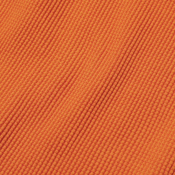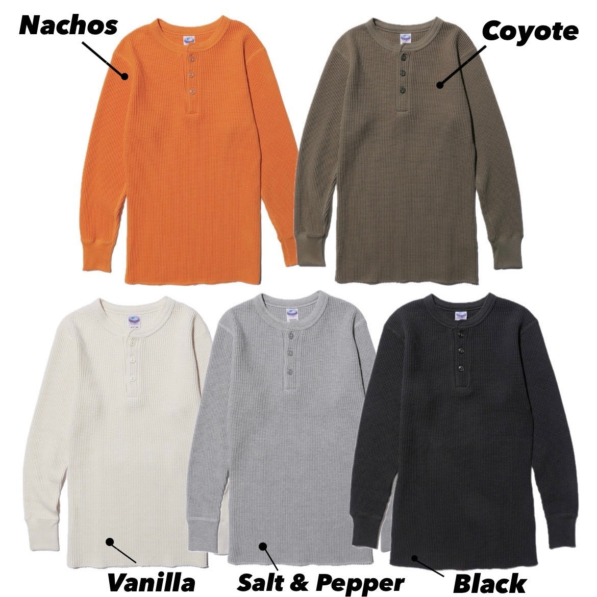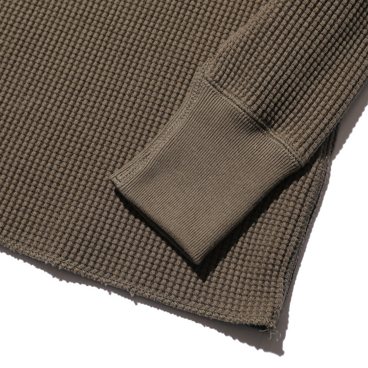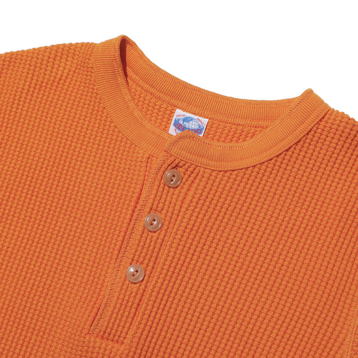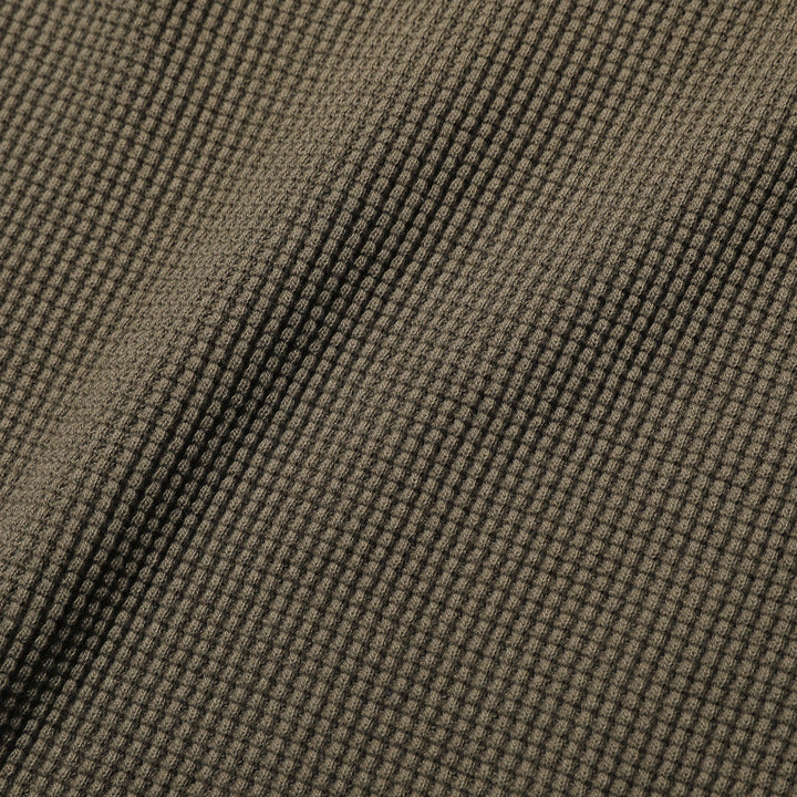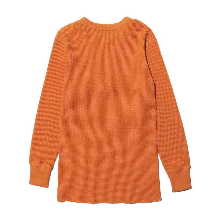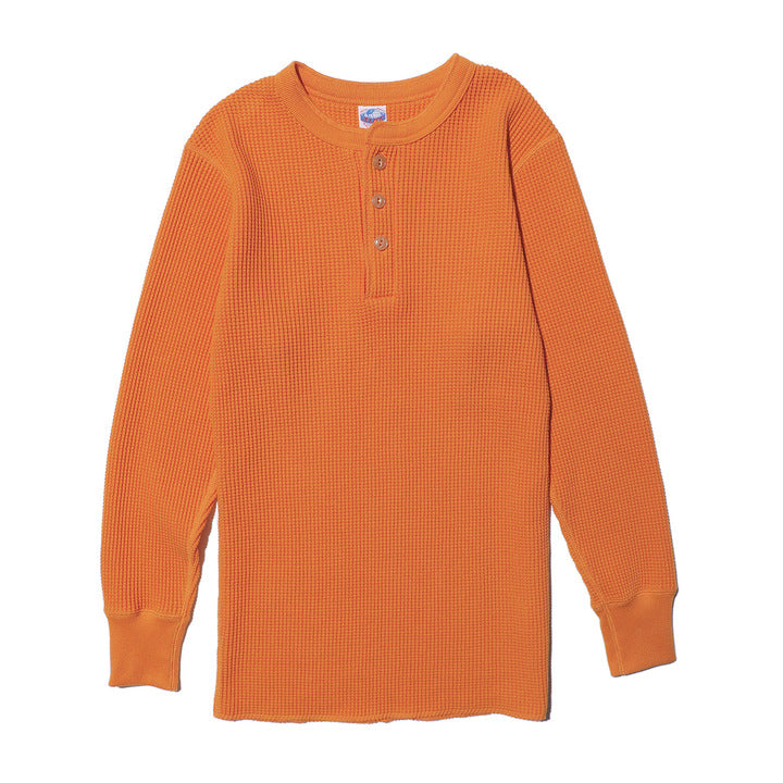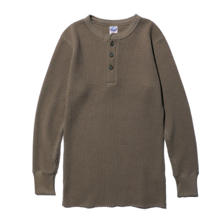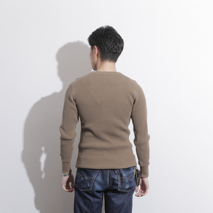 JELADO ""ATHLETIC BRAND"" メガサーマル ヘンリーネック Tシャツ リリースJELADOより、極厚で高い保温性を誇る「メガサーマル ヘンリーネック Tシャツ」が登場しました。クルーネック同様、タイトなフィット感で身体にぴったりと寄り添い、抜群の保温性を実現しています。一般的なサーマル素材が30番手糸で編まれるのに対し、JELADOのメガサーマルは10番手糸を採用。極太の糸で編み上げた生地は、圧倒的な厚みと耐久性を持ち、ワッフル状の凹凸が空気の層を作り出し、高い保温性を発揮します。フロントに施されたボタンがアクセントとなり、重ね着の際に表情をプラスします。身体に沿う設計で、スッキリとしたシルエットのアウターやレザーウェアのインナーに最適です。動きやすさを損なわず、洗い込んでも柔らかさが持続。体型に合わせて自然にフィットします。バインダーネック仕上げで首元の耐久性を強化。各リブには締め付け感のある素材を使用し、フィット感を向上させて頂いております。程よい着丈で、重ね着でも一枚着でも違和感なく着こなせます。そのしっかりとした生地感とタイトな作りにより、保温性と快適性を両立。フロントボタンがアクセントとなるヘンリーネックデザインで、インナーとしても主役級の存在感を放つ一着です。秋冬シーズンのワードローブに欠かせないアイテムとして、ぜひご活用ください。
