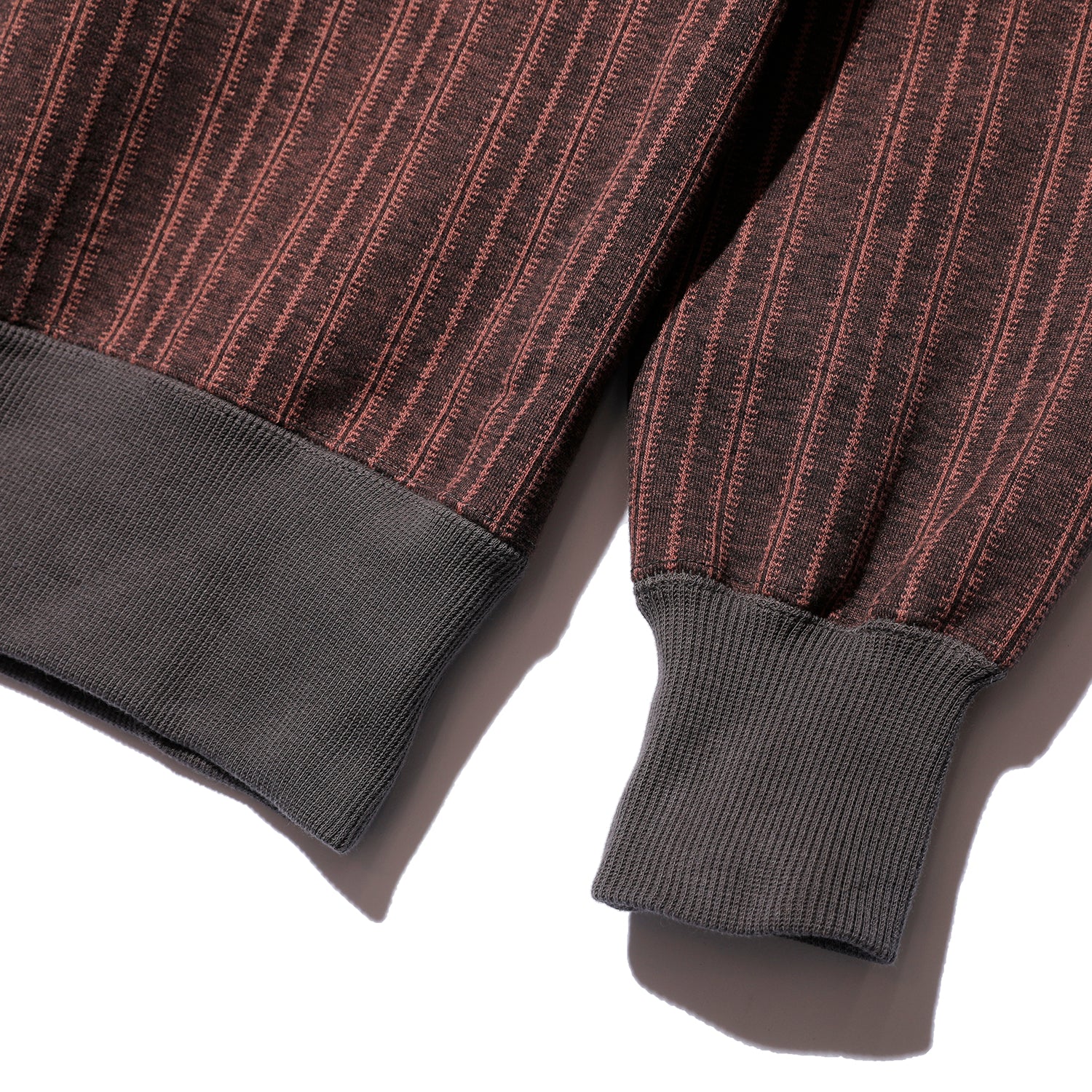 2025年のコレクションテーマは「THE CREAM OF THE CACHE」。「最上のコレクション」を意味し、JELADOの秘蔵コレクションから厳選したヴィンテージアイテムを再現します。 ライディングハイさんと共同で、こだわり抜いたスウェットシャツを製作。「Mountain Man(マウンテンマン)」は、1930〜40年代のアウトドア用ヴィンテージ生地を分析し、忠実に再現しました。 表糸は30番手のチャコール杢糸を使用し、中糸には生成り糸を採用。裏糸は異なる太さの2種類を組み合わせ、ストライプ柄のような凹凸感を演出。特殊なジャガード編み機(世界に2台)を使用し、裏側も起毛後にオーバーダイ加工を施しています。 16.1ozの高密度裏毛起毛素材を使用。クルーネックは40年代の両Vデザインを再現し、サイドシームを加えた縫製で仕立てました。2本針縫製で強度を確保し、袖口は丸編み仕様。ヴィンテージの雰囲気を細部まで追求した一枚です。