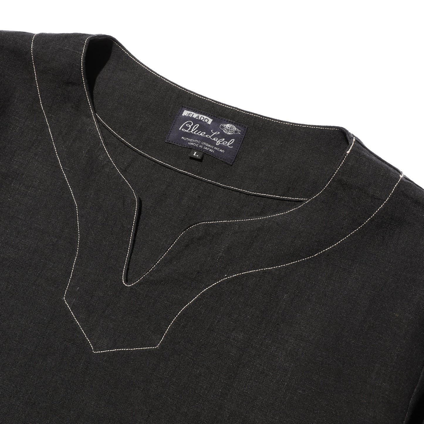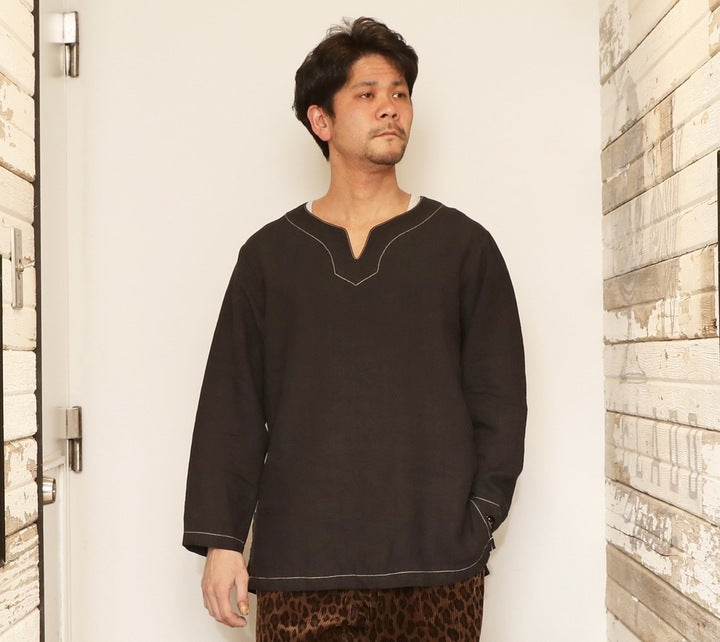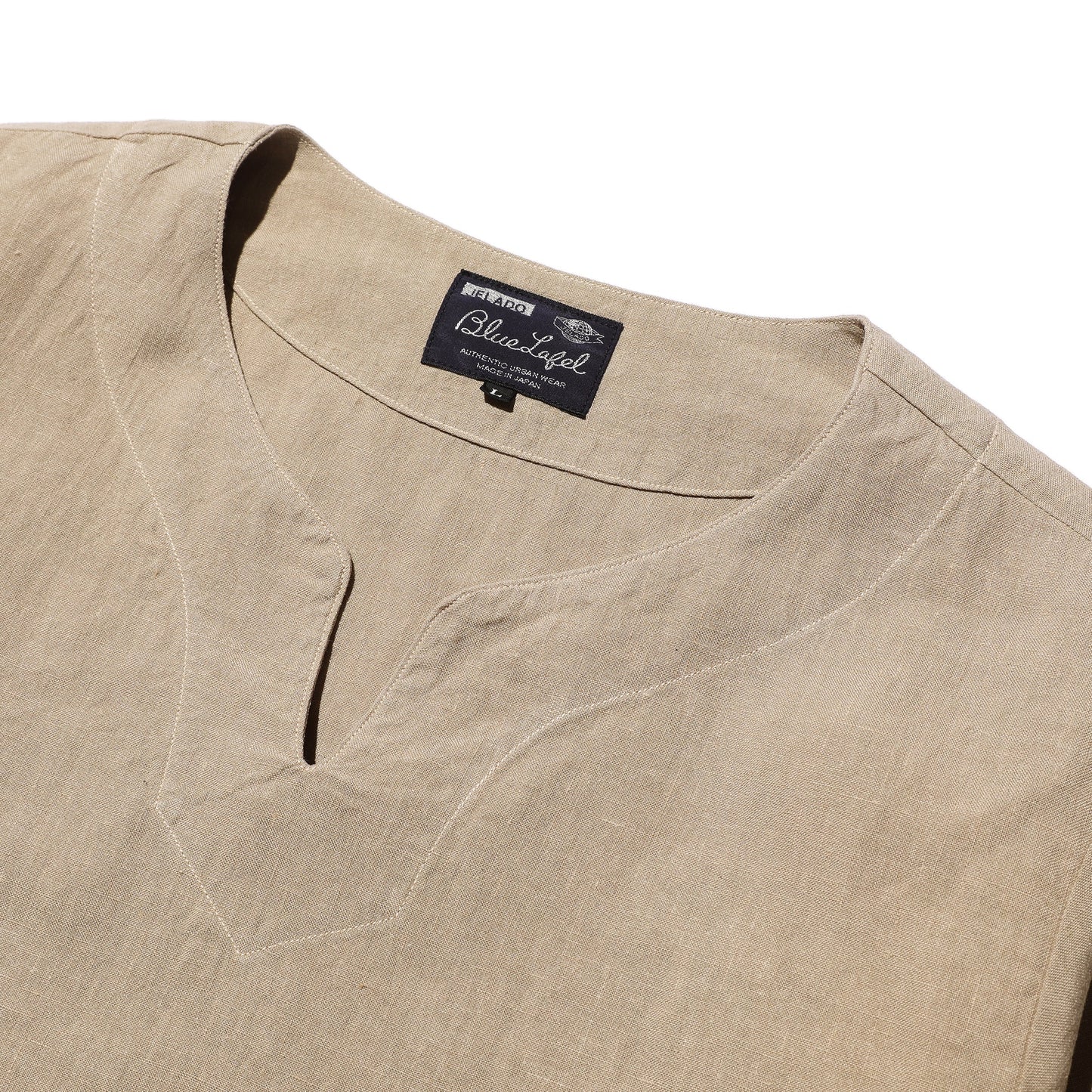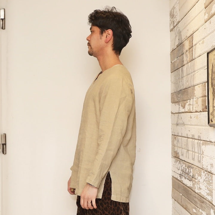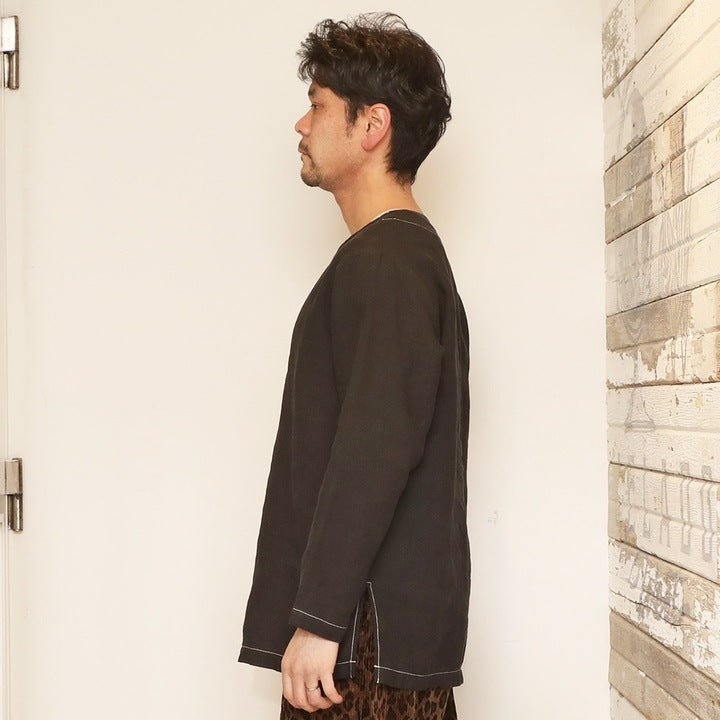 シンプルながらもボタンのないデザインが特徴で、カットソーには出せない大人なゆるさが感じられるシャツに仕上がっています。