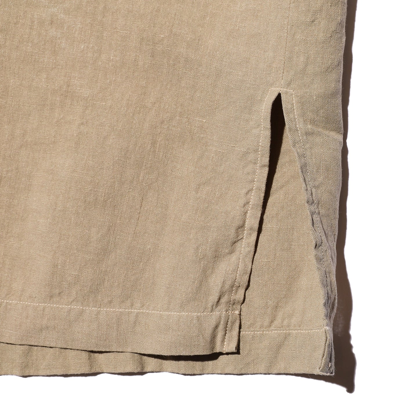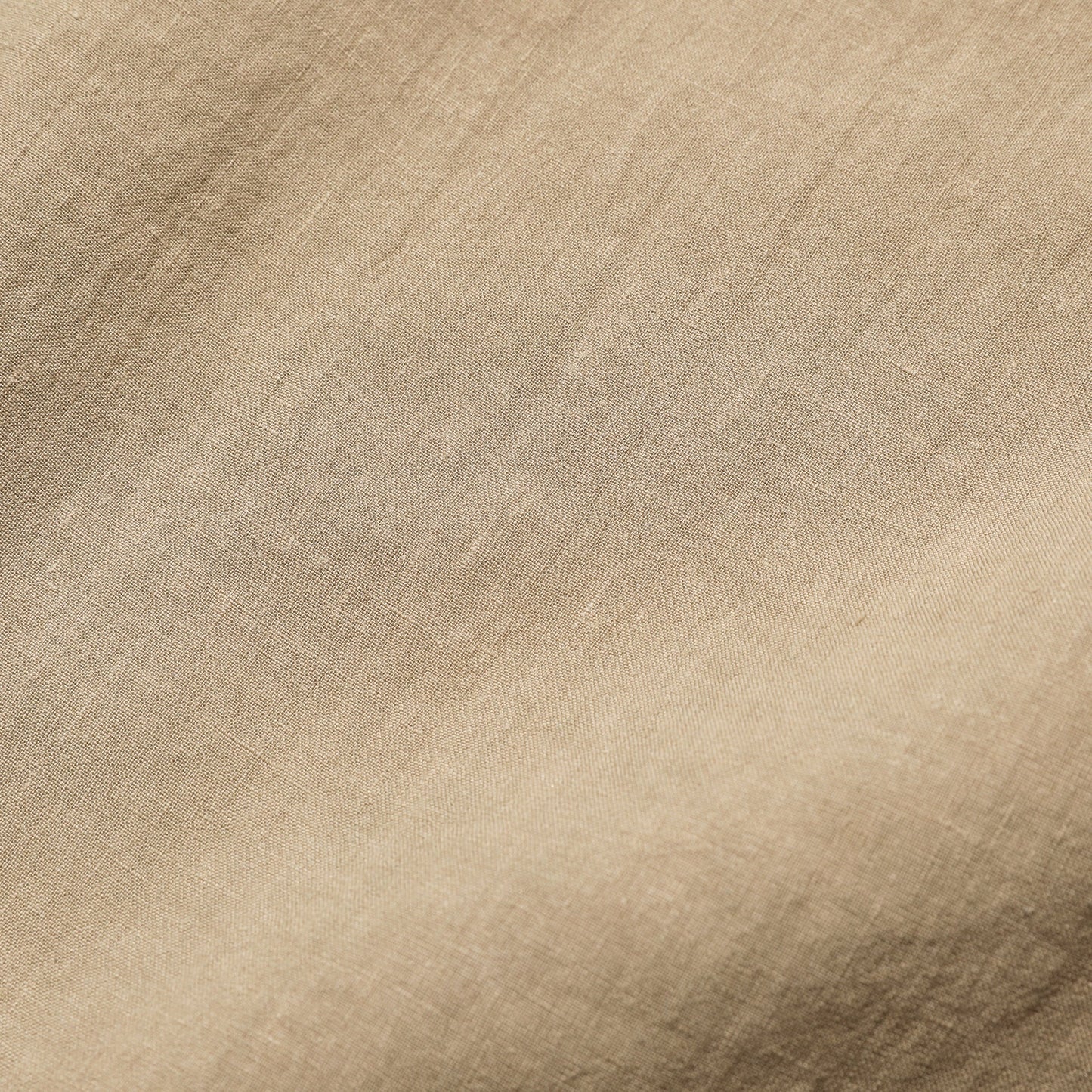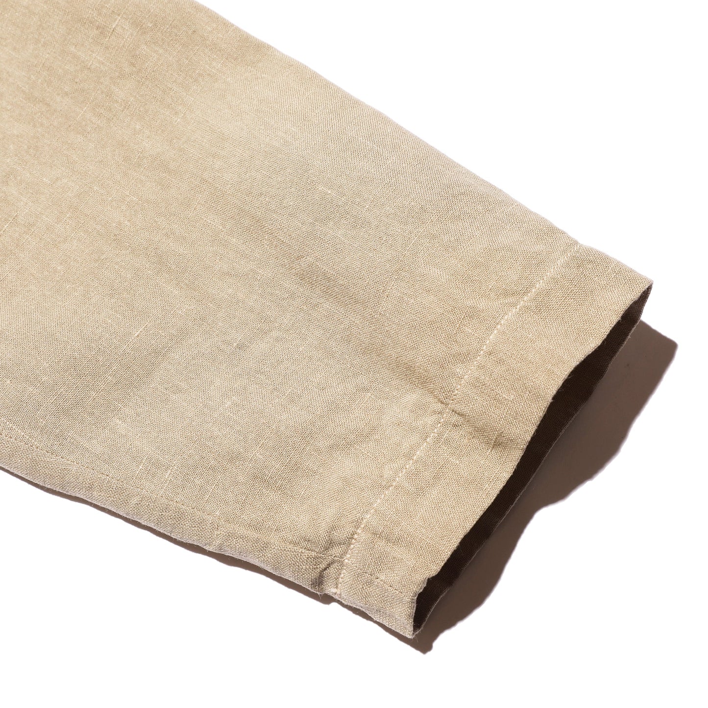 今回の仕様では、100%リネンのキャンバス地が使用され、フレンチリネンの原料を使って生地を織り上げ、揉みこみながら染色することで生地にふくらみが生まれ、麻のシャリ感がありながらもふんわりとした風合いが楽しめる仕上がりとなっています。
