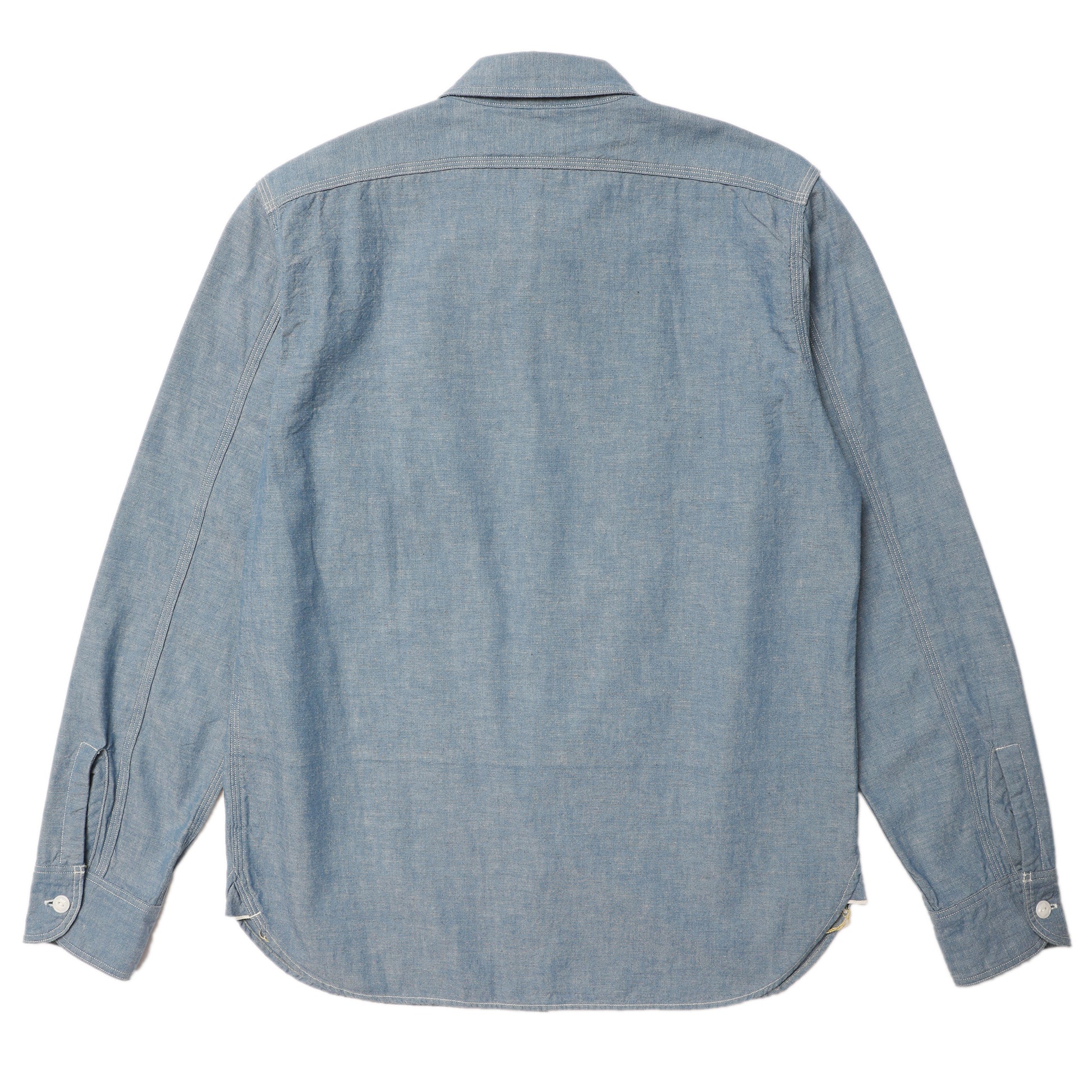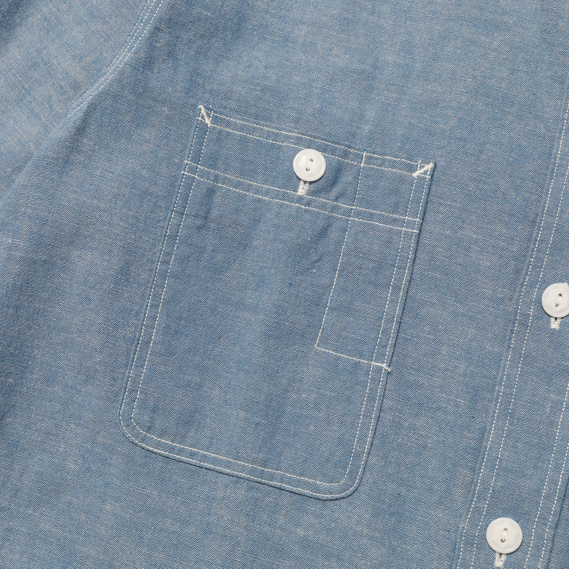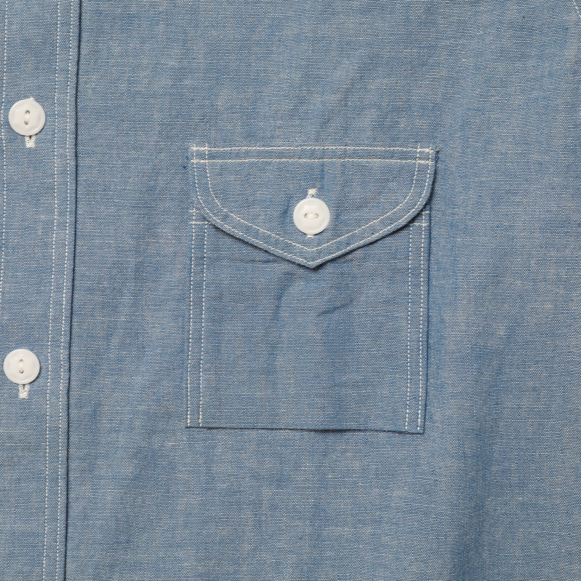 STANDARD COLLECTIONではこのテーマに沿わず、通年作り続けるいわば定番商品のコレクションです。ヴィンテージのワークシャツでも人気の高いガチャポケといわれる左右非対称のポケットがつくシャンブレーシャツをもとに製作しております。この年代のヴィンテージにはチンストラップがつく仕様になっておりますが、あえてそのデザインを採用せず、シンプルに着れる様仕立ててます。今回から生地を変更し30年代のシャンブレーシャツを再現した別注の生地で製作しております。生地は比較的薄めな素材ですが、ムラの強い生地感なので着用することの経年変化が楽しめます。インディゴ染めですので、色も褪色し、着用することに自分なりのアタリを楽しめます。