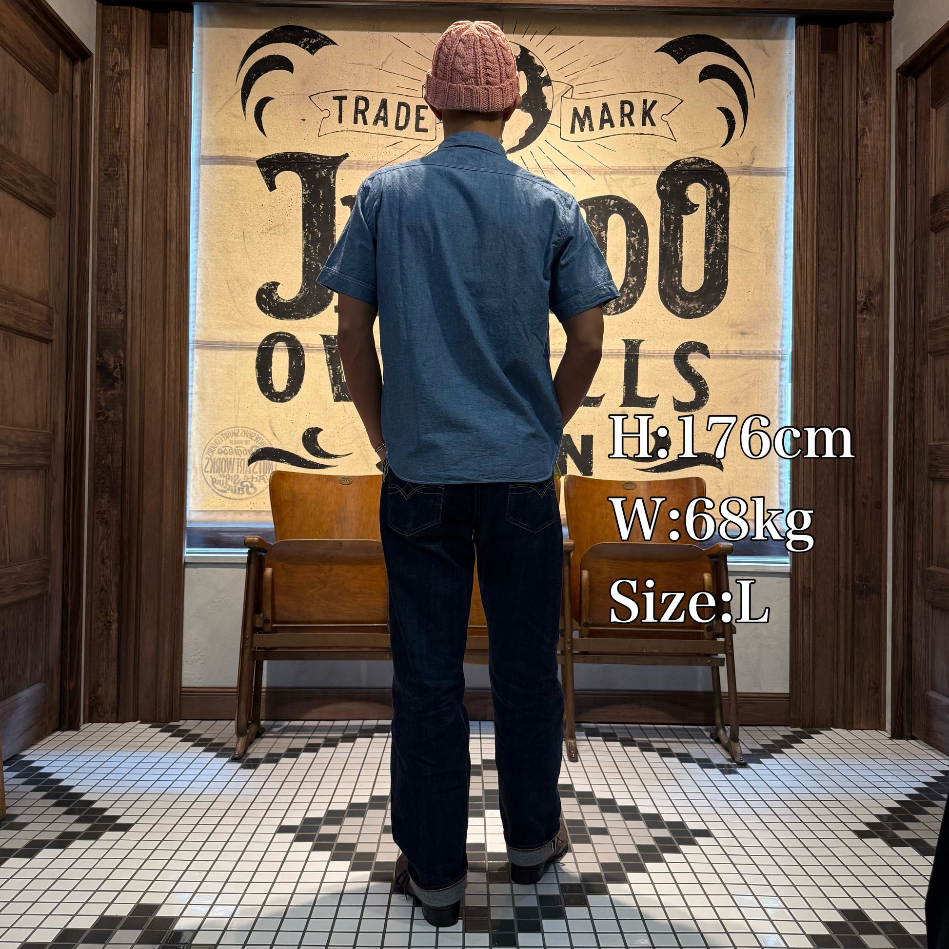 40〜50年代にワークウェアブランドは数多く存在しましたが、半袖シャンブレーを生産していたブランドは数えるほどしかありません。よって、デザイン的にはオーソドックスなアイテムでありながら、古着的観点からすれば評価の高い、非常にありがたみのあるアイテムだったりします。今回はそのようなオリジナルの半袖シャンブレーシャツを、質実剛健なワークウェアらしい仕様を取り入れつつオーソドックスにまとめてみました。襟はダブルステッチ、身頃の縫製はトリプルステッチ、身頃両サイドはマチ付き、左前身頃裾裏にユニオンチケットを縫い付けました。ボタンはメタルボタン、両胸にフラップポケットを配し、カンヌキには赤色の綿糸を採用しました。アシンメトリーなガチャポケ・山ポケなどのスペシャルなディテールはあえて控え、リアルな目線のワークウェアとなっております。脇周りに余裕を持たせながらも、スッキリとしたシルエットで着用して頂けるよう、着丈は短めに仕上げました。