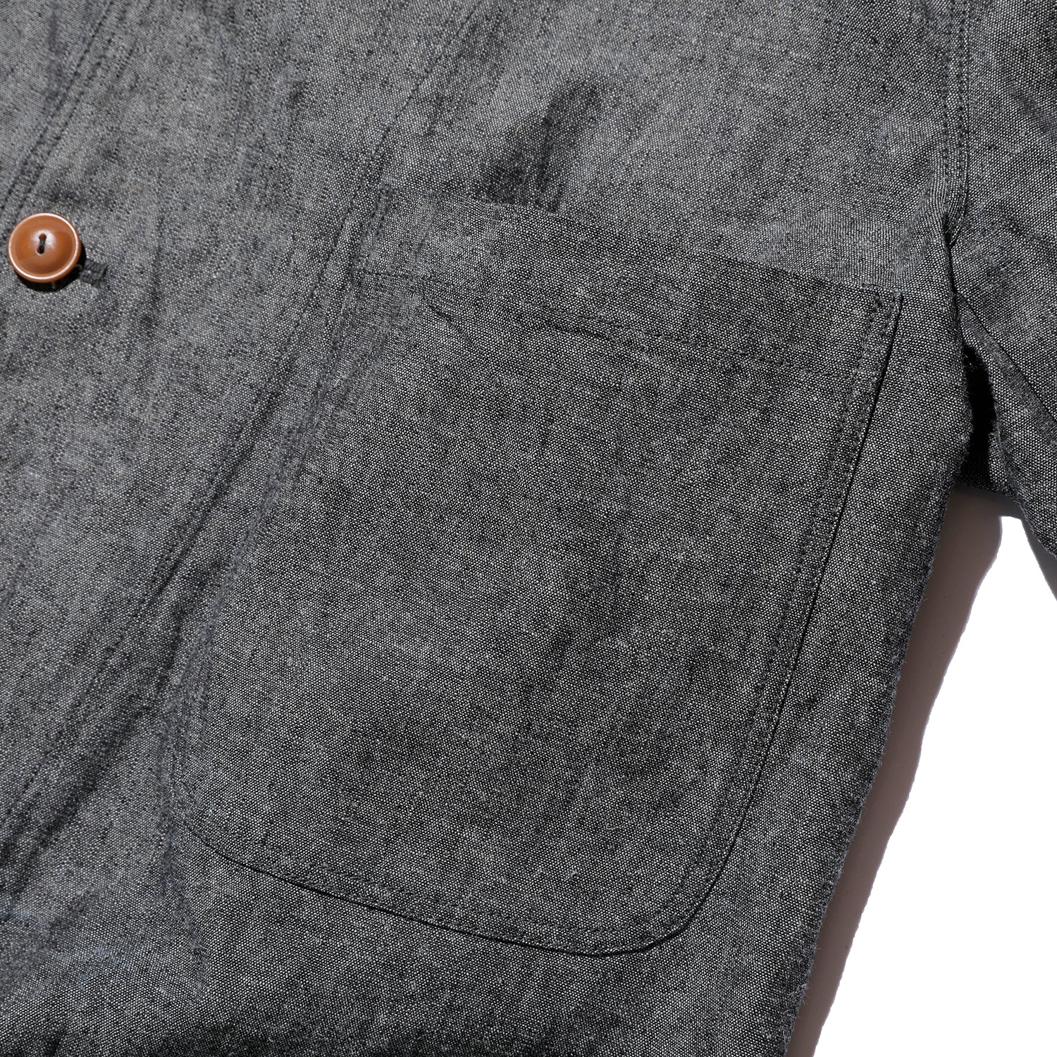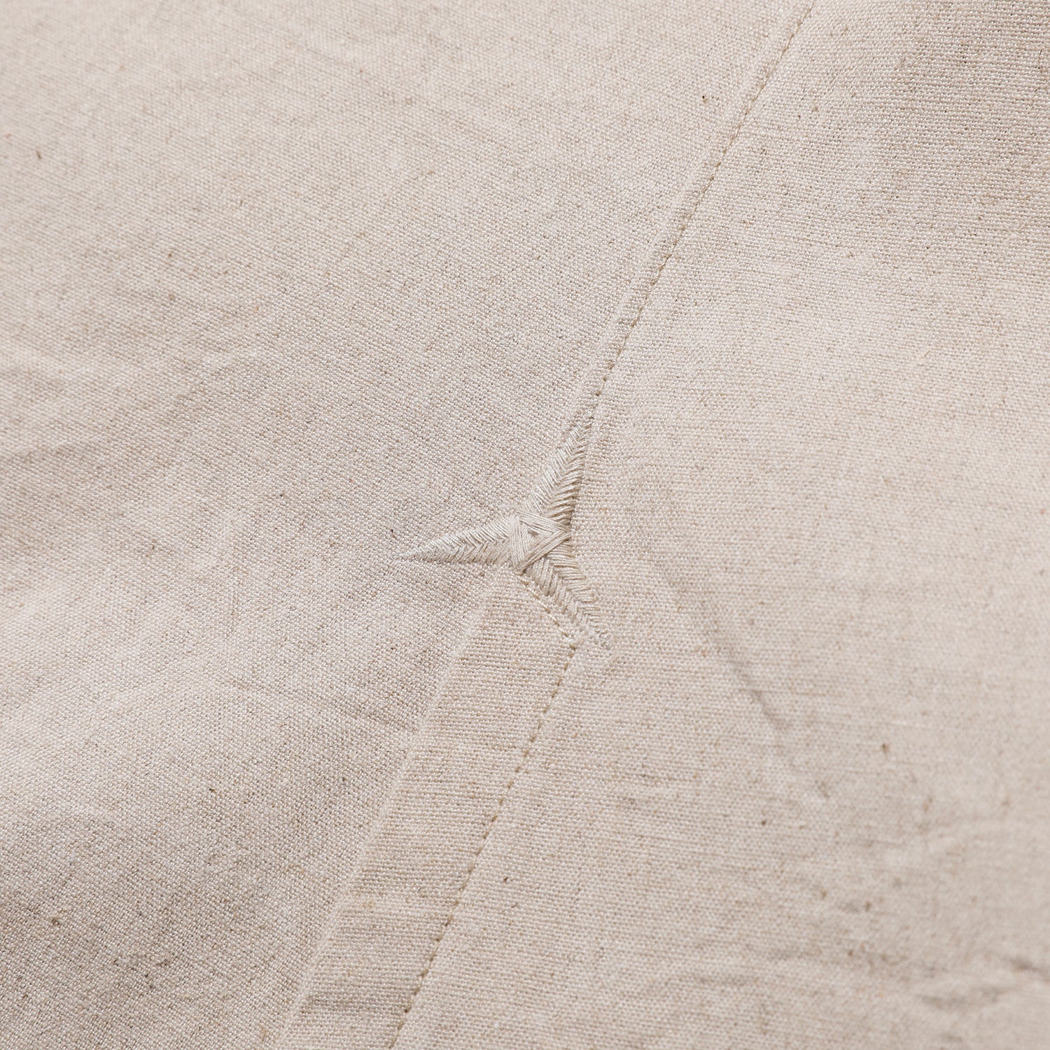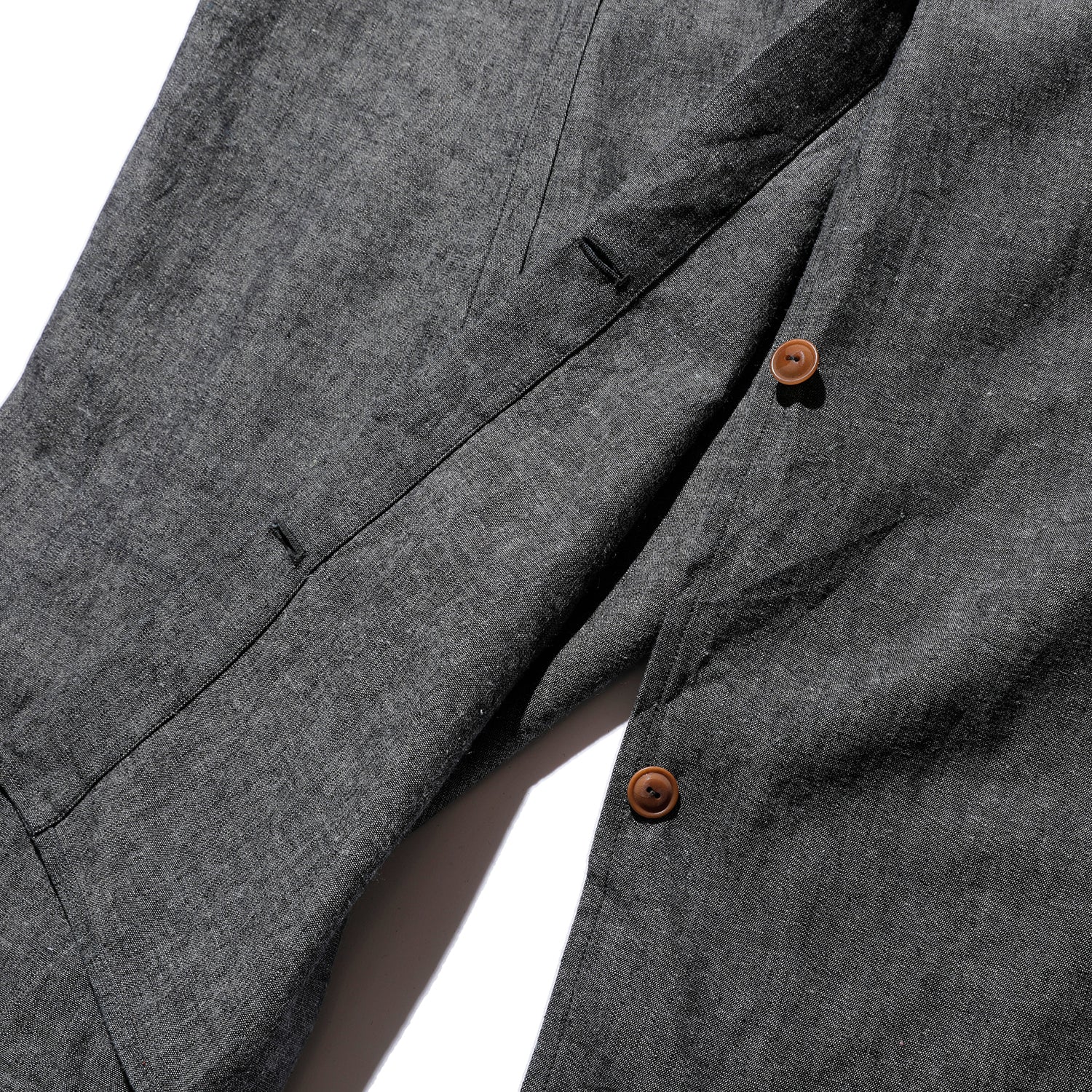 するビンテージをベースにしました。目の詰まったリネンの、手縫いで仕立てられたものです。量産品とは明らかに違う型紙や、手かがりのボタンホール、背中の裾のタックとその上にあしらわれた星形の刺繍など、現代の量産品とは明らかに違うディテールをできる限り再現しました。生地にはやや張りのある、リネンコットンのメティス(2種類以上の素材を混紡または混織した生地)を使いました。(インディゴは縦糸がインディゴ染めで、色落ちが楽します)