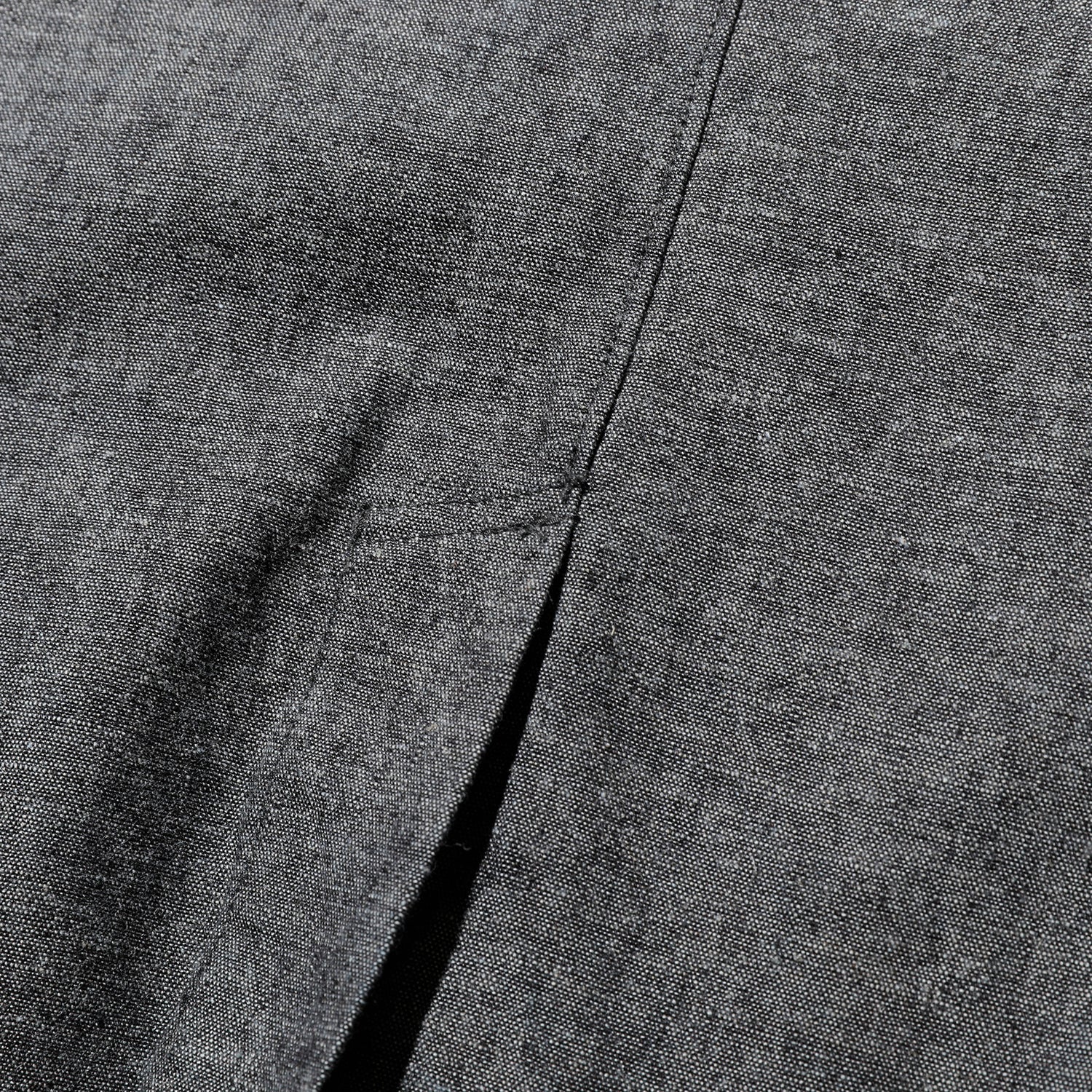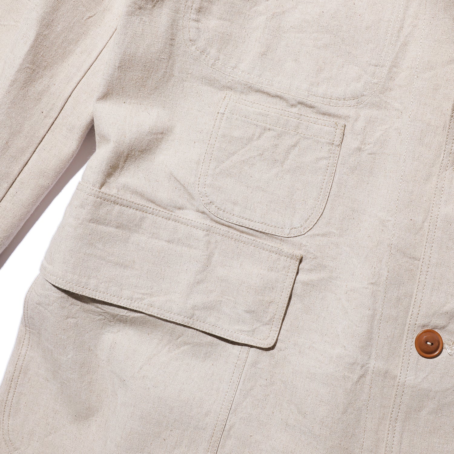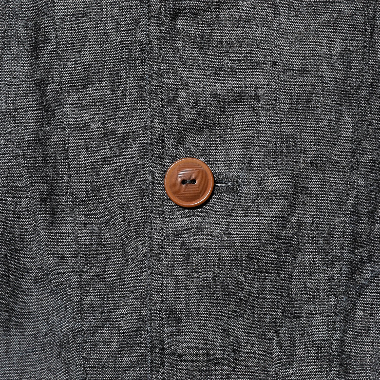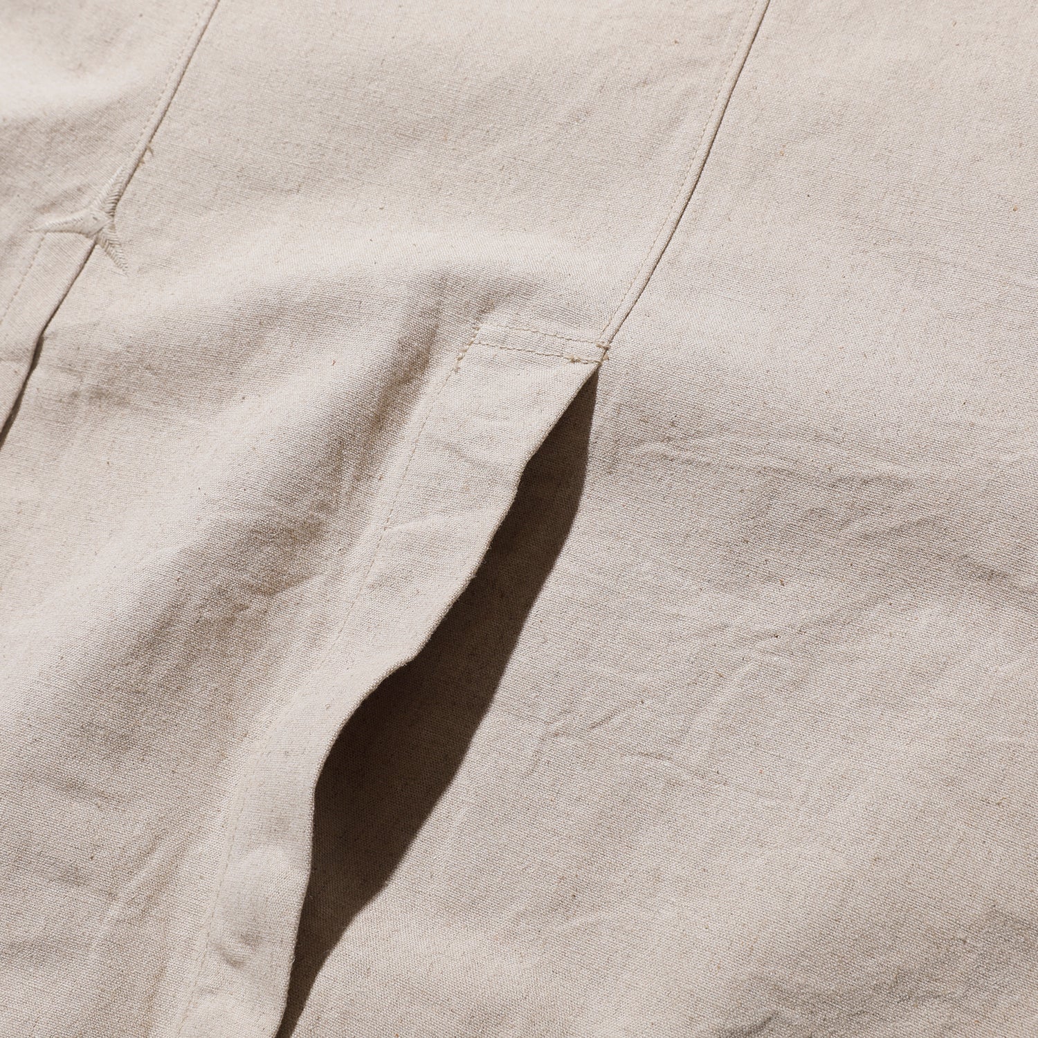 するビンテージをベースにしました。目の詰まったリネンの、手縫いで仕立てられたものです。量産品とは明らかに違う型紙や、手かがりのボタンホール、背中の裾のタックとその上にあしらわれた星形の刺繍など、現代の量産品とは明らかに違うディテールをできる限り再現しました。生地にはやや張りのある、リネンコットンのメティス(2種類以上の素材を混紡または混織した生地)を使いました。(インディゴは縦糸がインディゴ染めで、色落ちが楽します)