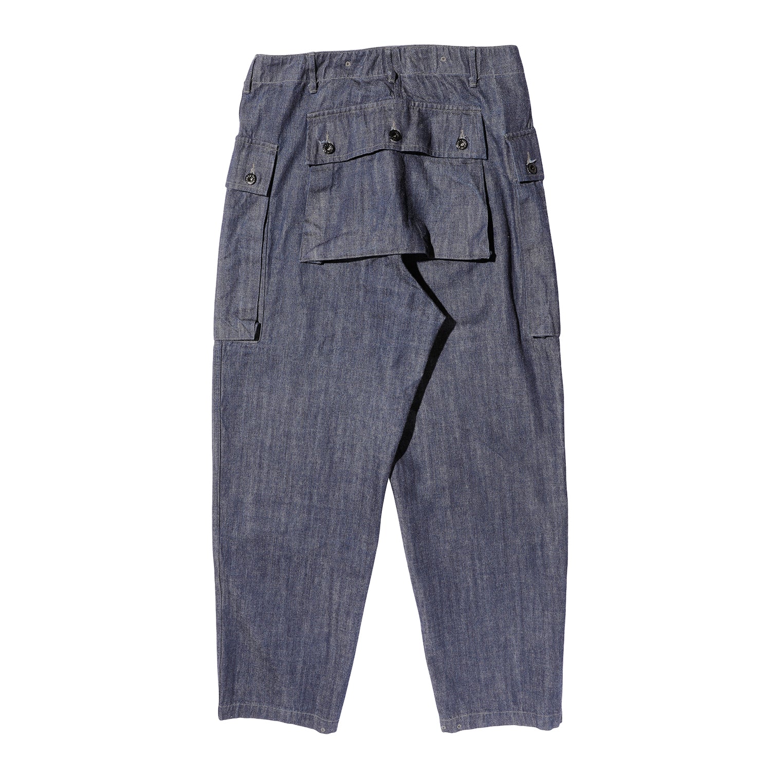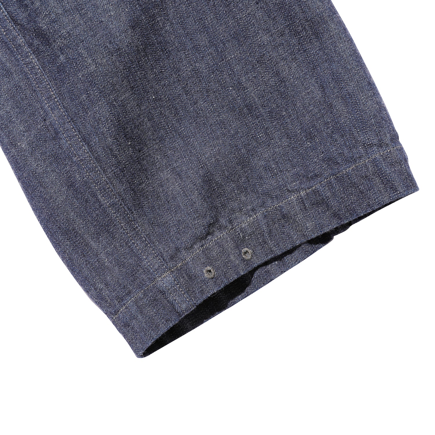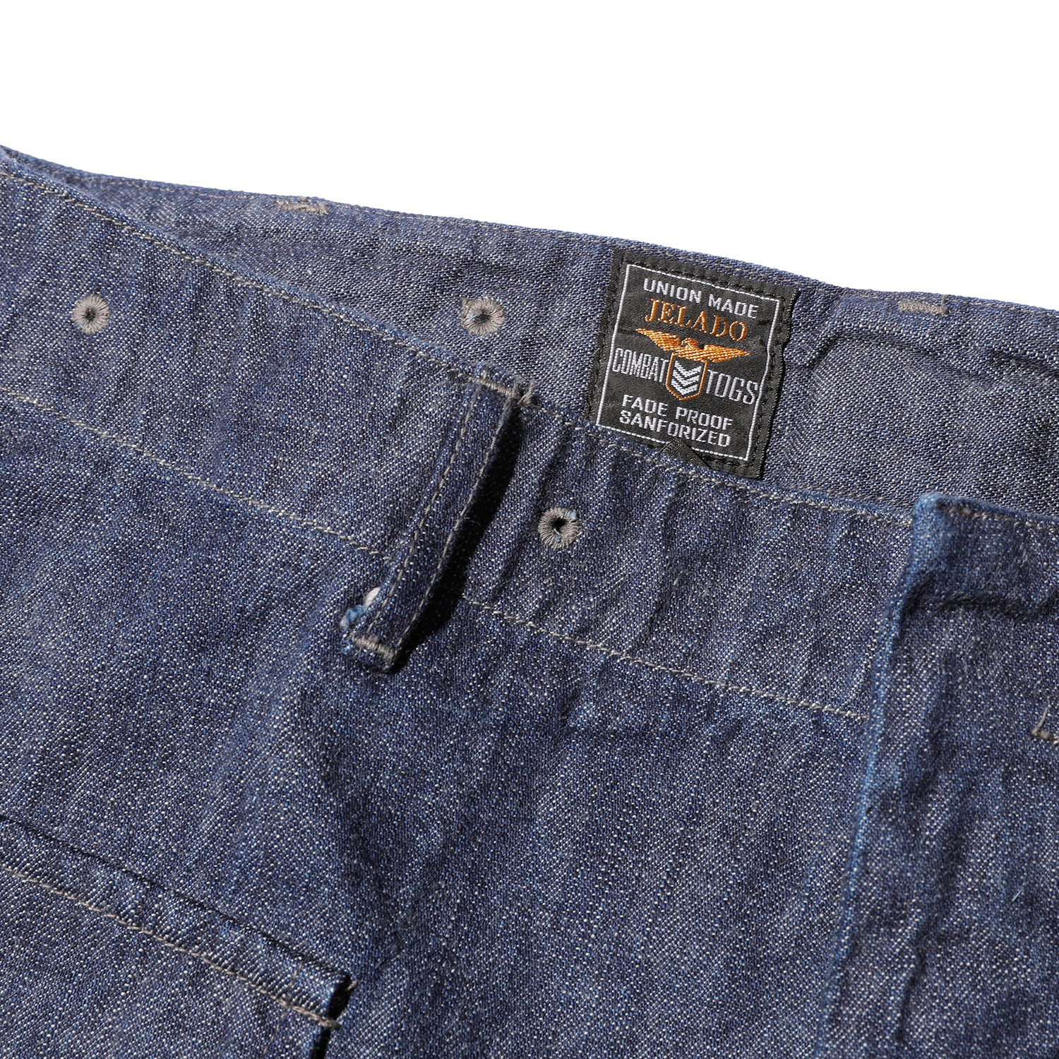 特に特徴的なのは、後ろに大きく配置されたポケットで、レーション(食料)や手榴弾を収納するために作られたものです。今回使用した素材は、CM47でも採用したヘリンボーンツイルを特別に染色したものです。ヘリンボーンは撚りに変化をつけることで畝を際立たせた丈夫な生地で、スレン染料を使用し、ヴィンテージアイテムから再現した色味を忠実に再現しています。穿き込むほどに色落ちし、ヴィンテージのような味わい深い経年変化を楽しむことができます。さらに、ボタンには鉄製のものを使用し、その足をドーム状にすることで、ヴィンテージらしい雰囲気を高めています。