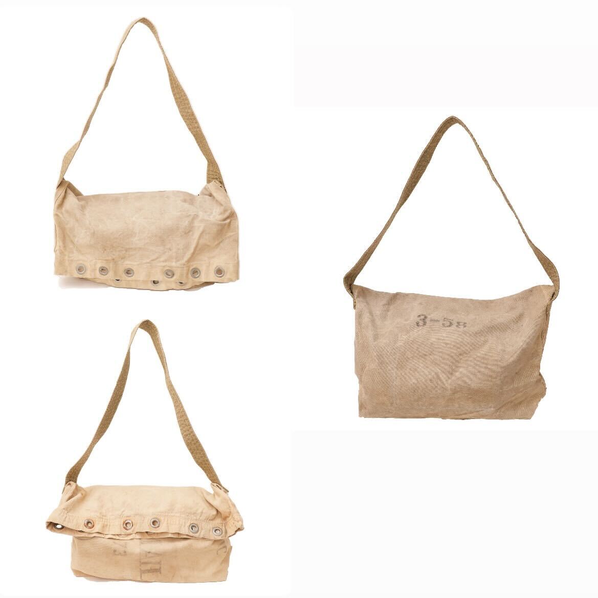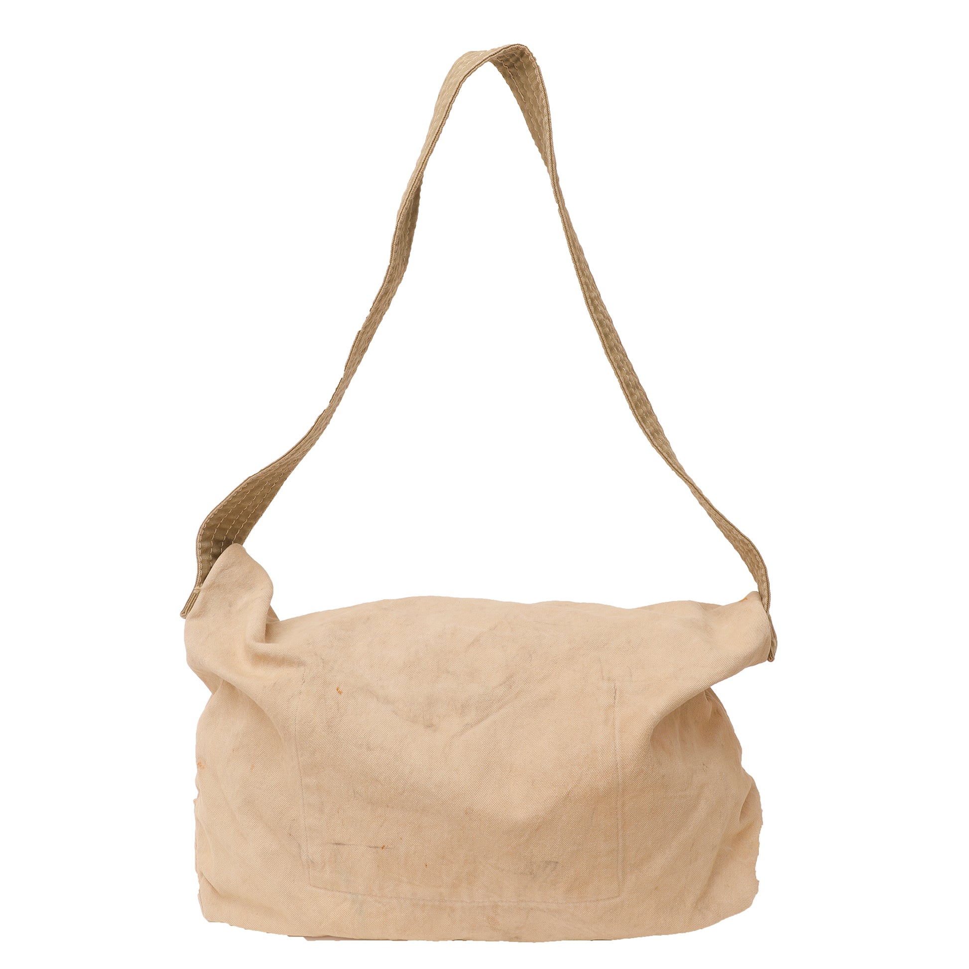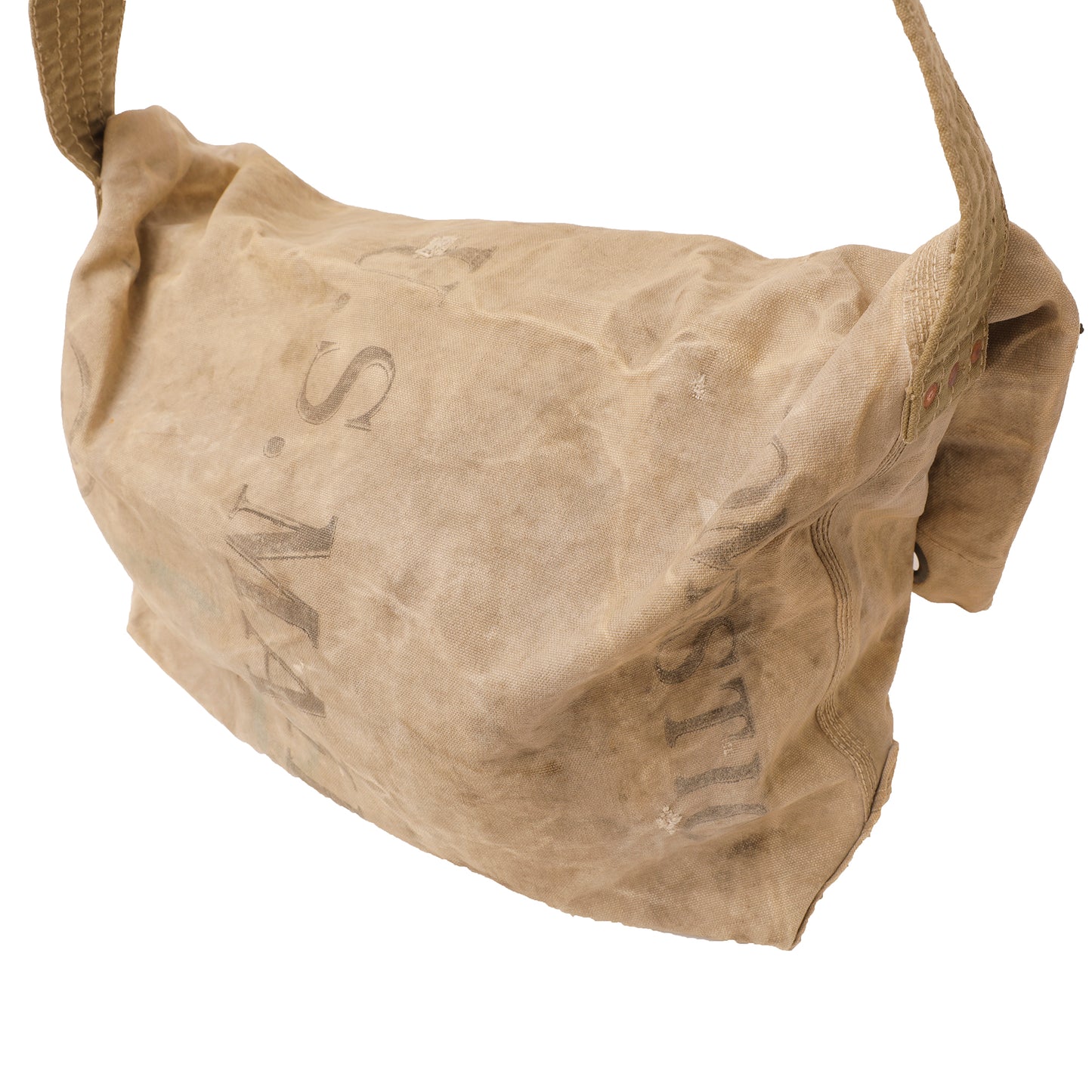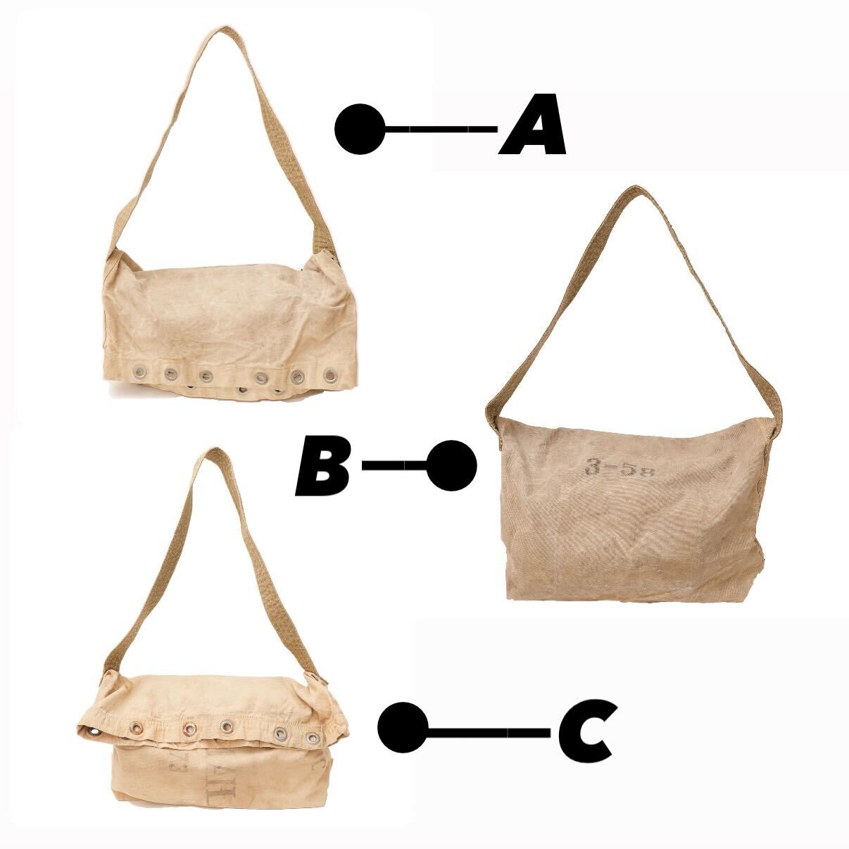 使 い 古 さ れ た ヘビーデューティー な ダ ッ フ ル バ ッ ク を 解 体 • 再 構 築 し 、 現 代 の ラ イ フ ス タ イ ル に 再 投 影 し た 「 Paperboy Satchel」、20 世 紀 初 頭 の アメリカで 新 聞 配達 を し て い た 少 年 た ち が 使っていた ショルダーバッグ に ル ー ツ を 持 つ 。 厚 手 の キ ャ ン バ ス 生 地 と 大 容 量 の 設 計 は 、 雨 や 風 から 新 聞 を 守り な が ら 、 ストリート を 駆 け 抜 け る タ フ な 仕 事 に 耐 え る た めのものであった 。 " Paparboy Satchel "は ヴ ィ ン テ ー ジ Duffie Bag を最 大 限 に 活かしミニマル に 再 構 築 。 元 の 開口 に機 能 性 を 持 た せ フ ラ ッ プ に 。 別 の ヴ ィ ン テ ー ジ 生 地 で 幅 広 の ストラップ 部 分 を 作 成 す る こ と で Paperboy Satchel の イ メ ー ジ ヘ 。現 在 の Messenger Bag と も 思 え る デ ザ イ ン に 。 左 上 部 は アメリカ 合 衆 国 郵 便 公 社 (USPS)な ど の 郵 便 機 関が 国 内郵 便 物の 運搬用 に 庭 際 に 使 用 し て い た 郵 便 袋の ヴ ィ ン テ ー ジ 。 左 下 の こ の 厚 手 の カーキ の キ ャ ン バ ス は お そ ら く WWII前期の アメリカ軍が 使 用 し て い た Barracks Bagで あ る と 思 わ れ る 。