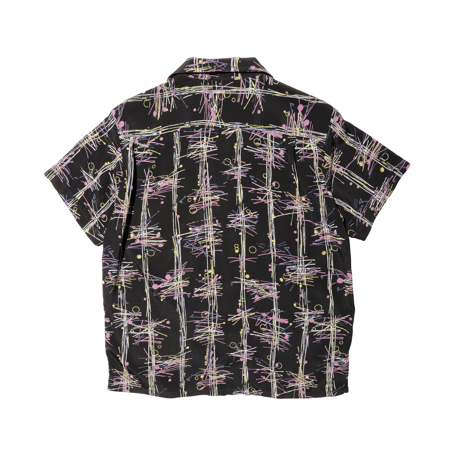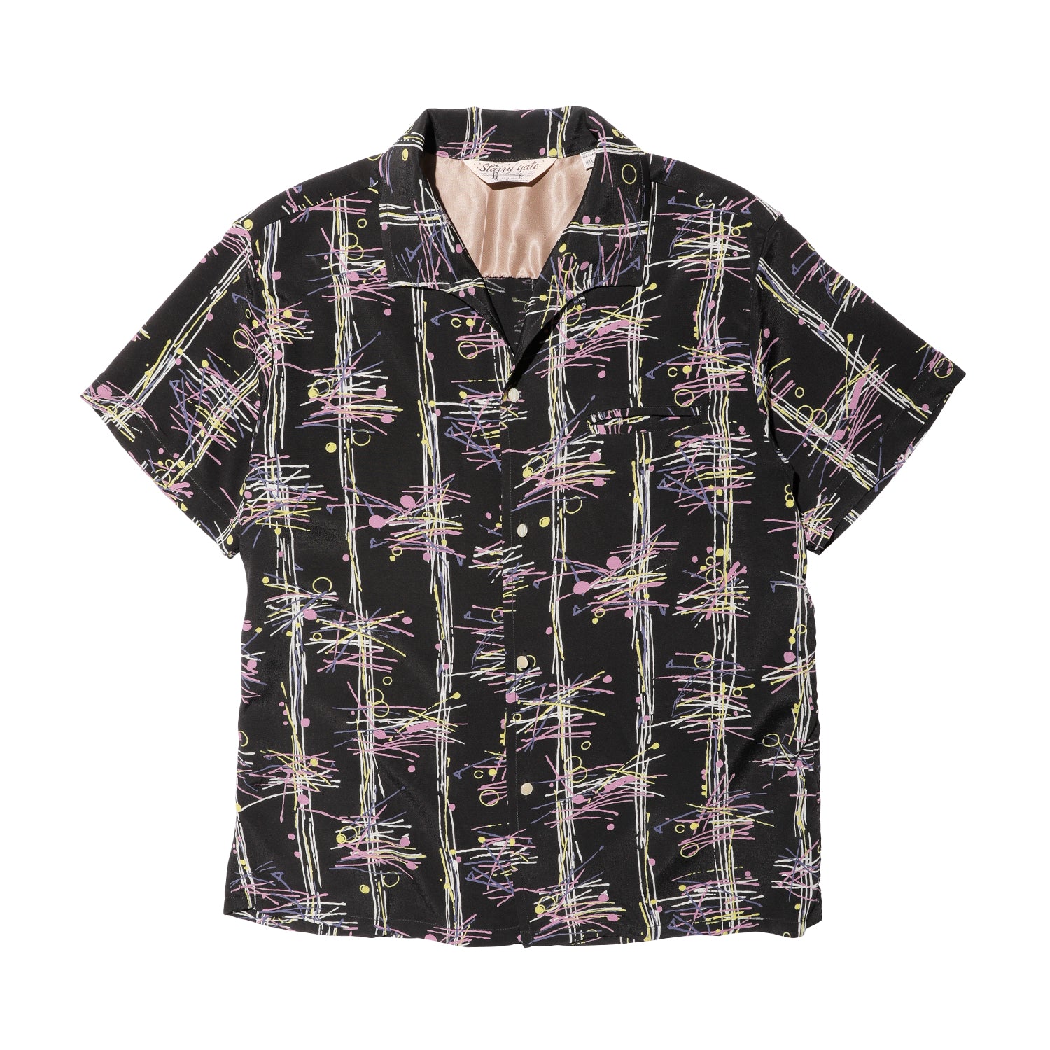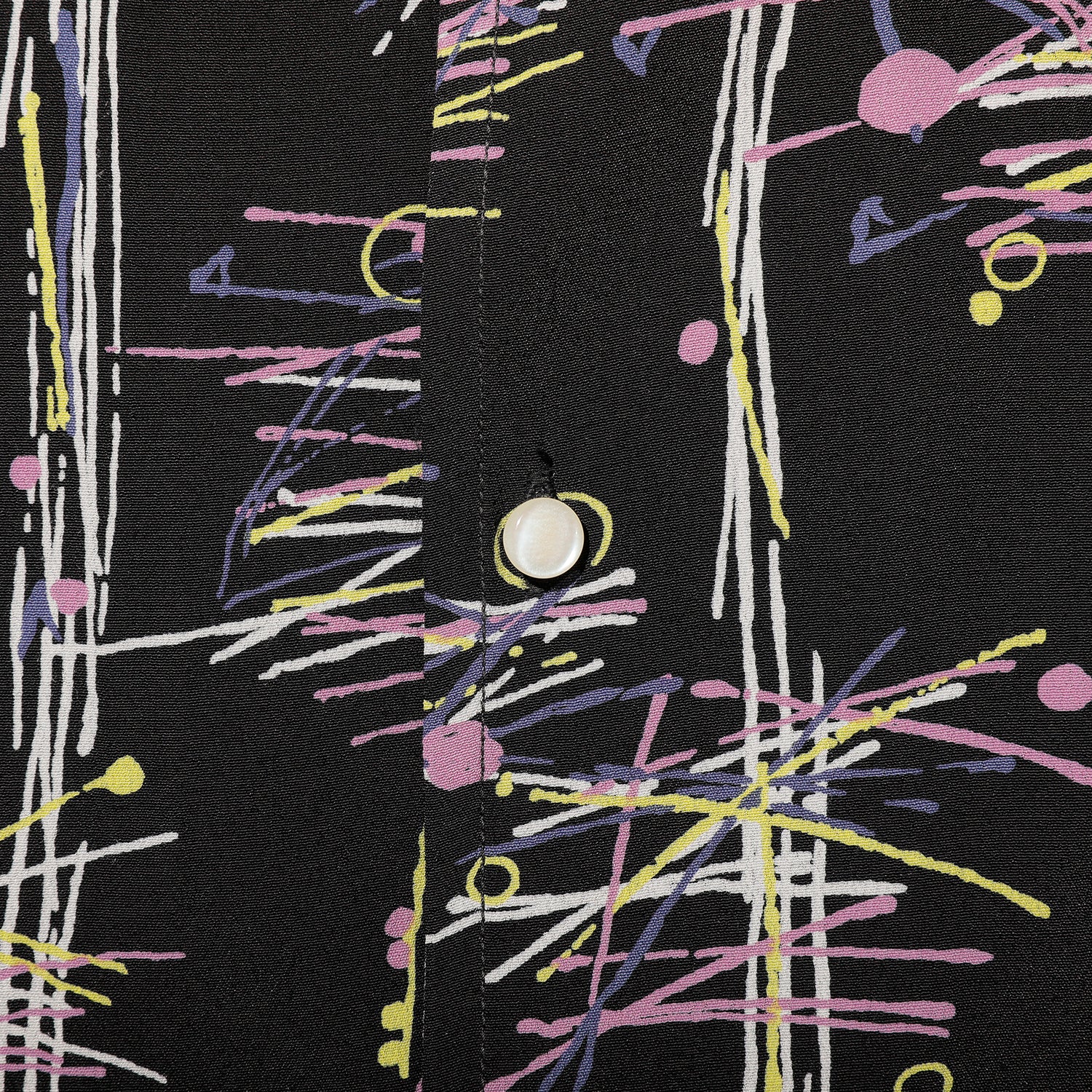 2026年のコレクションテーマは「SHIBU-KAJI」。 1980年代後半から1990年代にかけて東京・渋谷を中心に流行した渋カジをベースに、現代らしいトッピングを加えたコレクションを展開。若き頃の懐かしさを漂わせつつ、普遍的で長く愛用できるプロダクツが揃います。 今回は7年ぶりに、アトミックプリントのちりめん素材をベースに配色を刷新し、イタリアンカラーが特徴の VINCENT SHIRTS として製作しました。 生地には、福井県福井市で丁寧に織り上げられたレーヨンちりめんを採用。経糸にはフィラメントレーヨン120dを使用し、シルク調の光沢と美しいドレープ感、鮮やかな発色を実現。緯糸にはスパンレーヨン30/-を使用し、柔らかな風合いとマットな質感をプラスしています。さらに、S撚りとZ撚りの強撚糸を交互に打ち込むことで細かなシボ感を生み、程よく光沢を抑えた高級感のある表情に仕上げました。 プリントには、原反染めの後に顔料抜染を施す高度な加工方法を採用。反物を先に染め、その後柄部分を抜染して顔料プリントを重ねることで、かすれやムラが生まれ、ヴィンテージ感あふれる独特の風合いが楽しめます。裏面までしっかり染まっているため、見た目にも高級感が漂います。 ただし、この顔料抜染プリントは薬剤使用量が多く、排水処理を必要とするため国内でも生産できる工場が限られている希少な技法です。特別感のある生地を用いた渾身の一着として、渋カジスタイルを格上げするアイテムに仕上がっています。