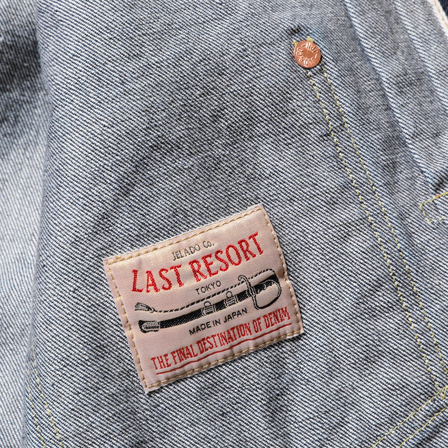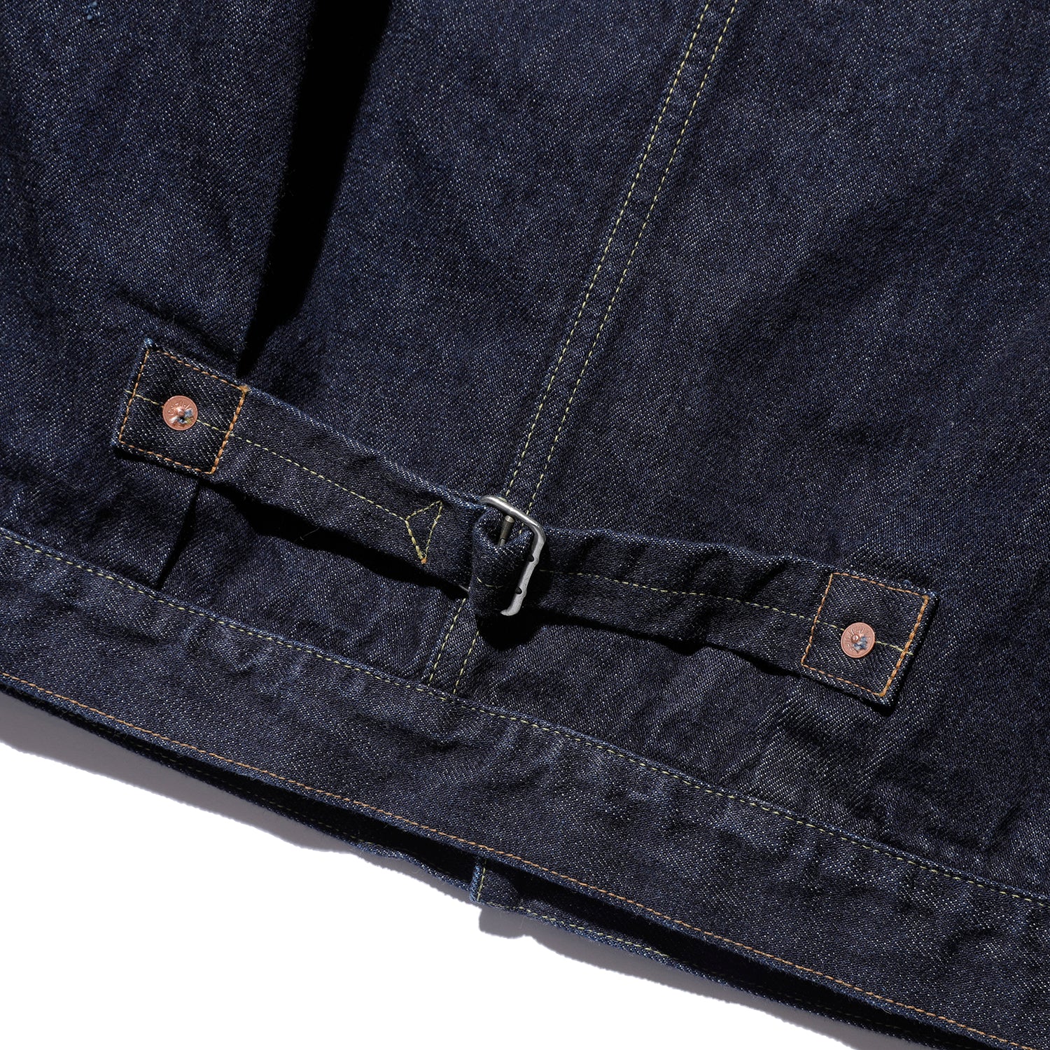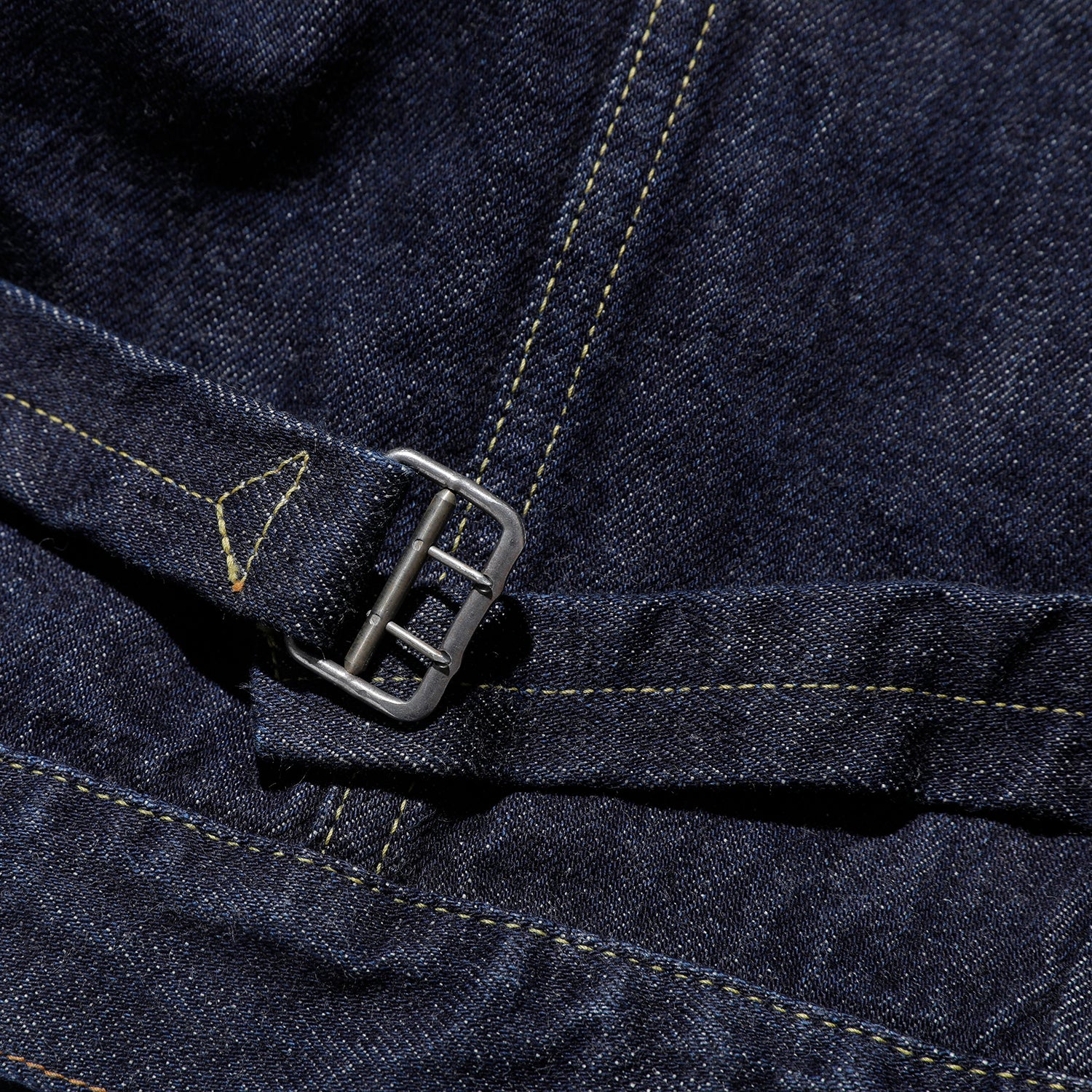 ロープ染色はデッドストックを参考に深みのあるピュアインディゴで染め上げ、TOYODA G3織機で経68本×緯47本の打ち込みを施し、しなやかで滑らかな穿き心地を実現しました。デザインは、弊社所有のS506XX初期型をベースに、当時の大戦モデルの雰囲気を忠実に再現。通常ラインで使用される刻印入りの付属を再現し、ポケットにはフラップを付けず、シンプルな1stモデルの仕様を踏襲しています。30年代から使用されていたリベットの在庫をそのまま流用したという設定のもと、「JELADO Co」の"o"を小文字にした特注リベットを製作。尾錠も30年代のバックルを型から再現し、鉄製で仕上げました。