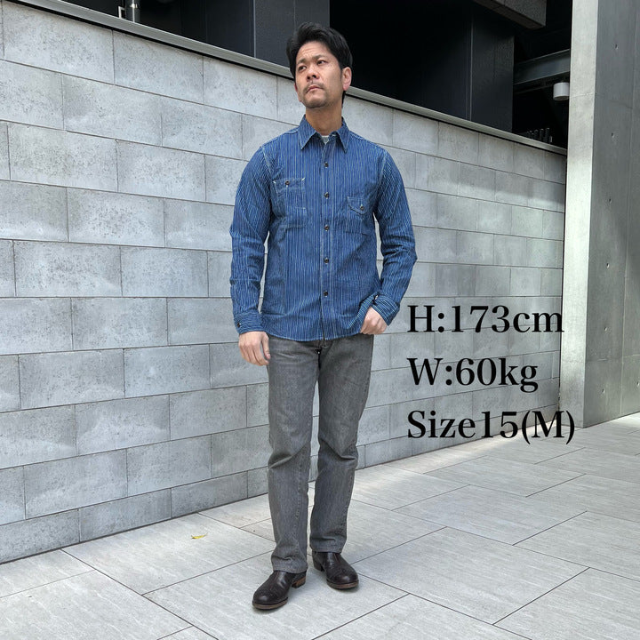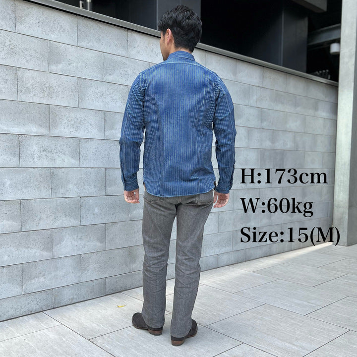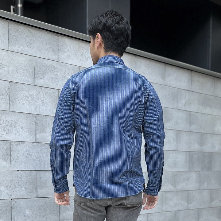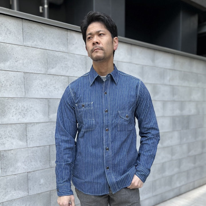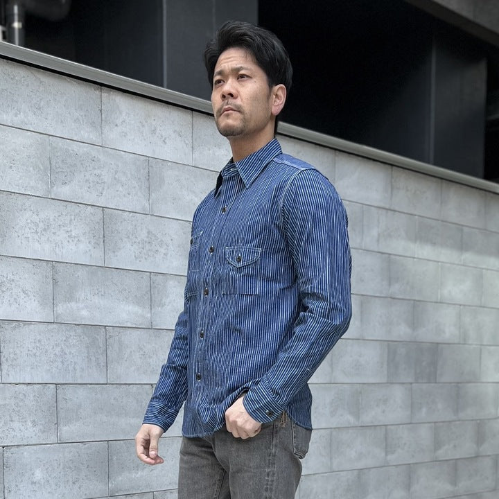 JELADOの定番として展開する「SMOKERS SHIRTS」を、先染めのインディゴストライプの素材を使って生産致しました。このシャツは、1930年代の「BIG YANK」のガチャポケシャツをベースにデザインされています。フロント部分にはヴィンテージ特有