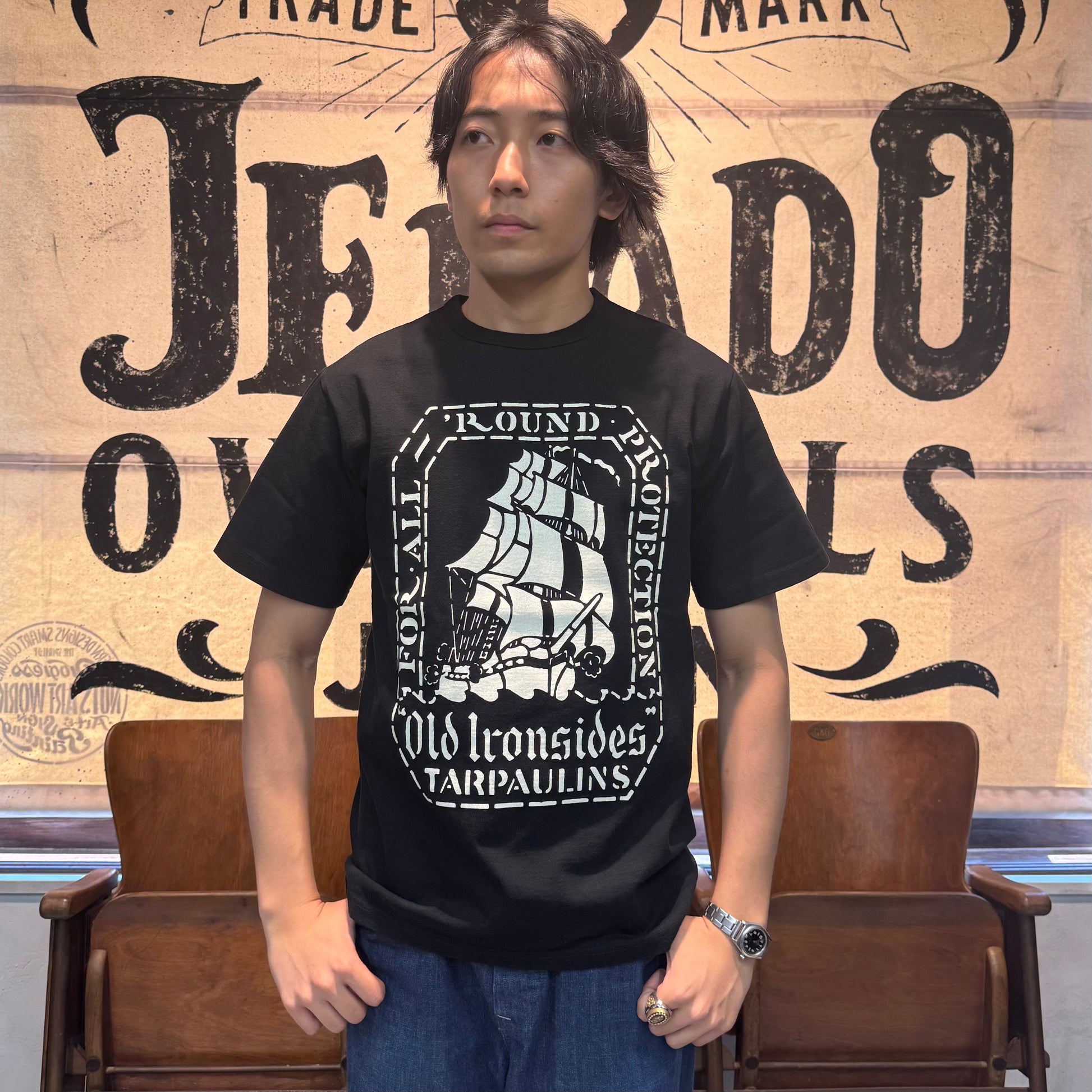 BASIC COLLECTIONより、「TARPAULINS TEE」がリリースされました。このTシャツのプリントデザインは、1928年頃のニューヨークで誕生したボート用防水シートメーカーのロゴを再現したものです。黒ボディには水性ラバープリント、ホワイトボディには染み込みプリントを採用し、それぞれ異なる風合いをお楽しみいただけます。ボディは新たにリニューアルされ、和歌山県で編み立てられた14/-の丸胴ボディを使用。38サイズから46サイズまでの全5サイズ展開となっています。特に46サイズの丸胴編みは、対応可能な工場が少なく、希少性の高いアイテムです。ニッター(編み手)さんの協力のもと、このサイズを復活させました。使用した14番の糸は空紡糸を使い、乾いた質感で程よい肉感のボディに編みたてています。生地の状態で染めることで深みのある色に染めあがります。縫製に綿糸を使用し、自然な仕上がりを実現。首部分はバインダー仕様で、伸びにくく、長時間着用しても快適なフィット感が持続します。比較的大判のプリントが印象的で、インパクトのあるデザインが特徴の一枚です。ぜひ、この「TARPAULINS TEE」をお試しください。