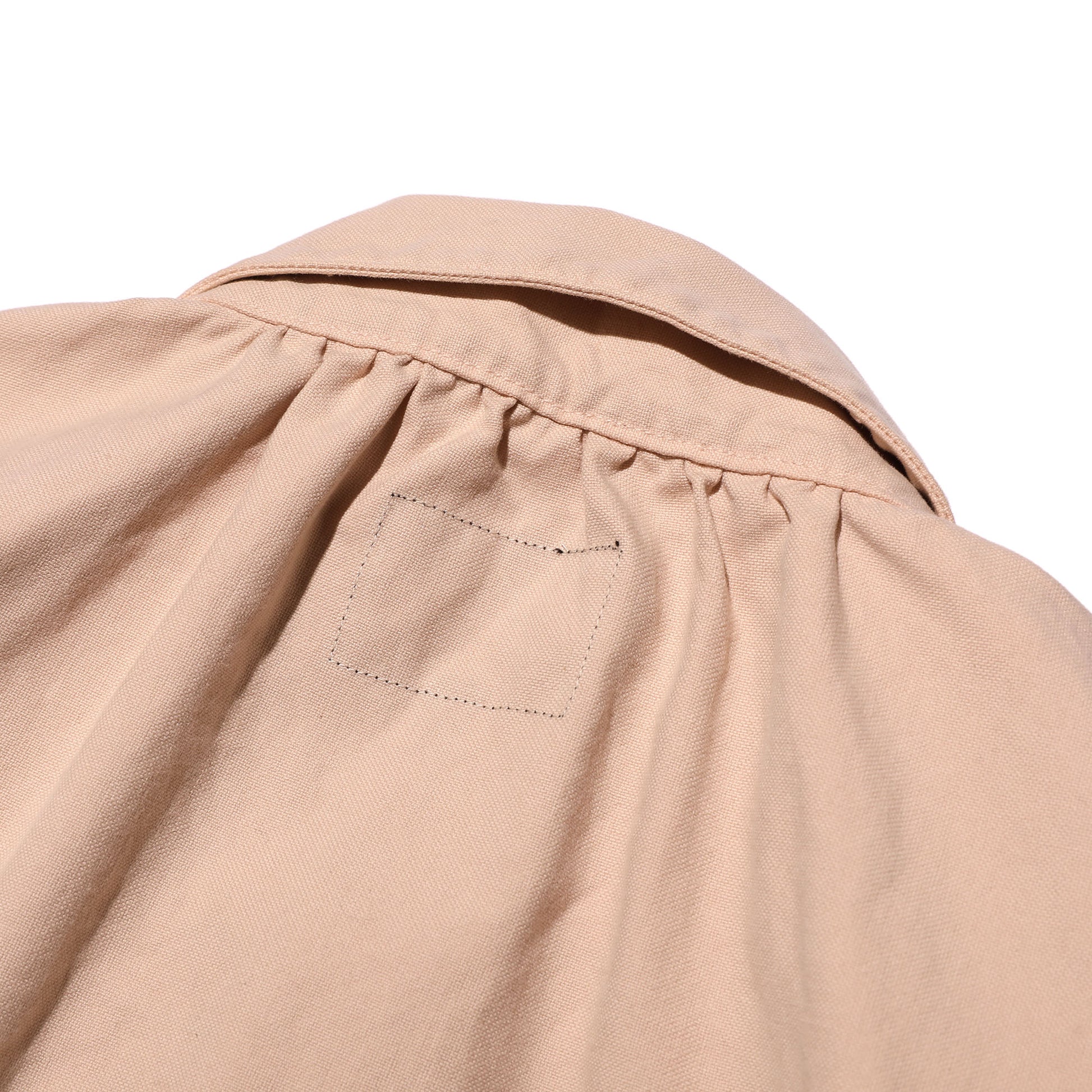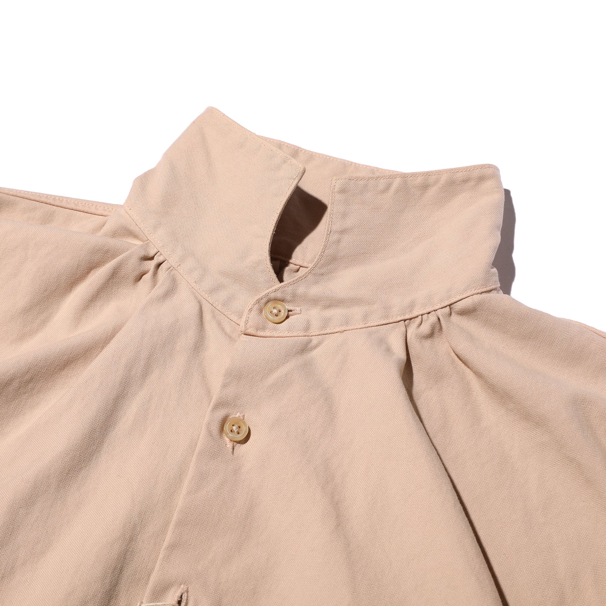 襟元のギャザーなど古い時代のディテールに、角度をつけて肩から袖口にテーパーをかけた袖、ゆったりしながらも体に沿う身頃など、現代では普通となったつくりをミックスさせています。胸元に柔らかなドレープを持たせながらも、スマートに着ることができるシャツとなりました。