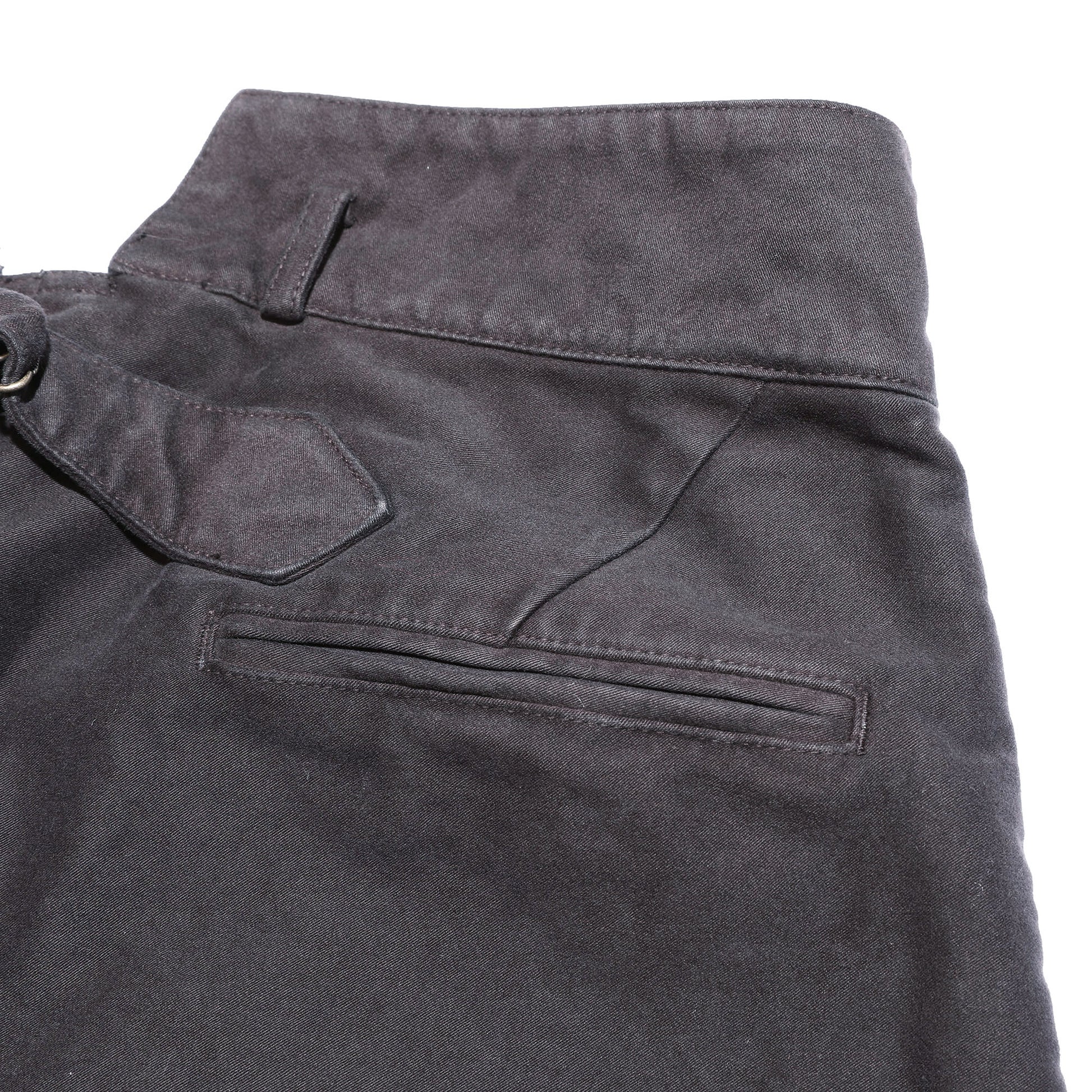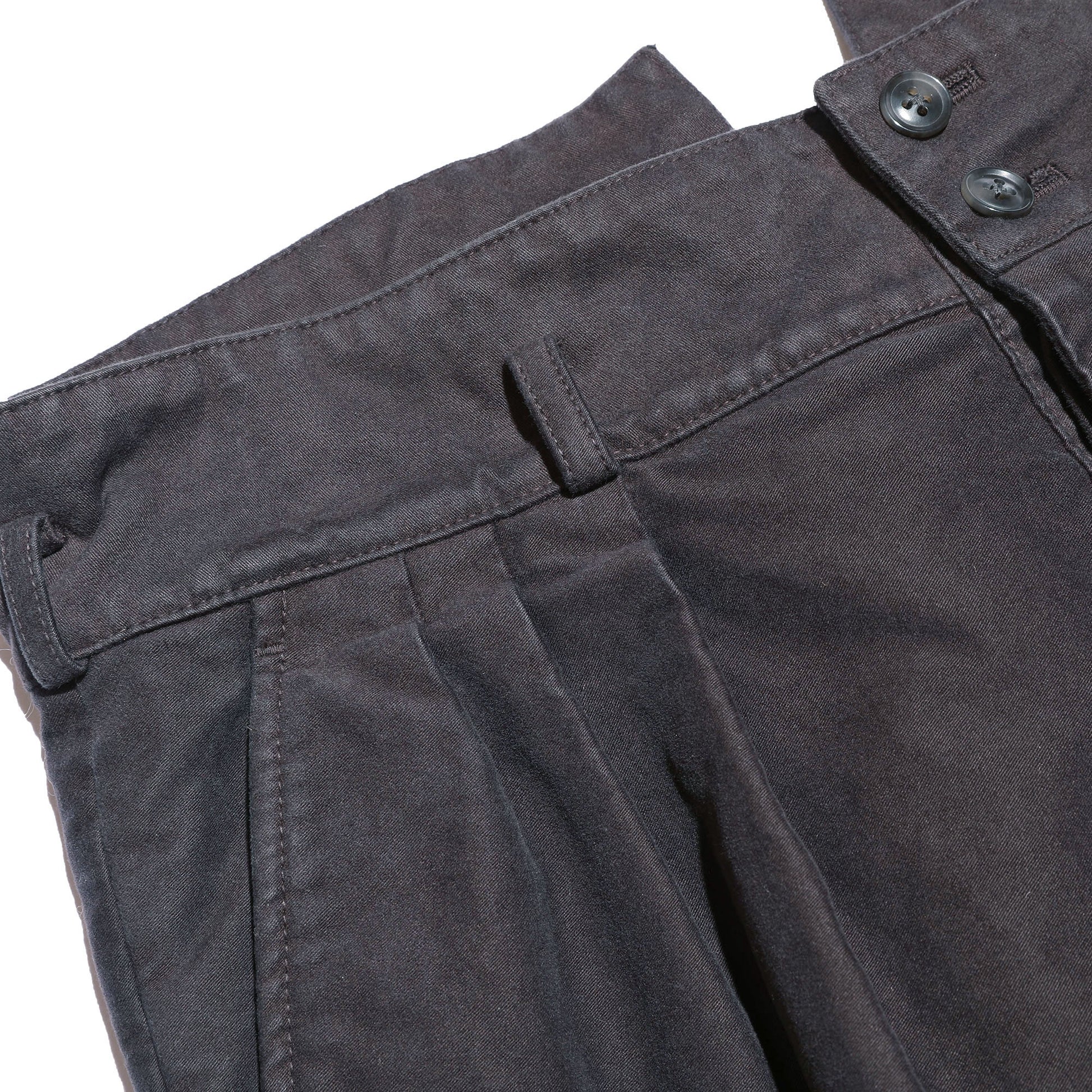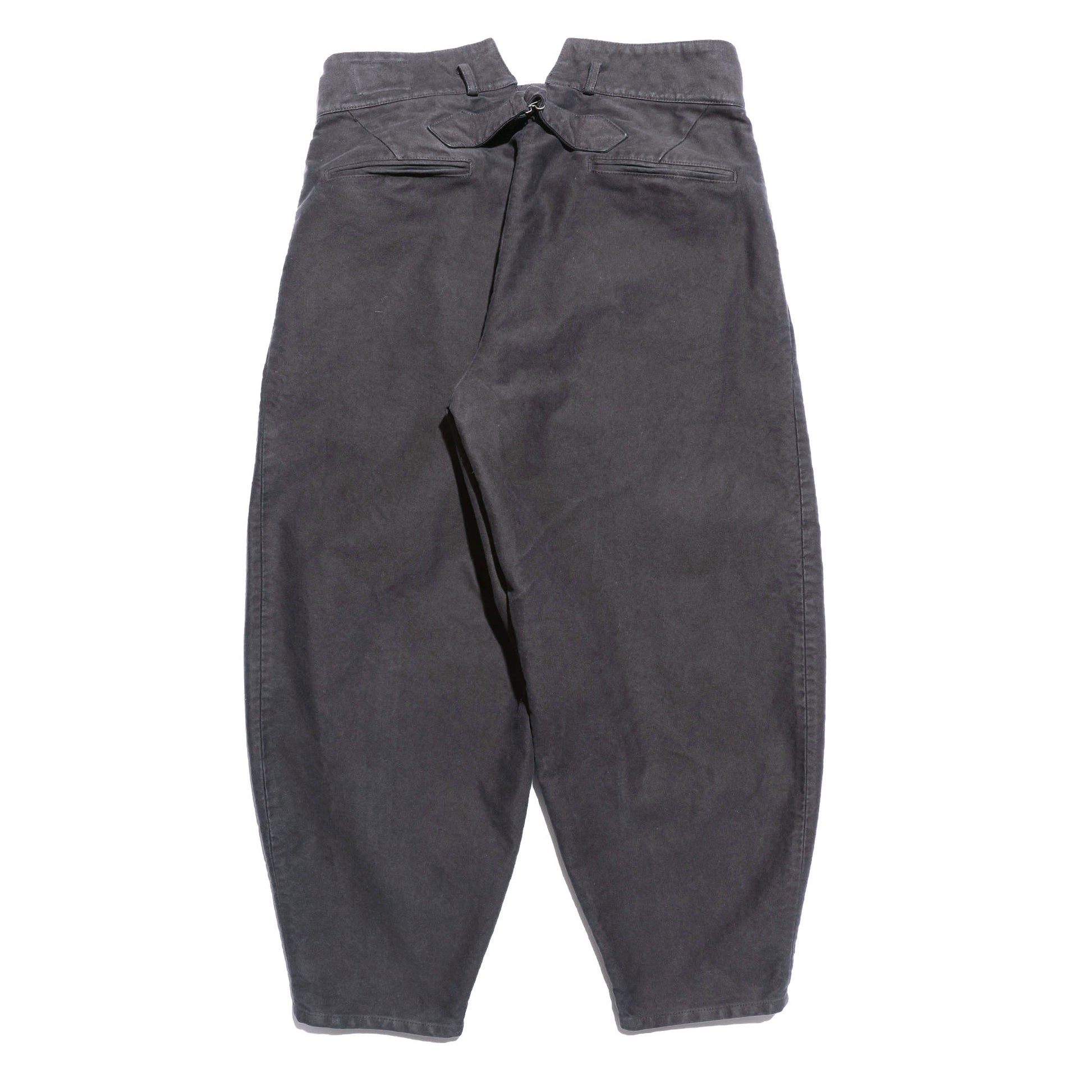 す。このような写真に登場するパンツをイメージ源としてデザインしたのが The 2 Monkeys のドガーランドパンツです。3タックのゆったりした腰と極太のワタリから降りるワイドなシルエットを裾で強く絞った短い丈のバルーンパンツとしました。サスペンターボタンが付く太い腰帯に、細いベルトループをトップラインからオフセットさせて付けつけることで、ベルトをしても腰のトップラインが隠れず、クラシックな雰囲気で穿けるパンツです。