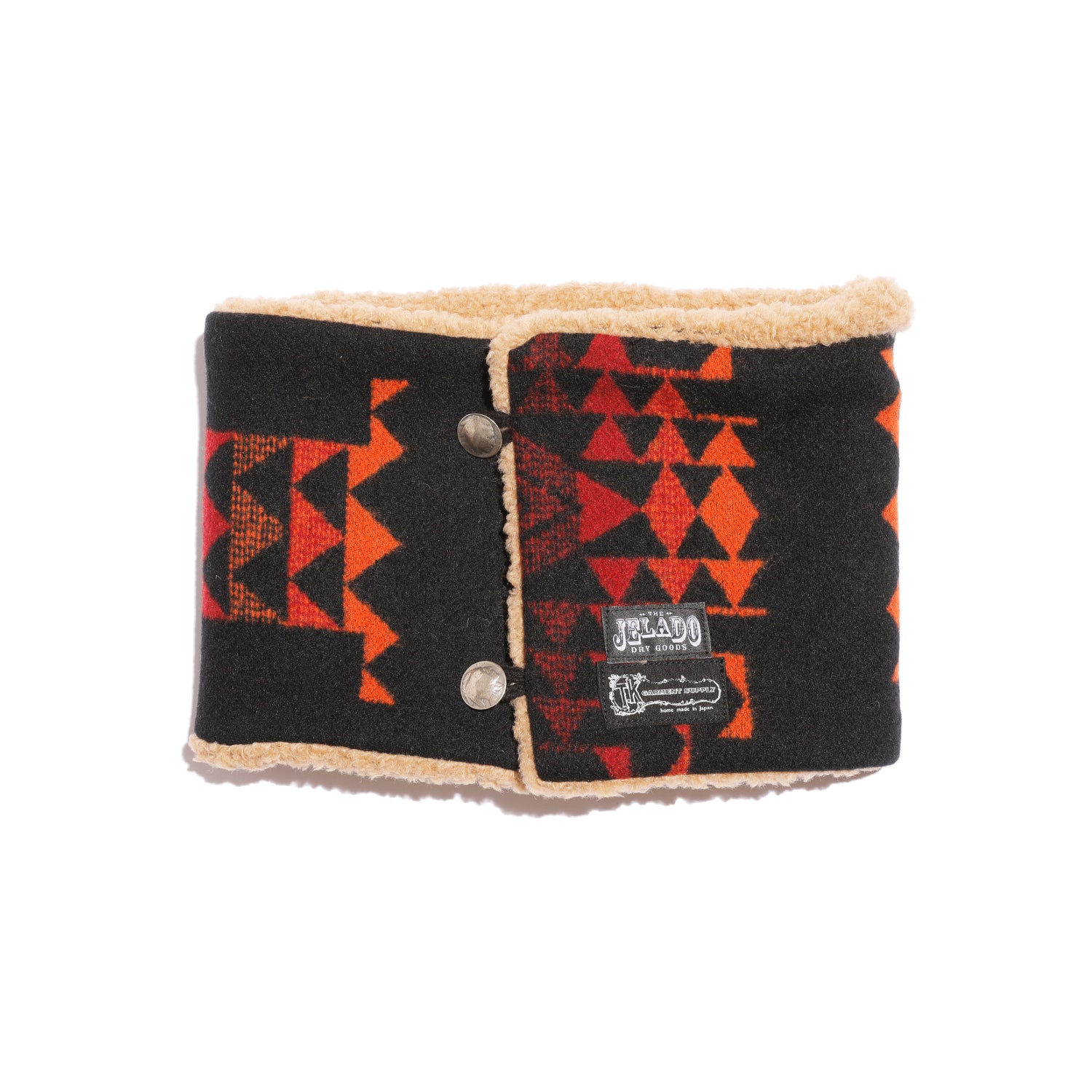 表地にはJELADOが過去にリリースした希少なヴィンテージ・ブランケット柄のウール素材を贅沢に使用。往年のネイティブデザインを現代の感性で再構築し、新たな息吹を吹き込んだ。内側には毛足の長いフリースを配し、厳しい寒さから首を守る「Guard」の名に相応しい圧倒的な保温性を誇る。