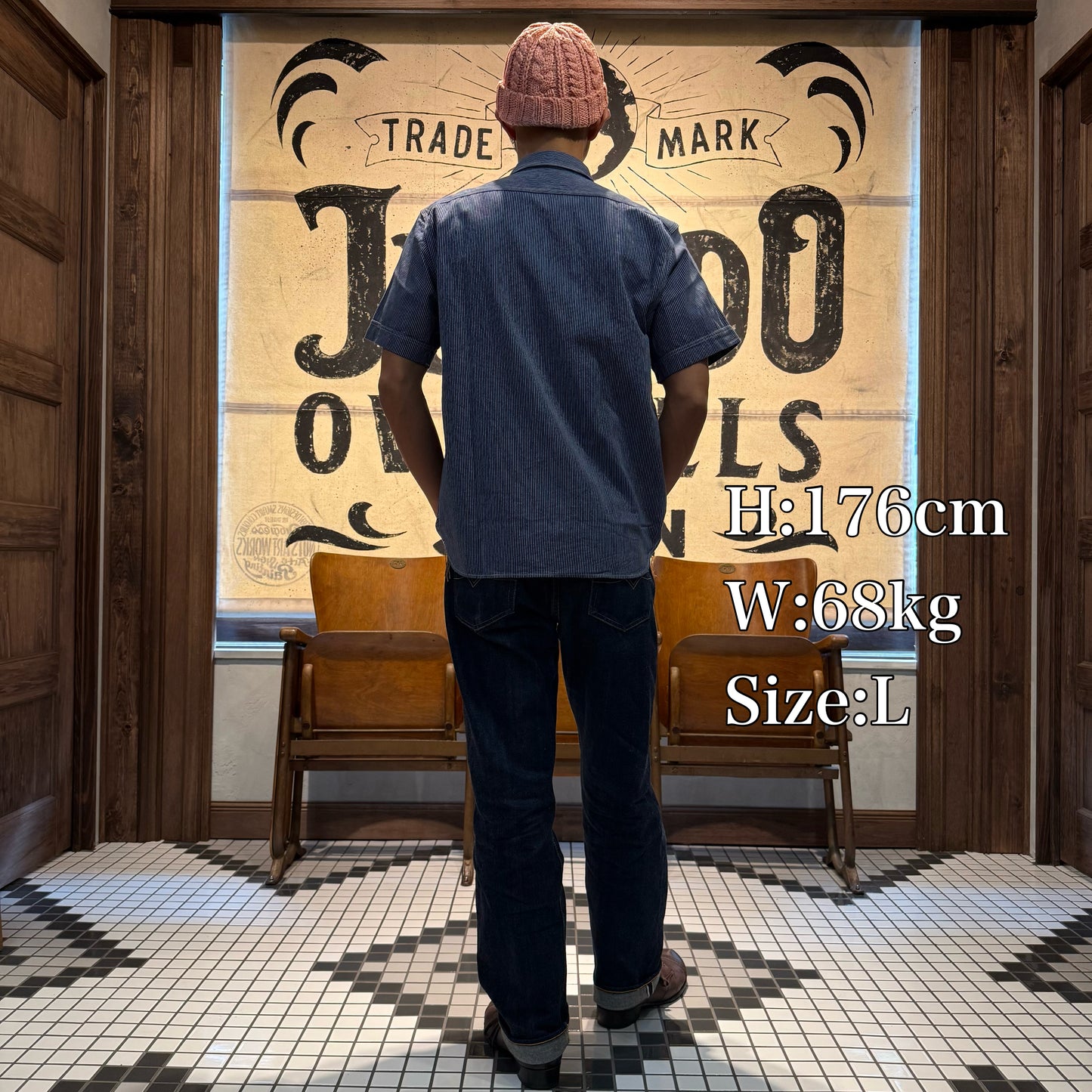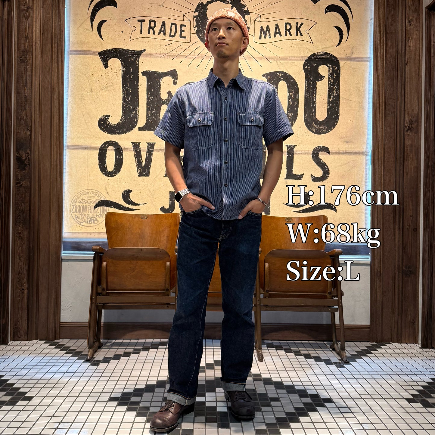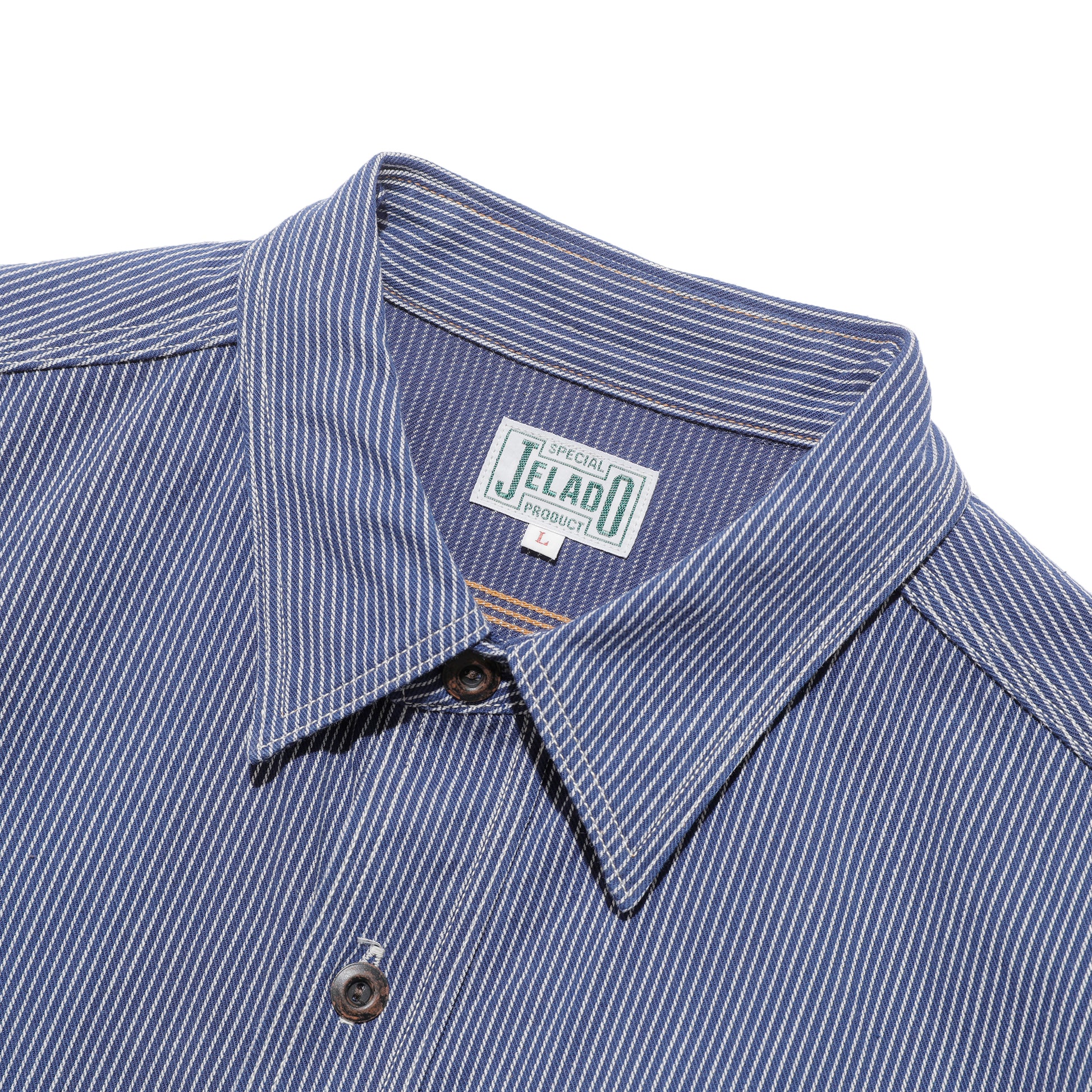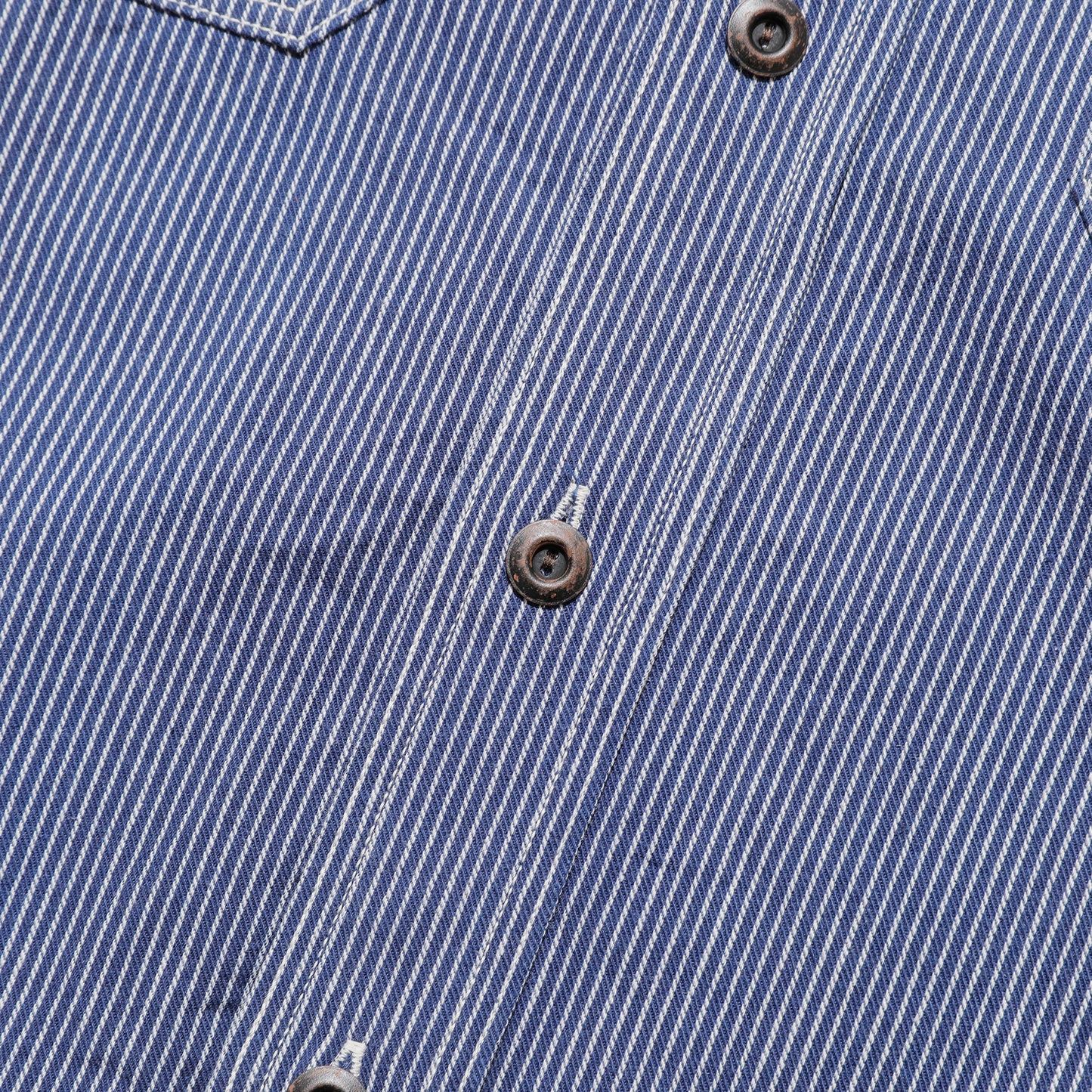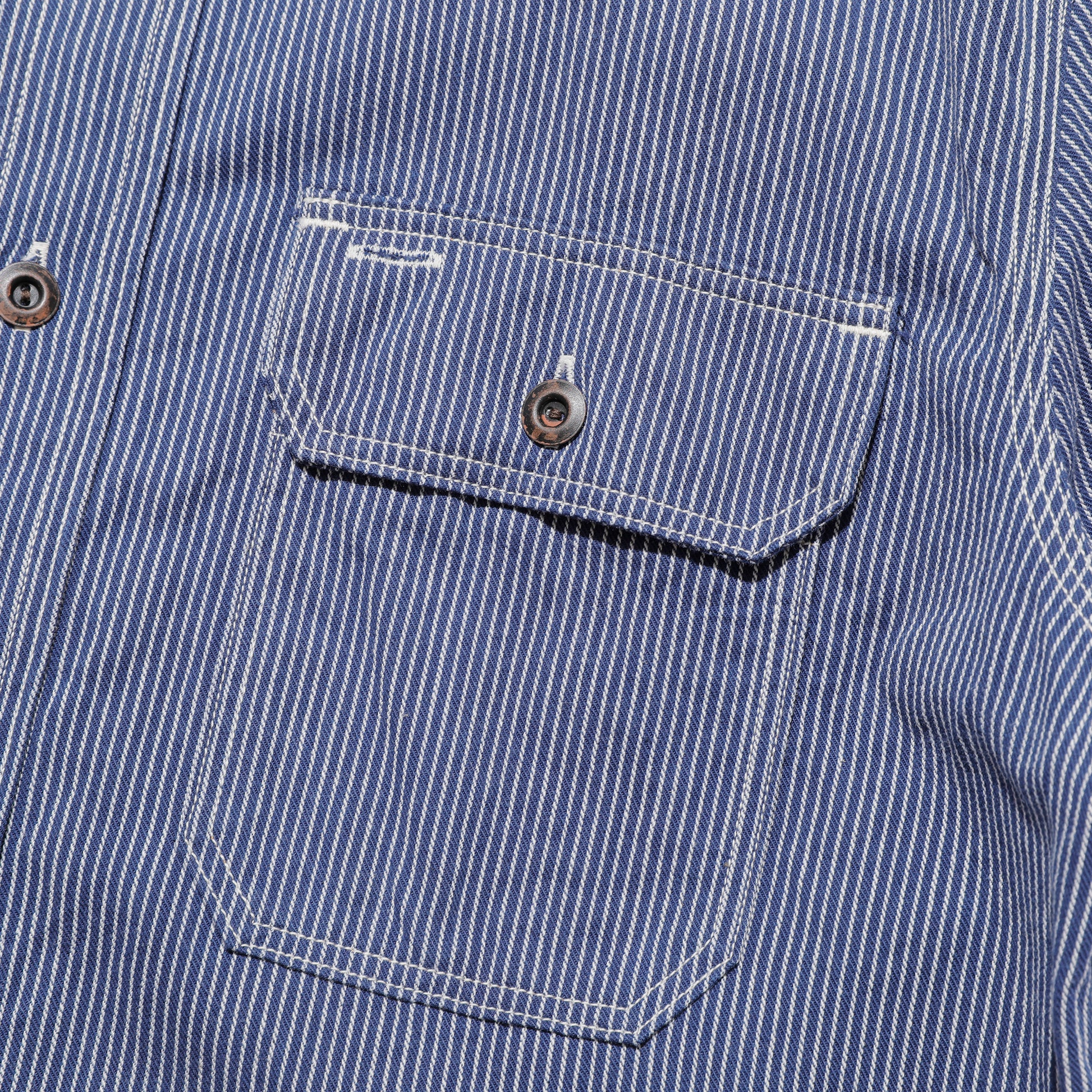 素材は着込んでいくごとに経年変化が楽しめる6.5オンスの耳付きのインディゴストライプの生地を使用しております。