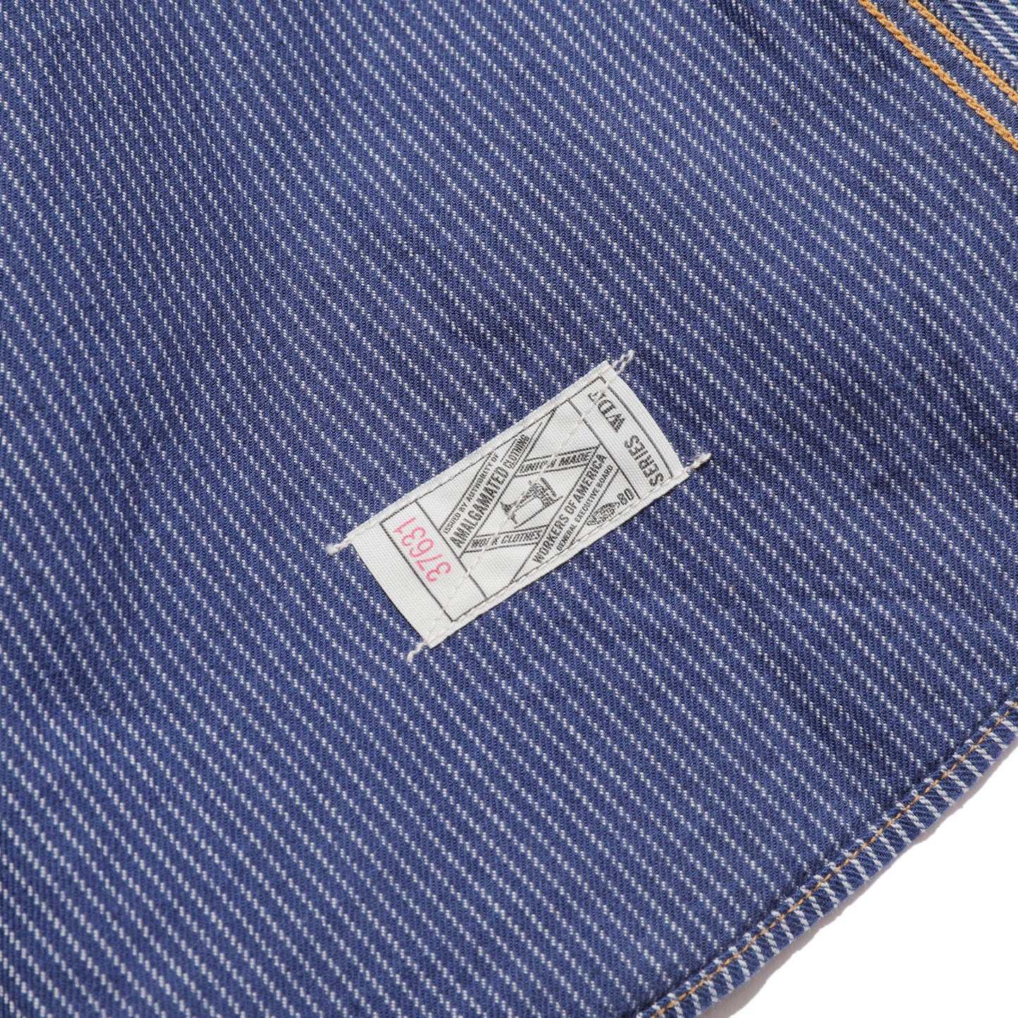 襟はダブルステッチ、身頃の縫製はトリプルステッチ、身頃両サイドはマチ付き、左前身頃裾裏にユニオンチケットを縫い付けました。